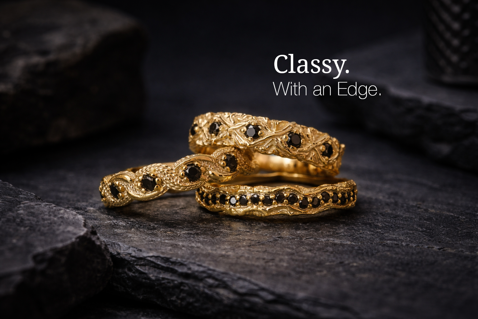 Crafted in solid gold and set with natural black diamonds, these rings are defined by texture, movement, and quiet strength. Designed for presence—not noise—they bring a refined edge to everyday wear.