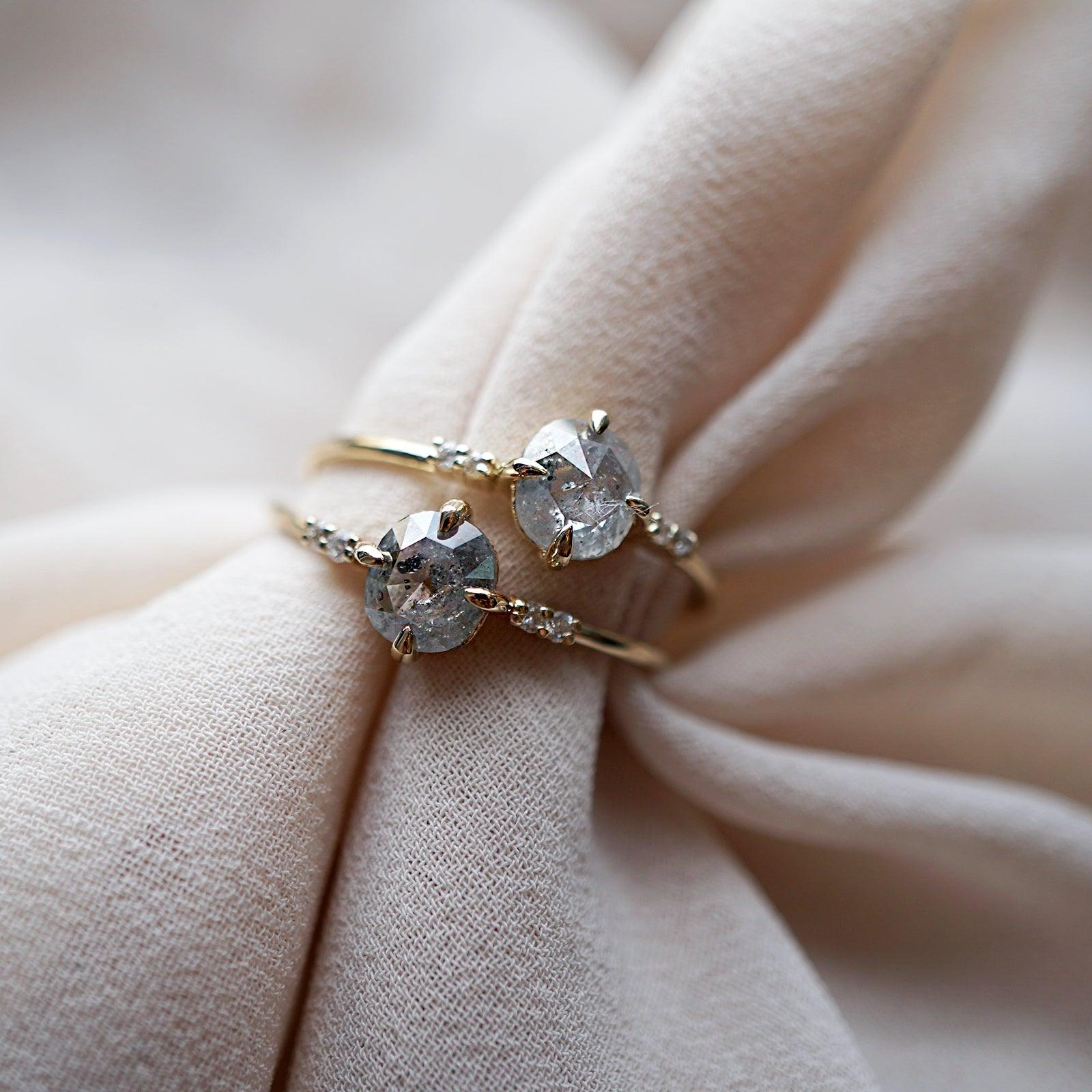 Our latest piece is the "Midnight Salt & Pepper Diamond Ring". Featuring a beautiful, elegantly rounded rectangle salt and pepper diamond. Set in a buttery 14K solid gold band. You can almost see the whole galaxy in this ring.