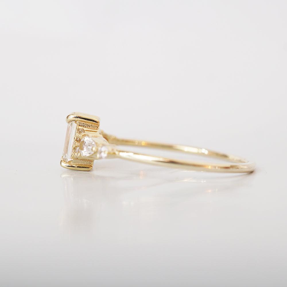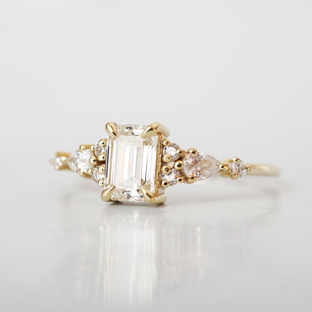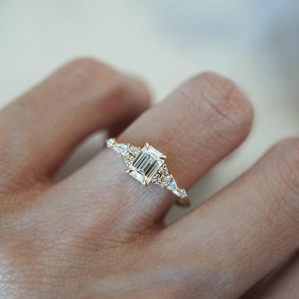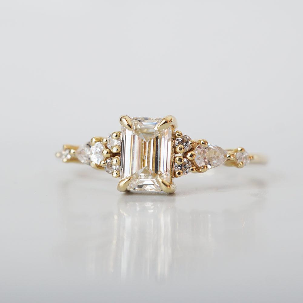 As romantic as the roads of Paris, this ring features a beautiful emerald-cut natural diamond hugged by two pear diamonds and round diamonds. A dainty classy ring for an engagement or to mark a special occasion. Available in 14K yellow gold, rose gold and white gold.