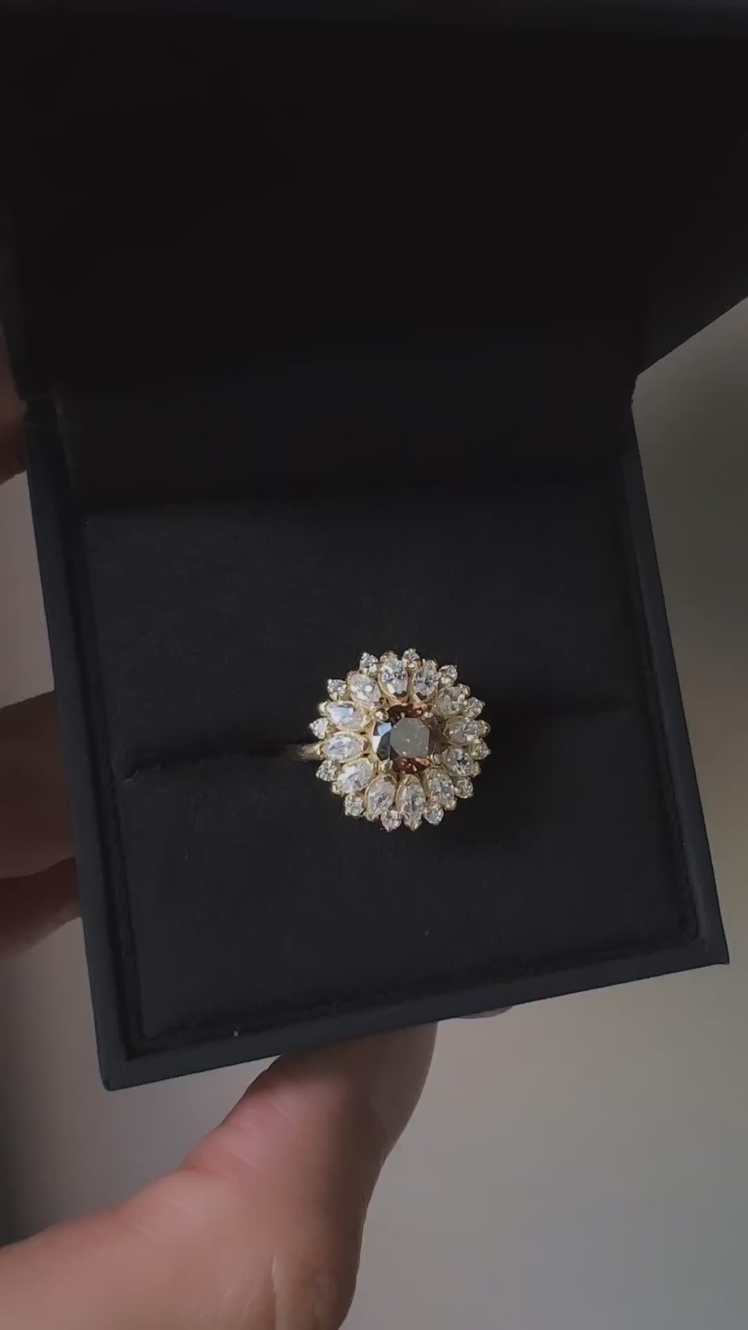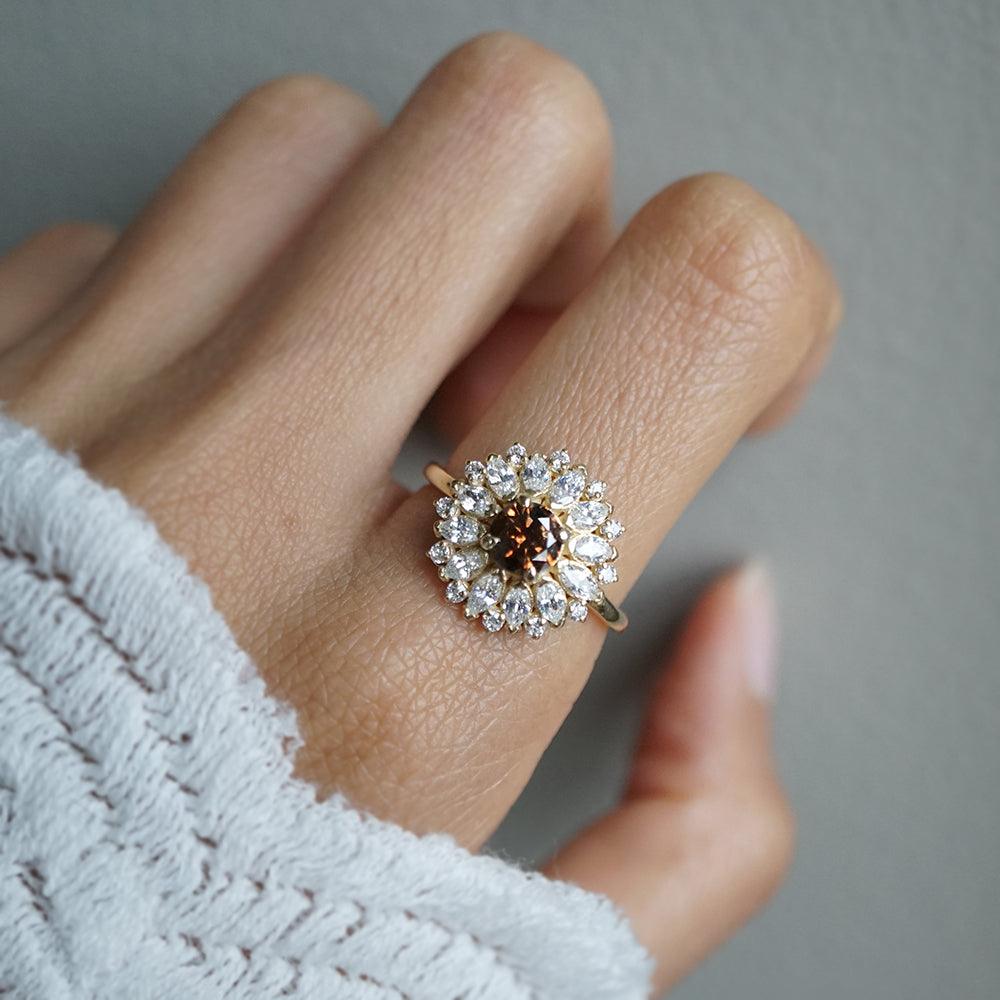 The "Dandelion Champagne Diamond" ring features a rare dark champagne diamond. Its color makes for a jaw-dropping engagement & ceremonial ring. Surrounded by 12 natural marquise diamonds halos and round white diamonds, creating this stunning dream ring. Handcrafted in your choice of 14K or 18K solid yellow gold, white gold, and rose gold. The champagne diamond shown in the photos is the exact one you'll receive.
