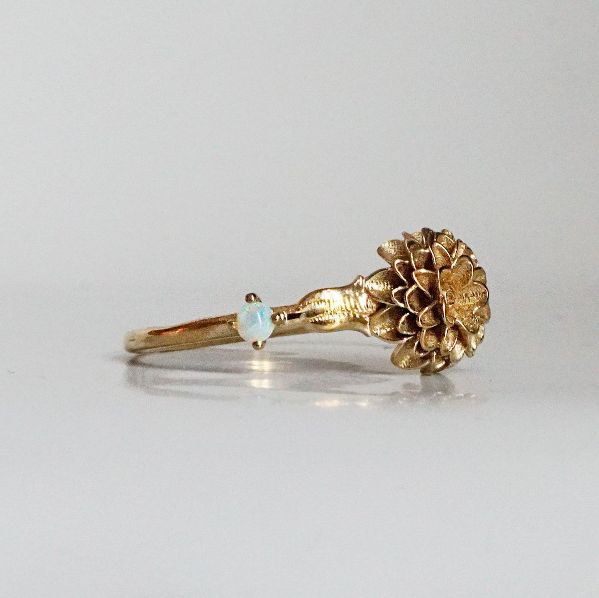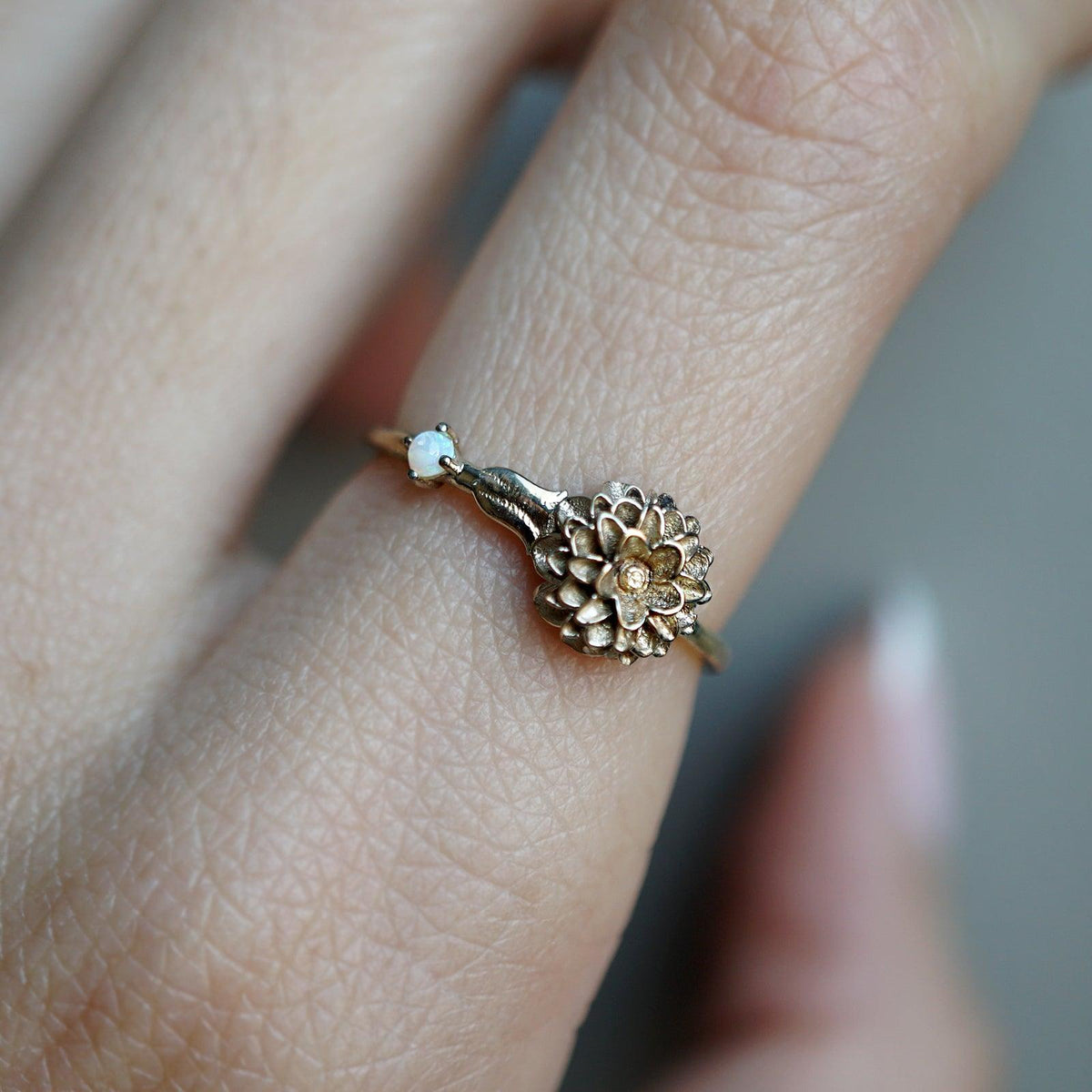 Our special collection of birth flower rings are inspired by the love of wearing something meaningful. Each birth flower is adorned with that month's birthstone. October's birth flower is Marigold and the birthstone is opal.
