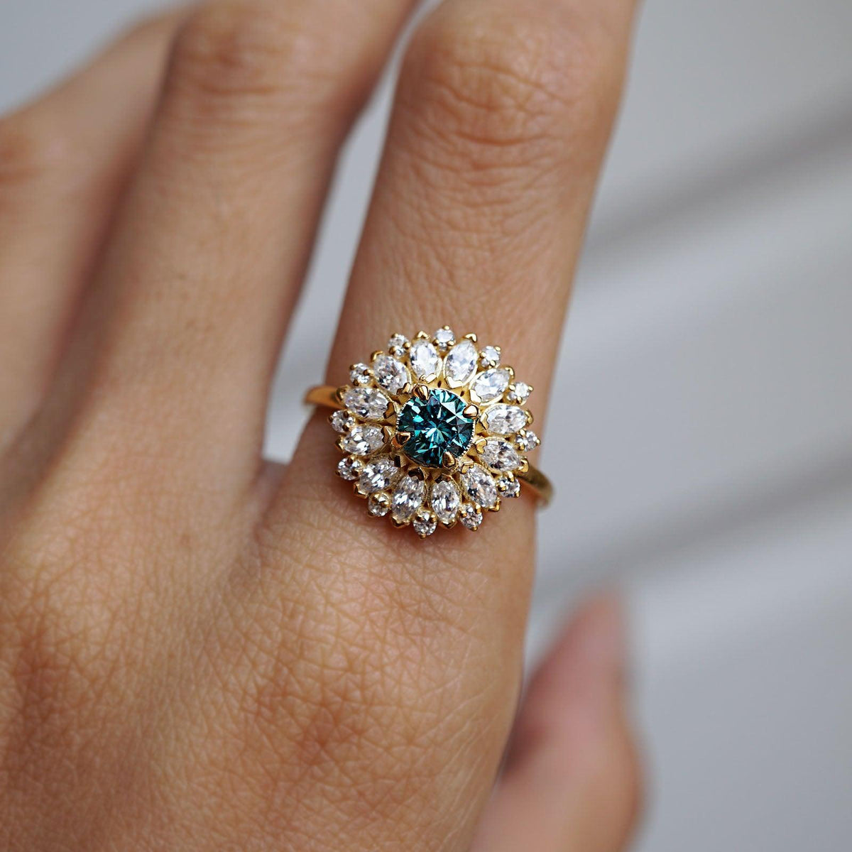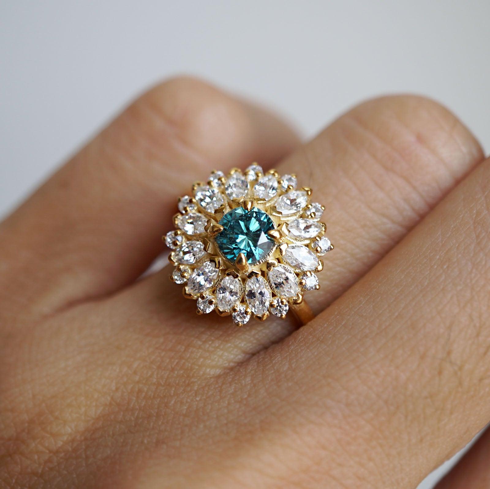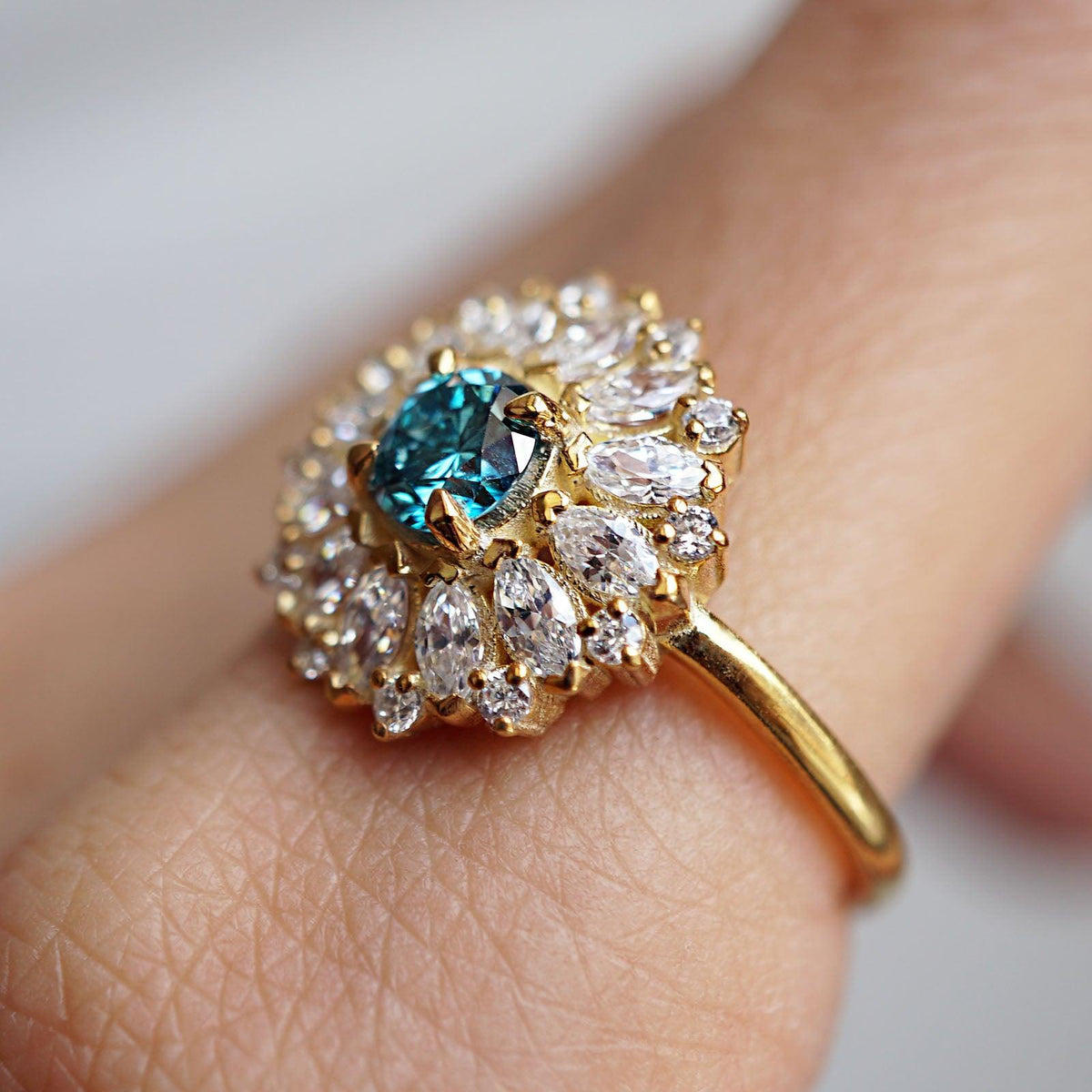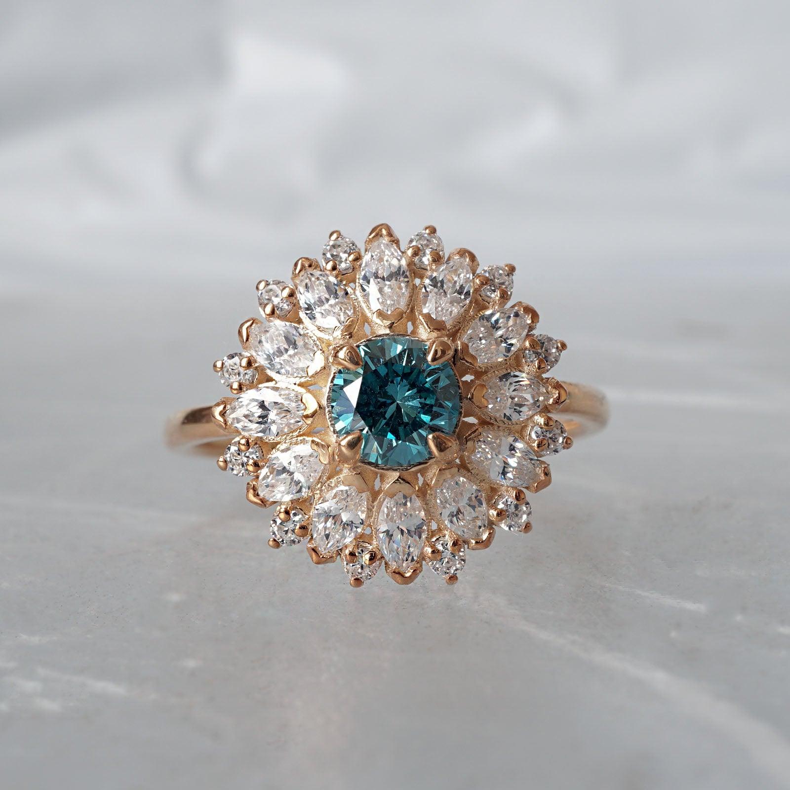 The "Dandelion Blue Diamond" ring features a rare teal blue diamond. Its vibrant color makes for a jaw-dropping engagement & ceremonial ring. Surrounded by 12 natural marquise diamonds halos and round white diamonds, creating this stunning dream ring. Handcrafted in 14K solid yellow gold, white gold, and rose gold. The blue diamond shown in the photos is the exact one you'll receive.