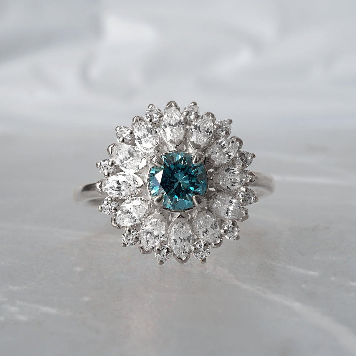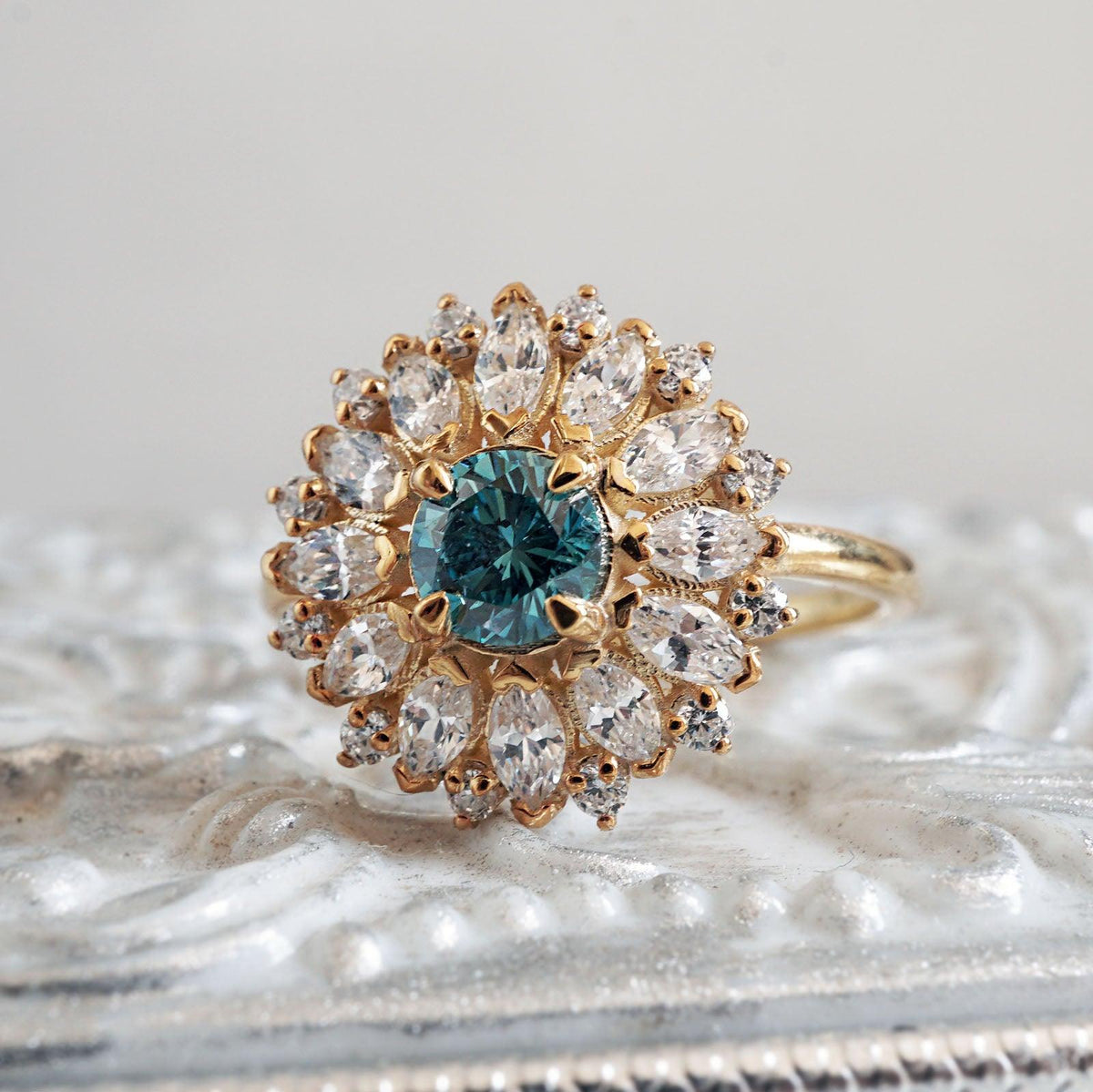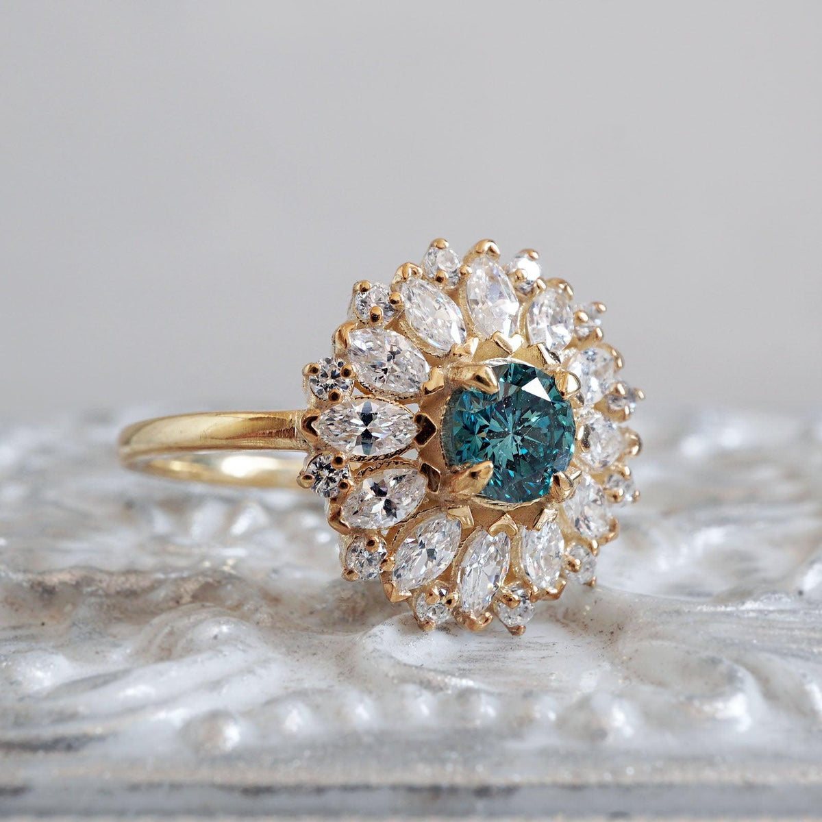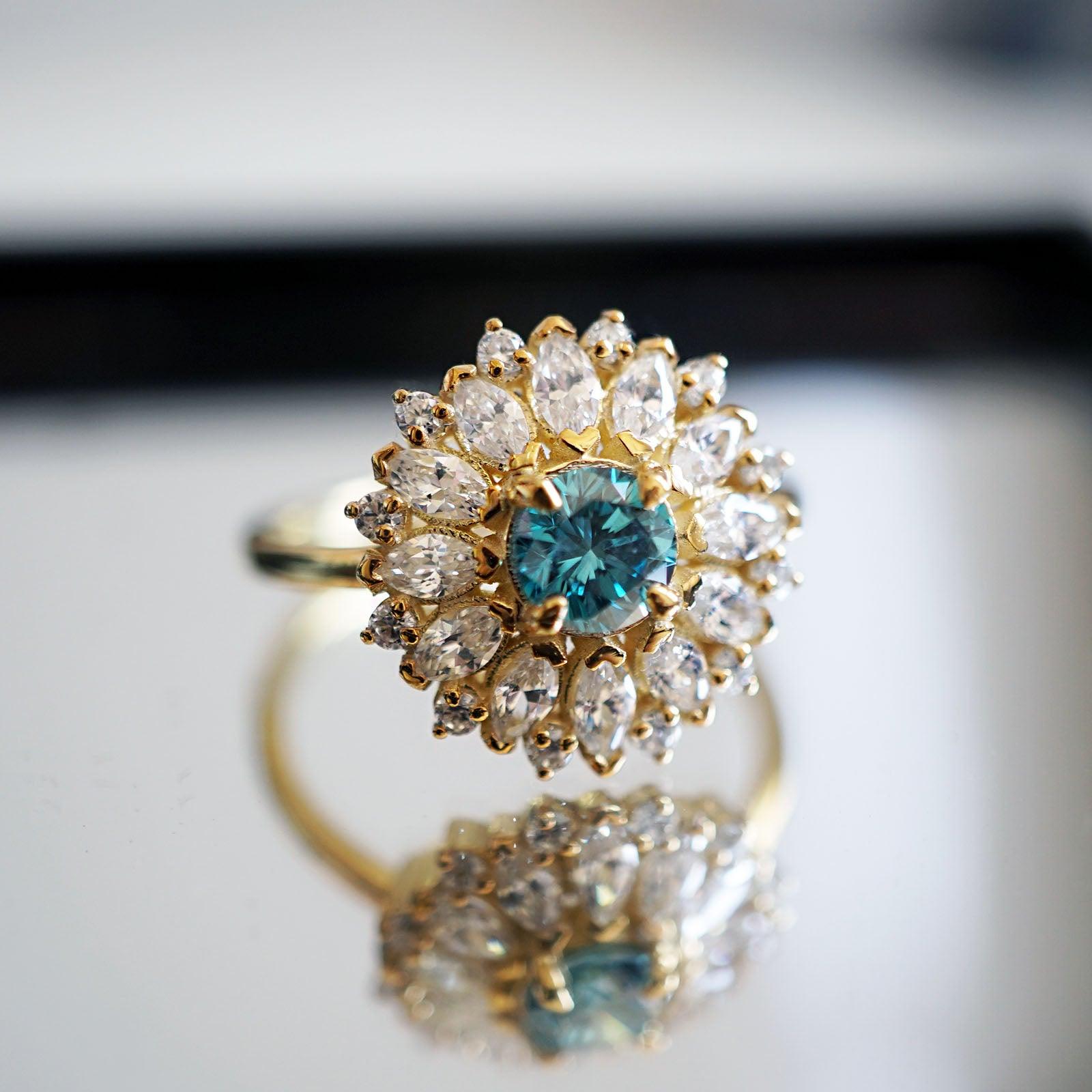 The "Dandelion Blue Diamond" ring features a rare teal blue diamond. Its vibrant color makes for a jaw-dropping engagement & ceremonial ring. Surrounded by 12 natural marquise diamonds halos and round white diamonds, creating this stunning dream ring. Handcrafted in 14K solid yellow gold, white gold, and rose gold. The blue diamond shown in the photos is the exact one you'll receive.