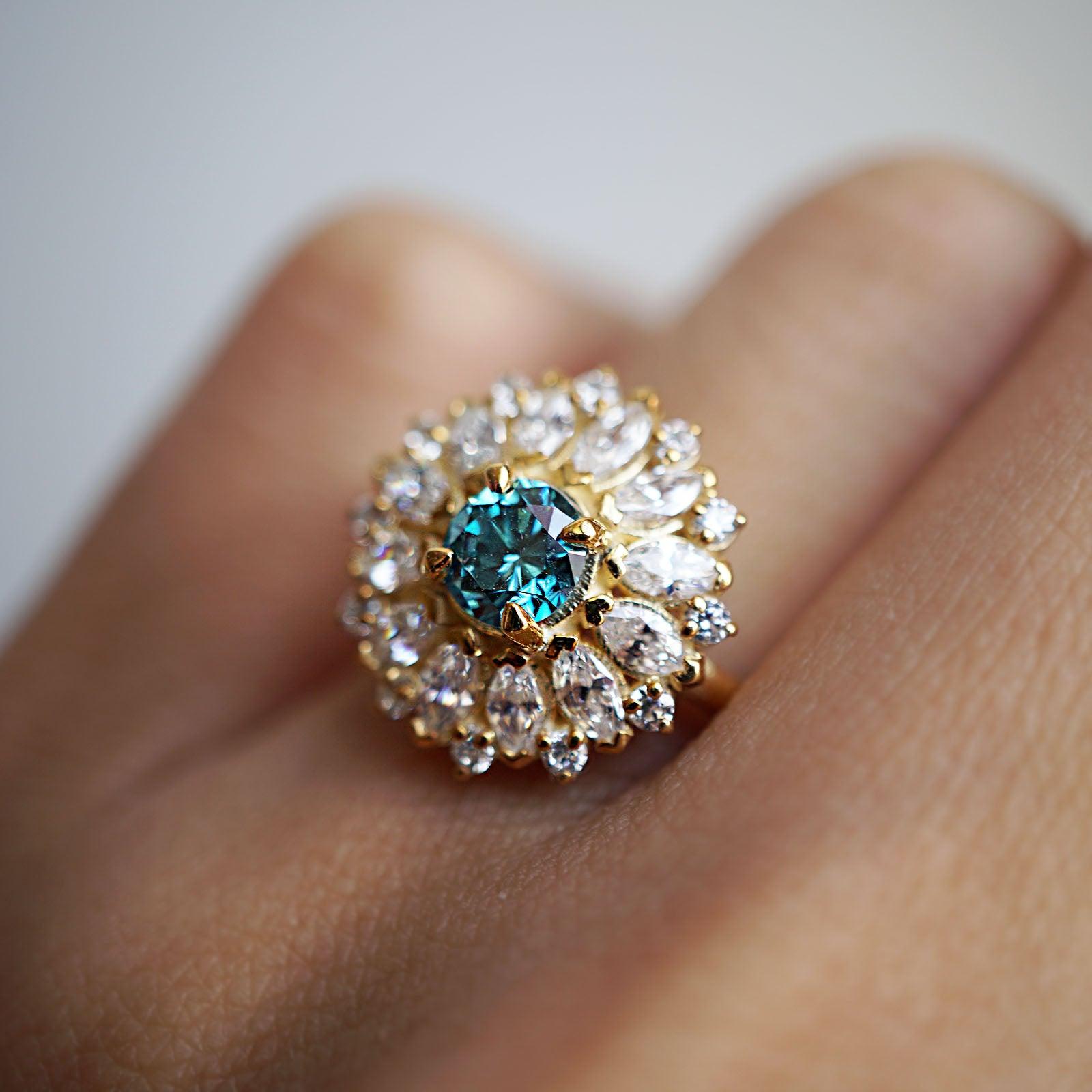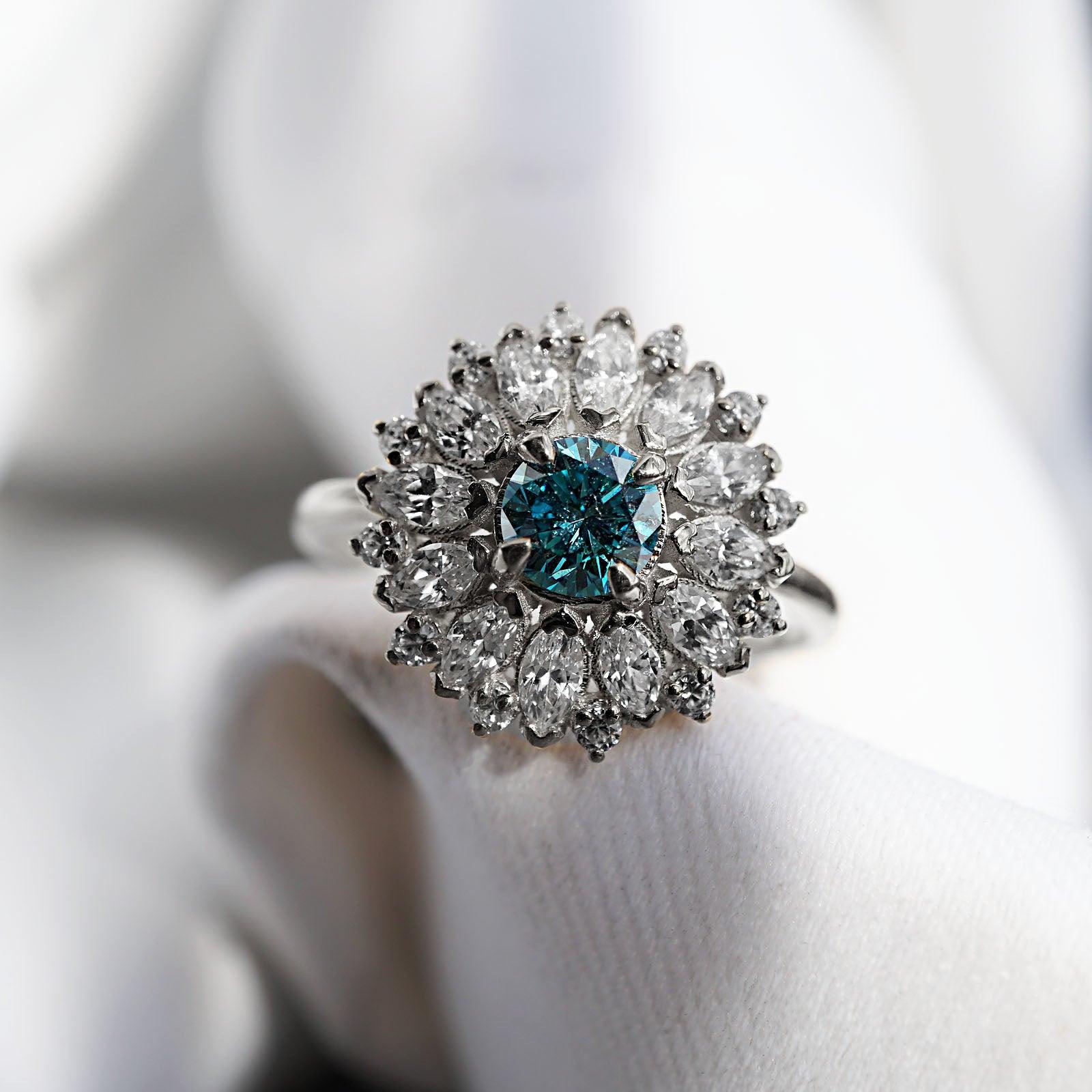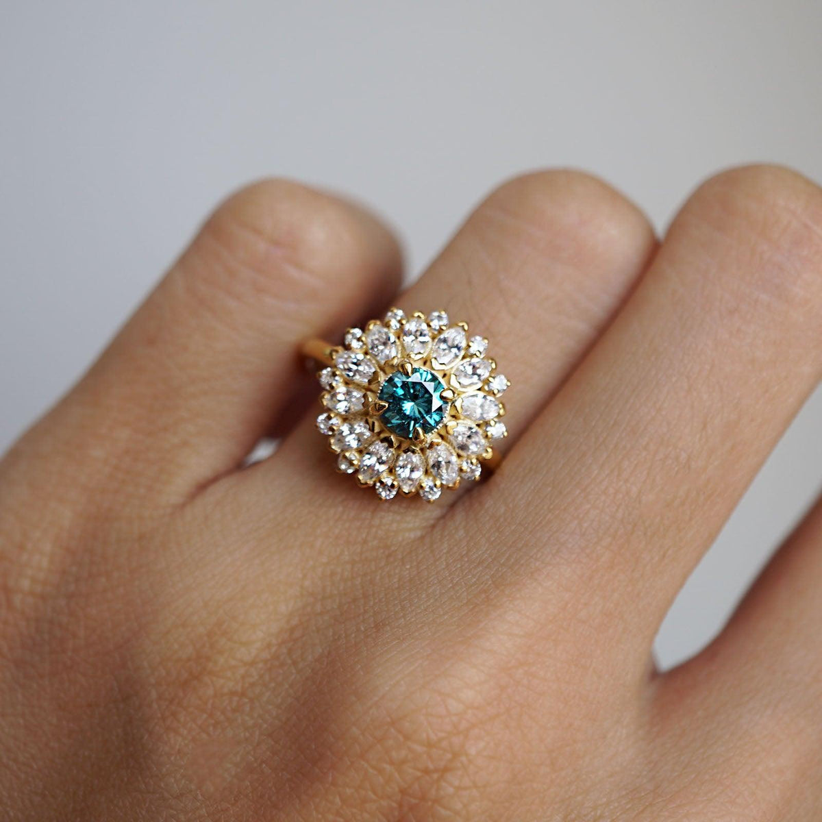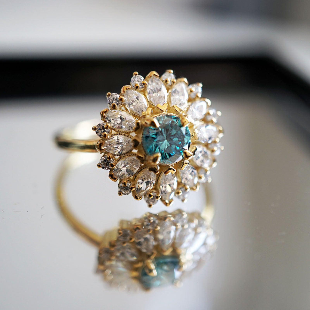The "Dandelion Blue Diamond" ring features a rare teal blue diamond. Its vibrant color makes for a jaw-dropping engagement & ceremonial ring. Surrounded by 12 natural marquise diamonds halos and round white diamonds, creating this stunning dream ring. Handcrafted in 14K solid yellow gold, white gold, and rose gold. The blue diamond shown in the photos is the exact one you'll receive.