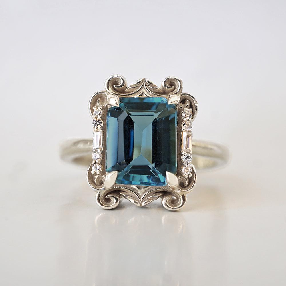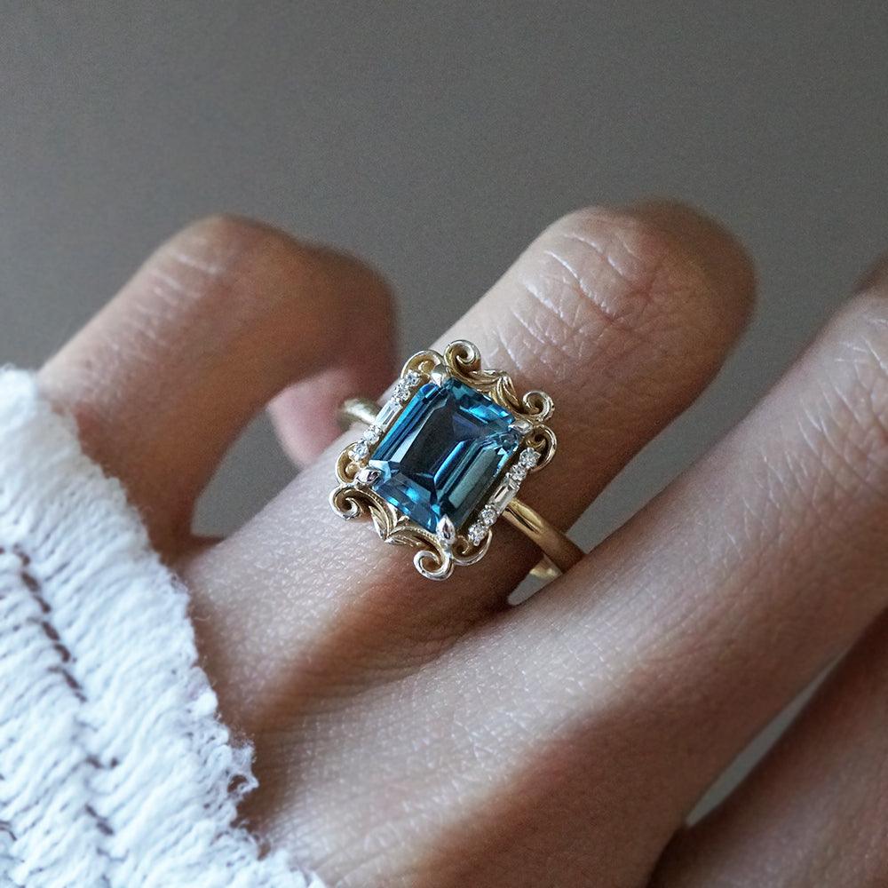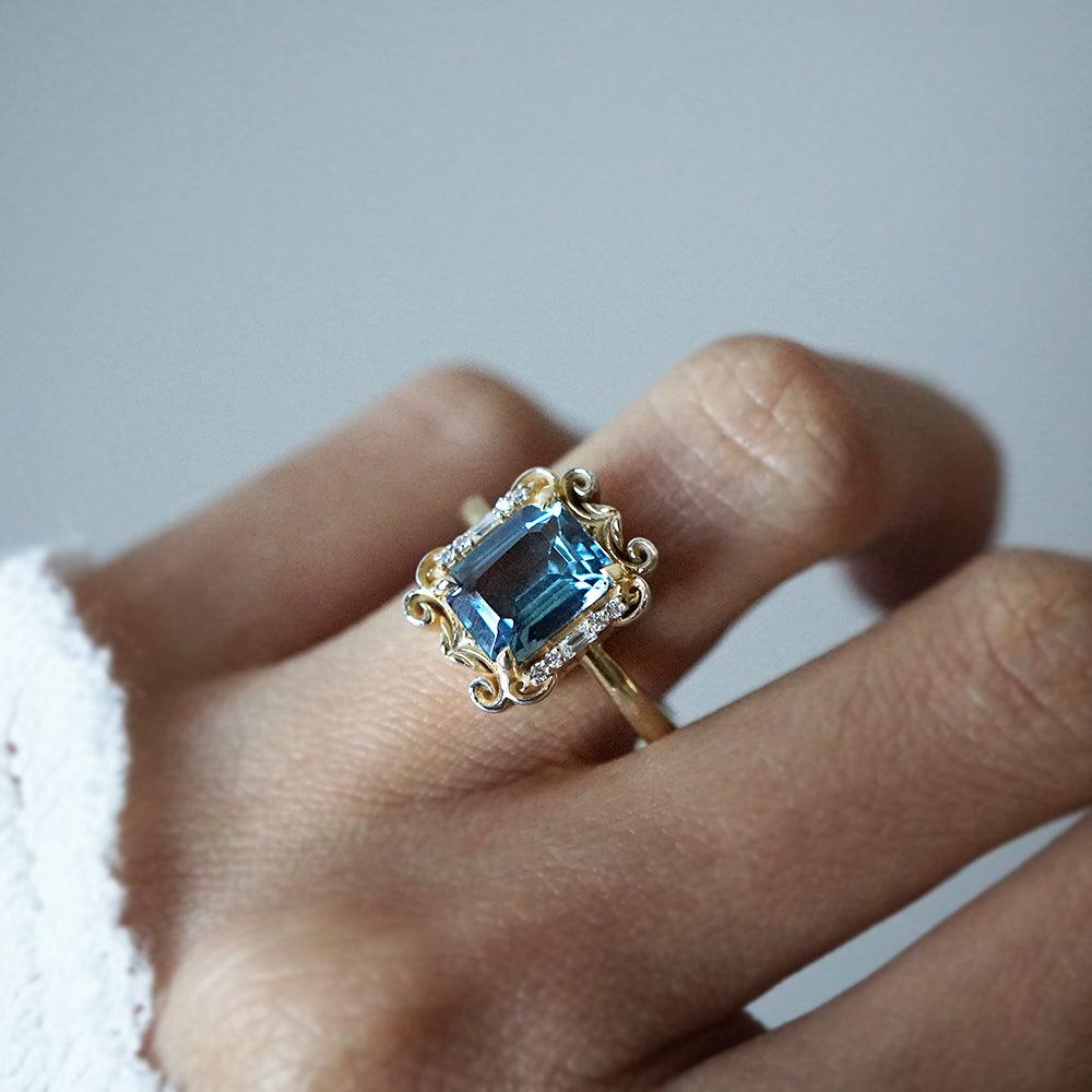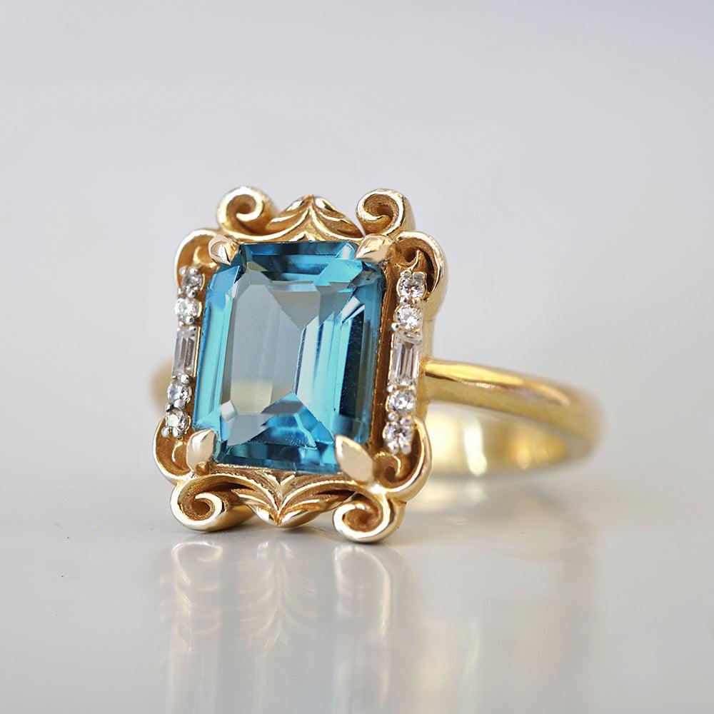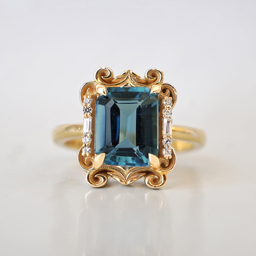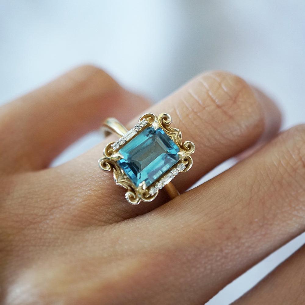Isis London Blue Topaz Scroll Diamond Ring in 14K and 18K Gold