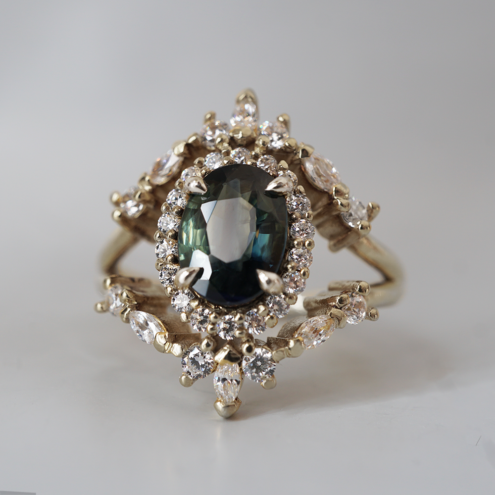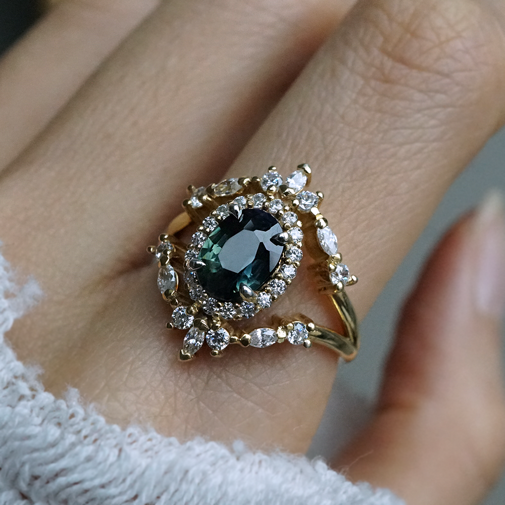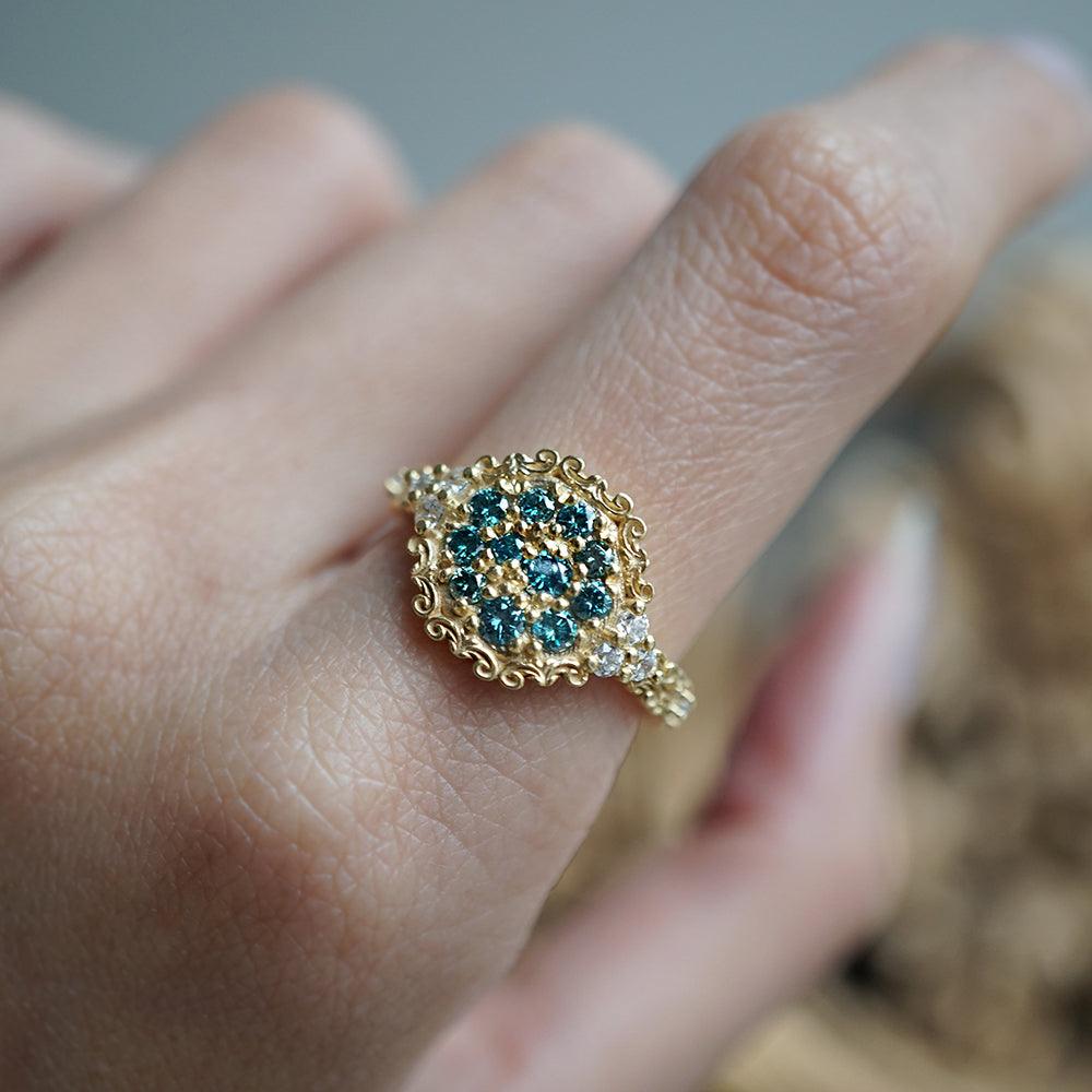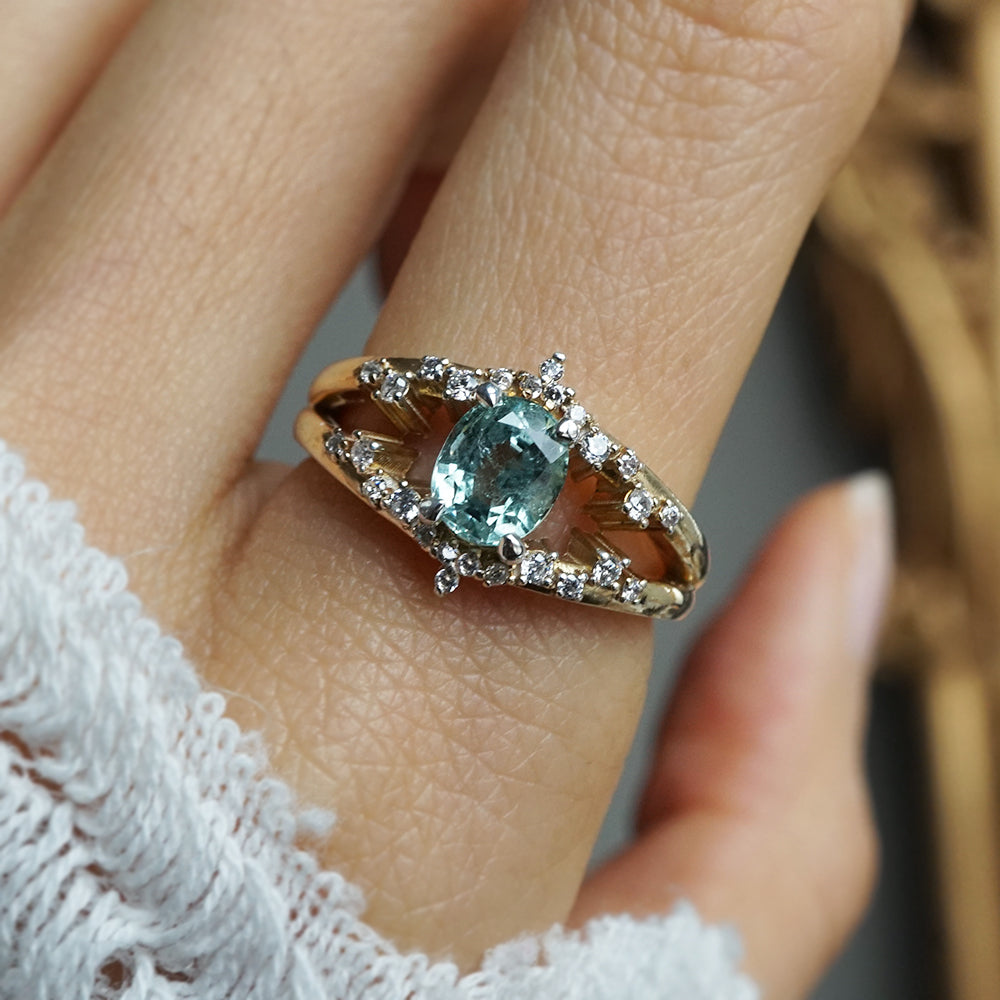 One Of A Kind: Teal Sapphire Marrow Diamond Ring in 14K and 18K Gold