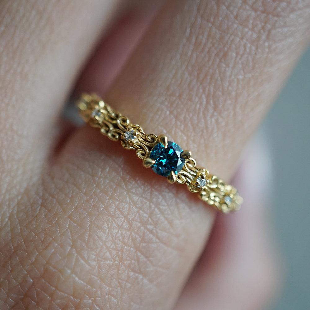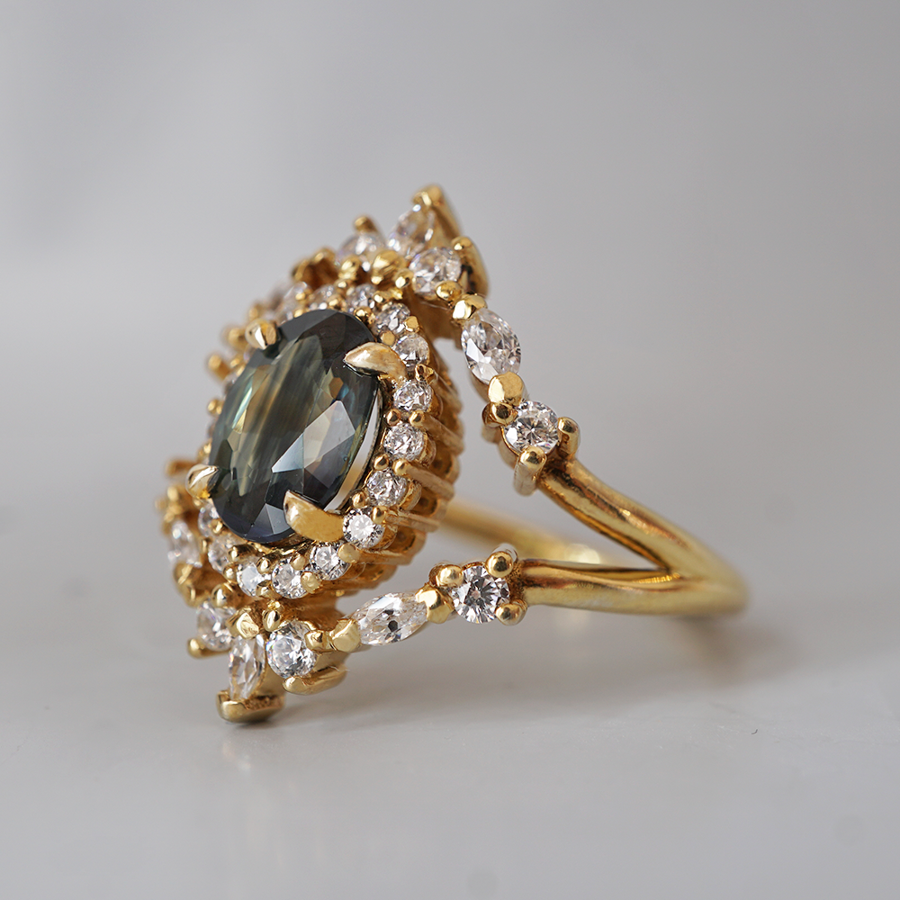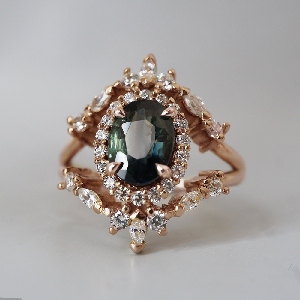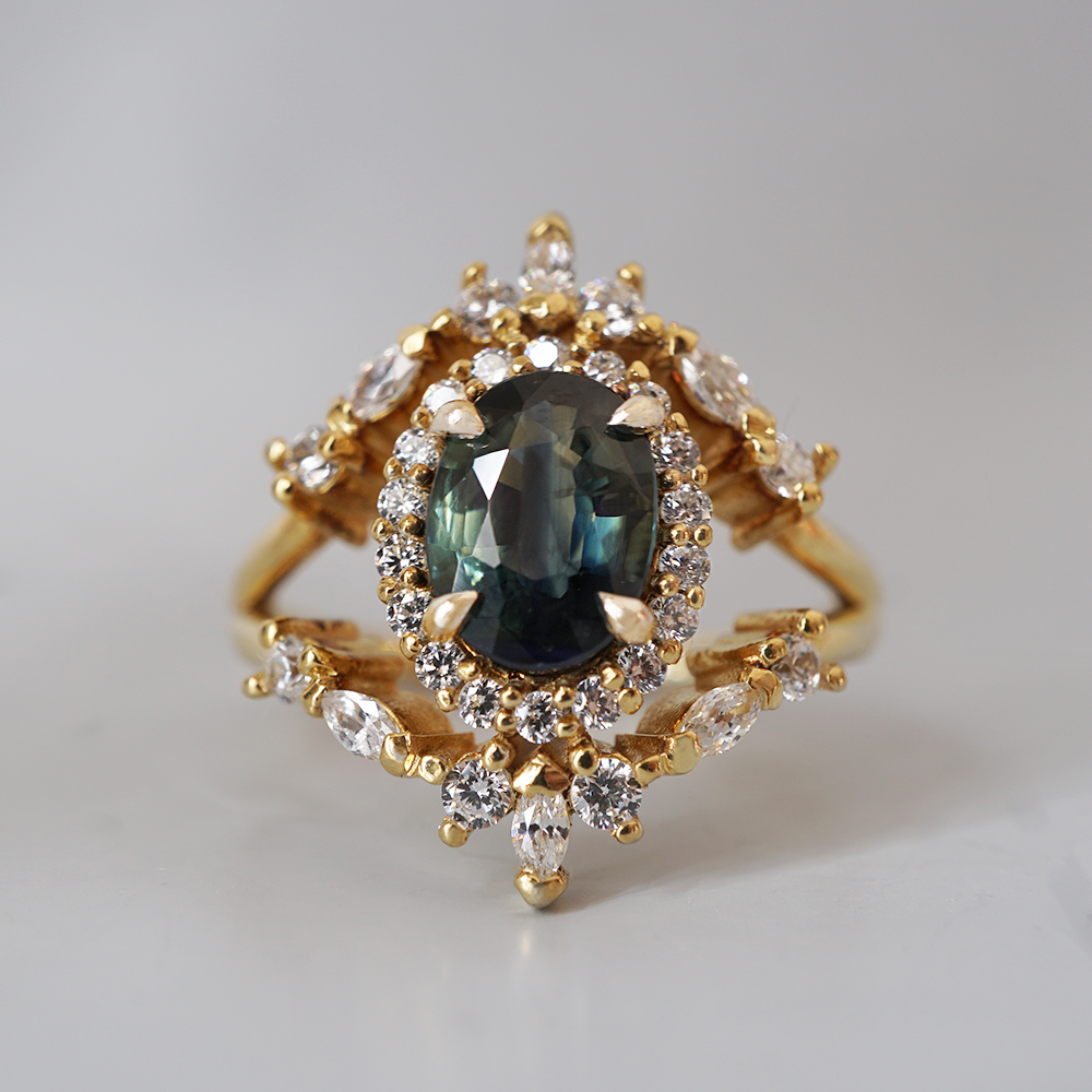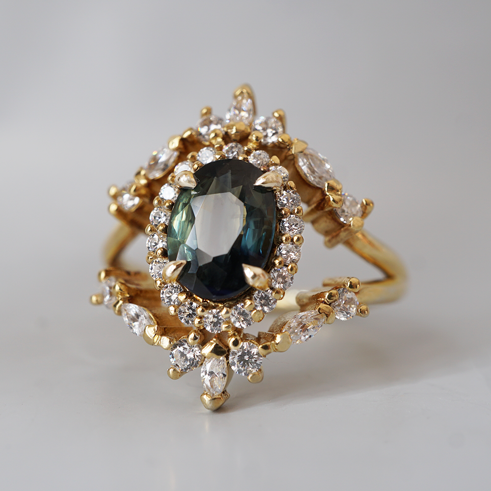 One Of A Kind: Teal Sapphire Marrow Diamond Ring in 14K and 18K Gold