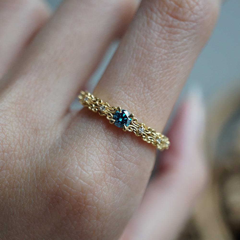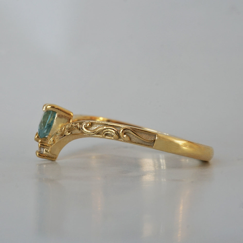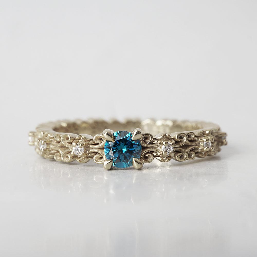 One Of A Kind: Teal Sapphire Marrow Diamond Ring in 14K and 18K Gold -