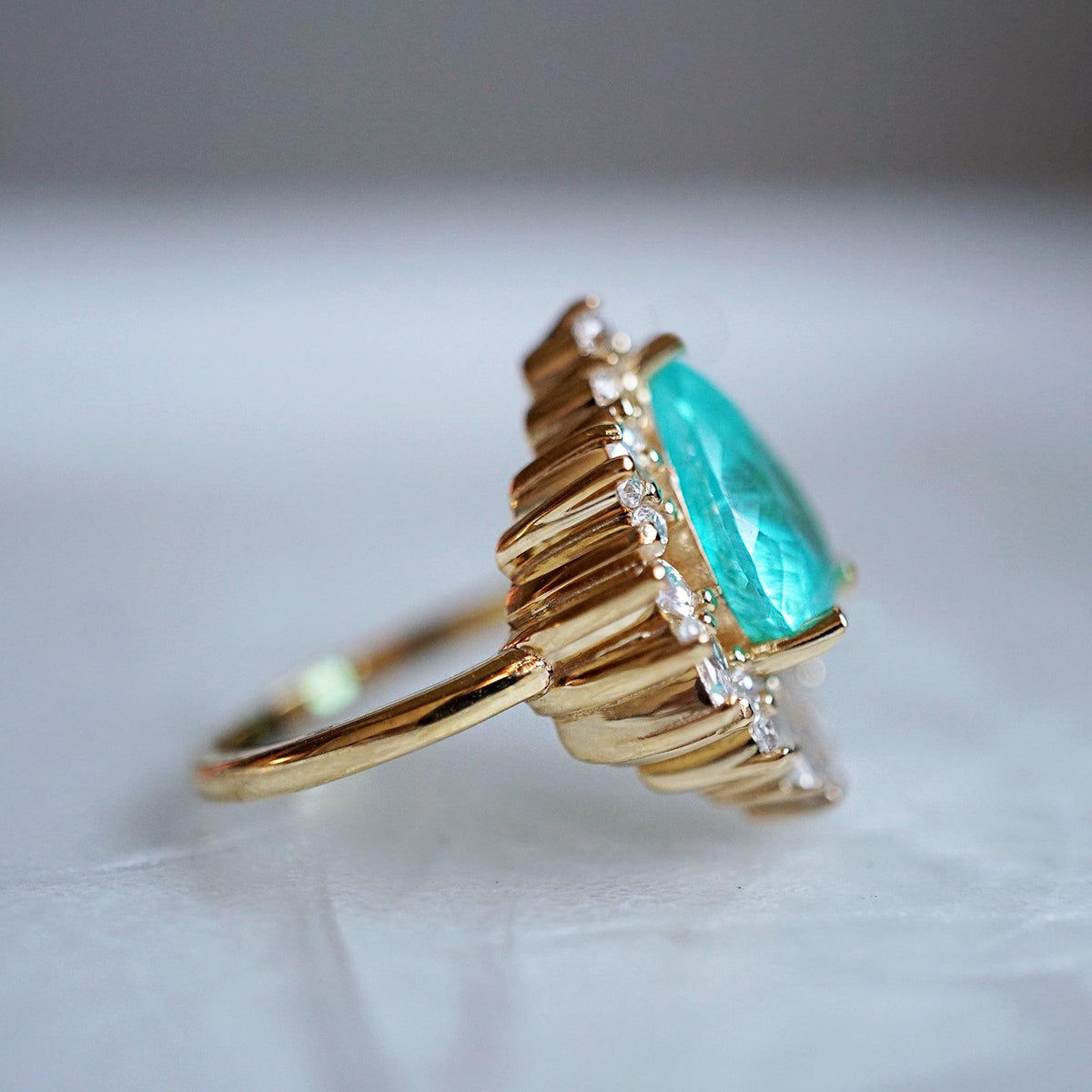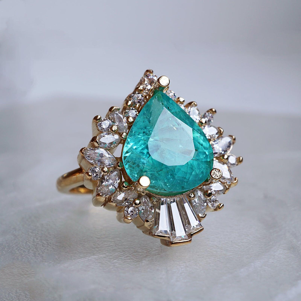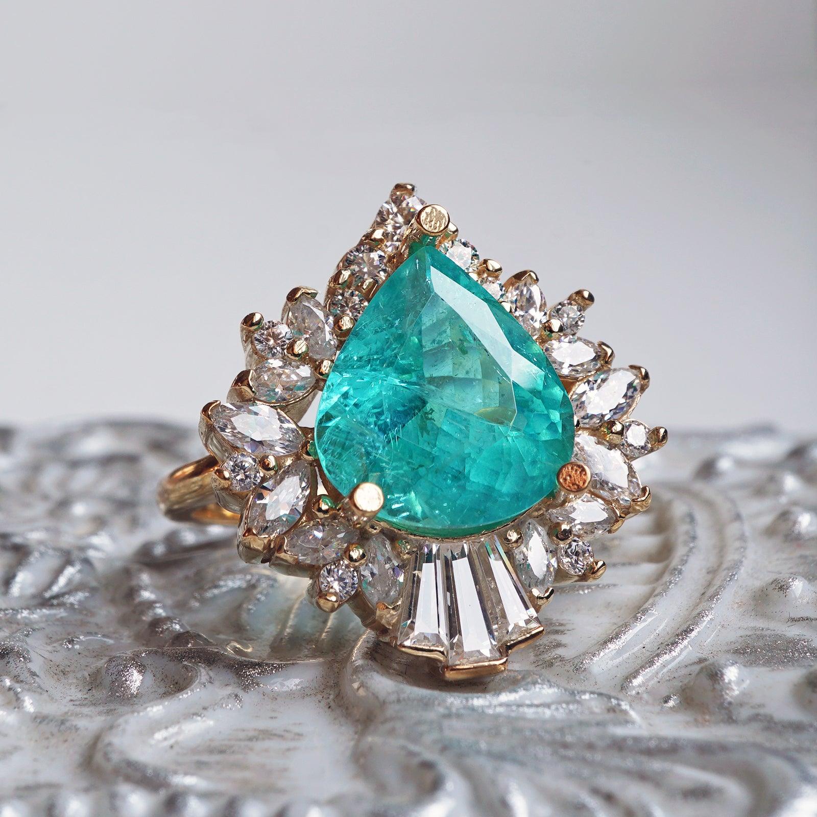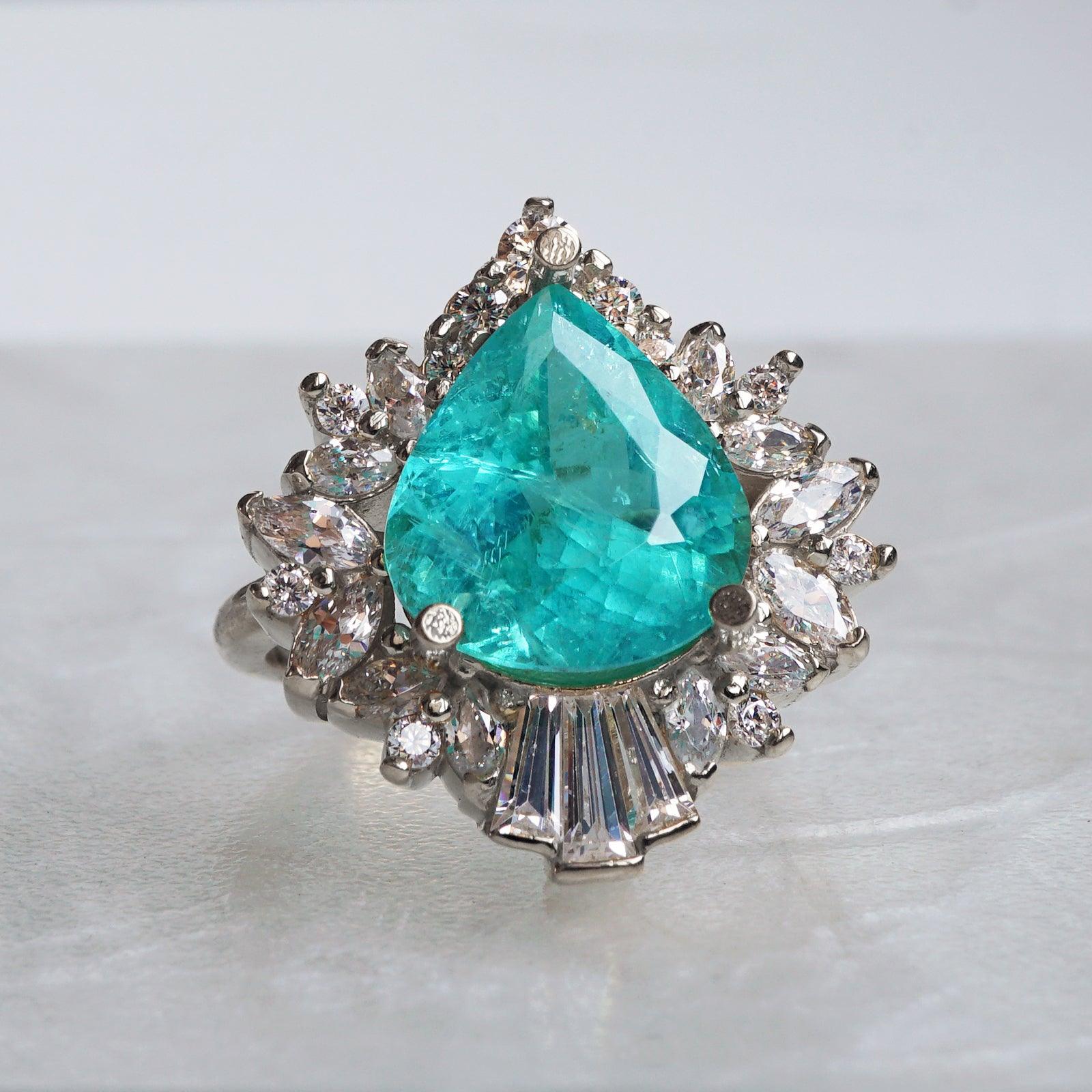 Prized for its neon blue color, the Tourmaline Paraiba is a collectors gem. The Halls Of Mirror Tourmaline Paraiba Diamond ring is sure to make your heart skip a beat. Featuring a certified 3.85ct natural pear Tourmaline Paraiba. It's truly a one-of-a-kind gem. Handcrafted in your choice of 14K yellow gold, rose gold, or white gold.