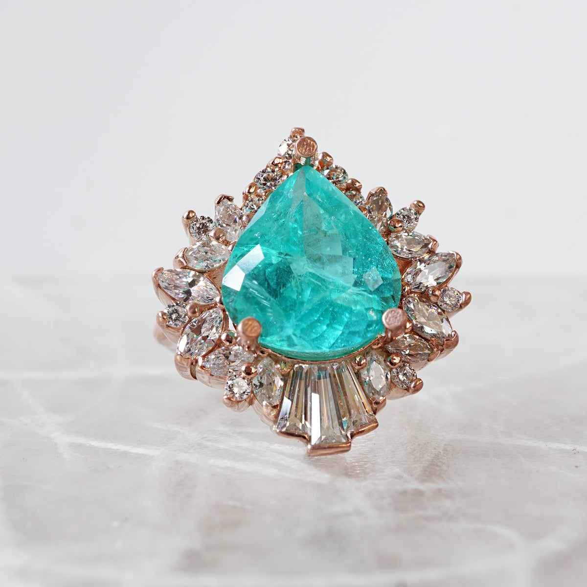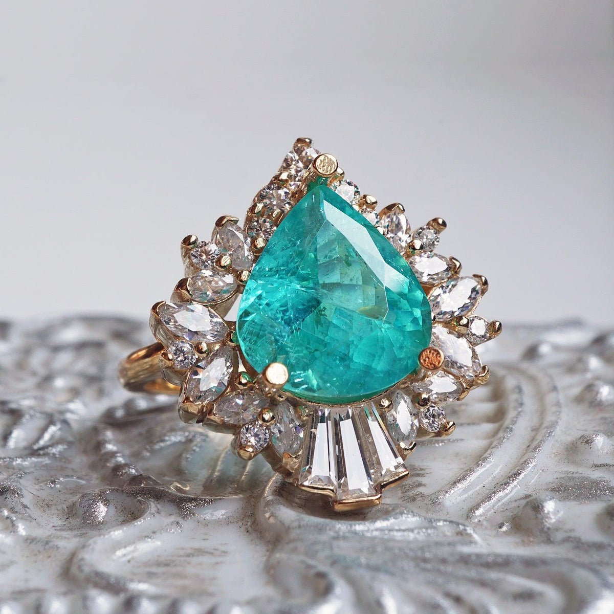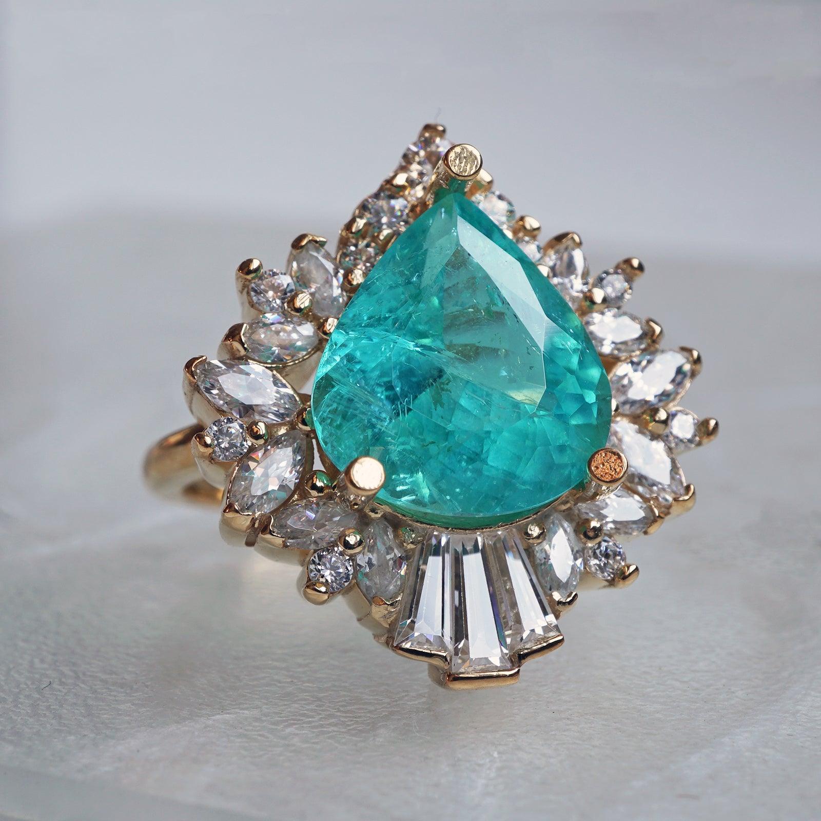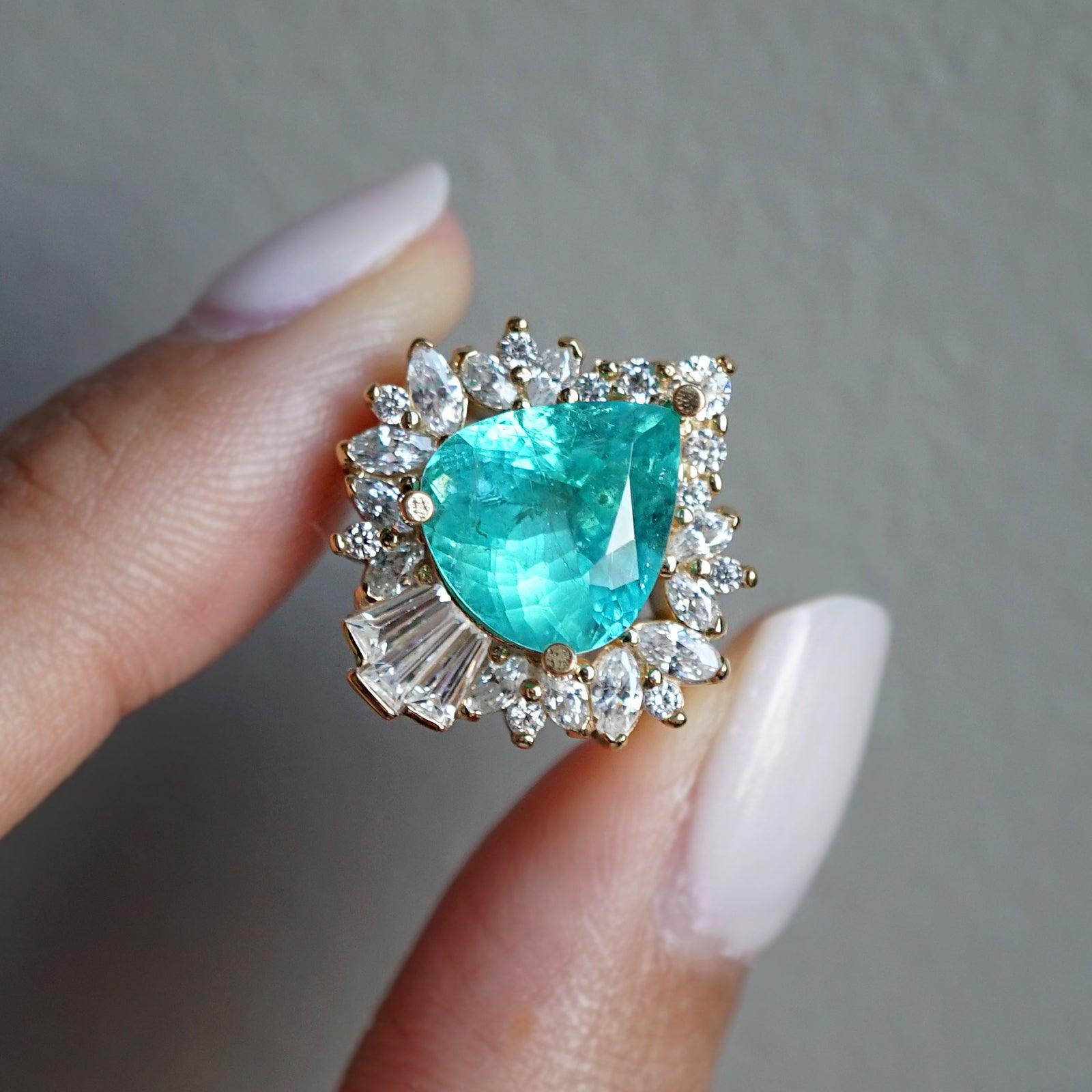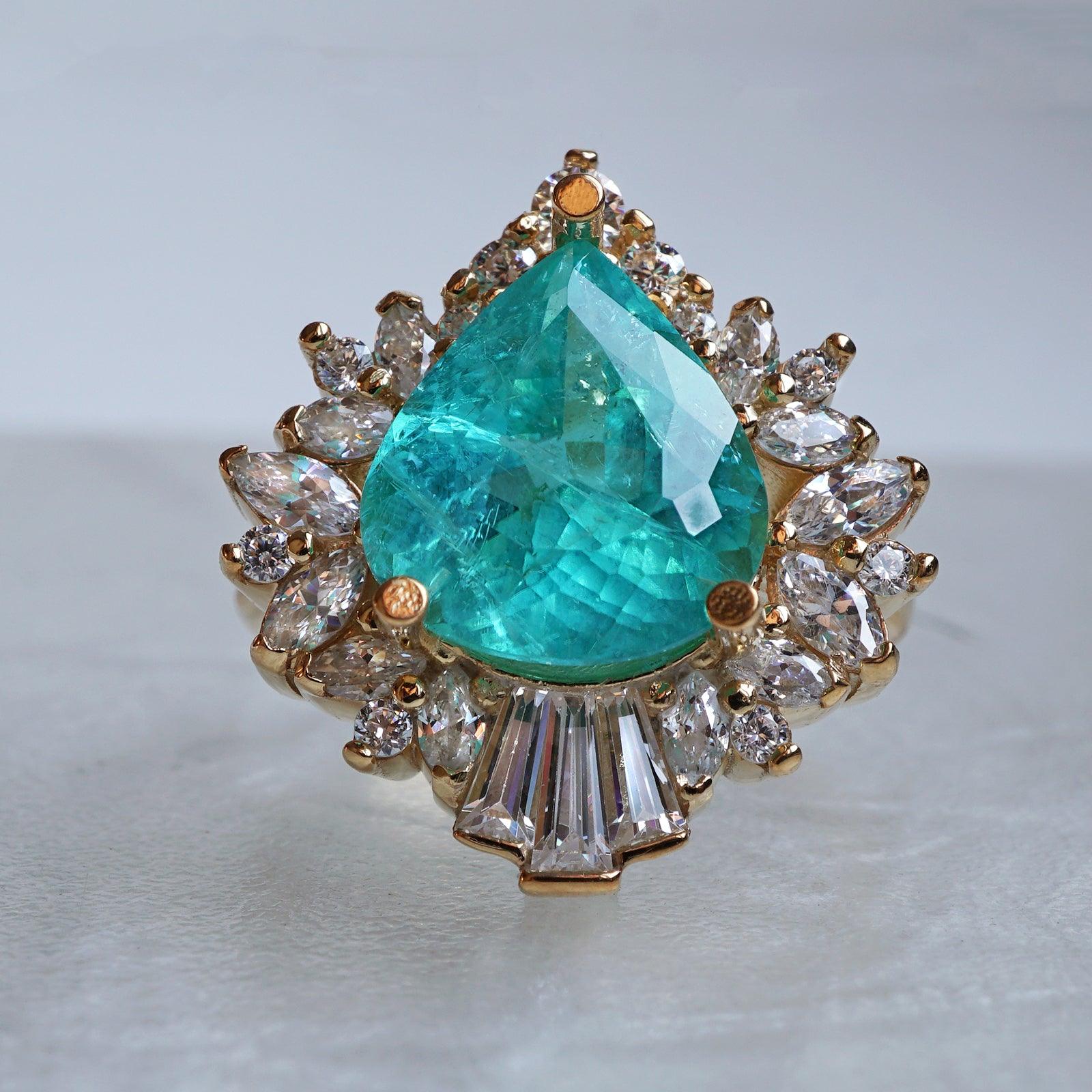Prized for its neon blue color, the Tourmaline Paraiba is a collectors gem. The Halls Of Mirror Tourmaline Paraiba Diamond ring is sure to make your heart skip a beat. Featuring a certified 3.85ct natural pear Tourmaline Paraiba. It's truly a one-of-a-kind gem. Handcrafted in your choice of 14K yellow gold, rose gold, or white gold.