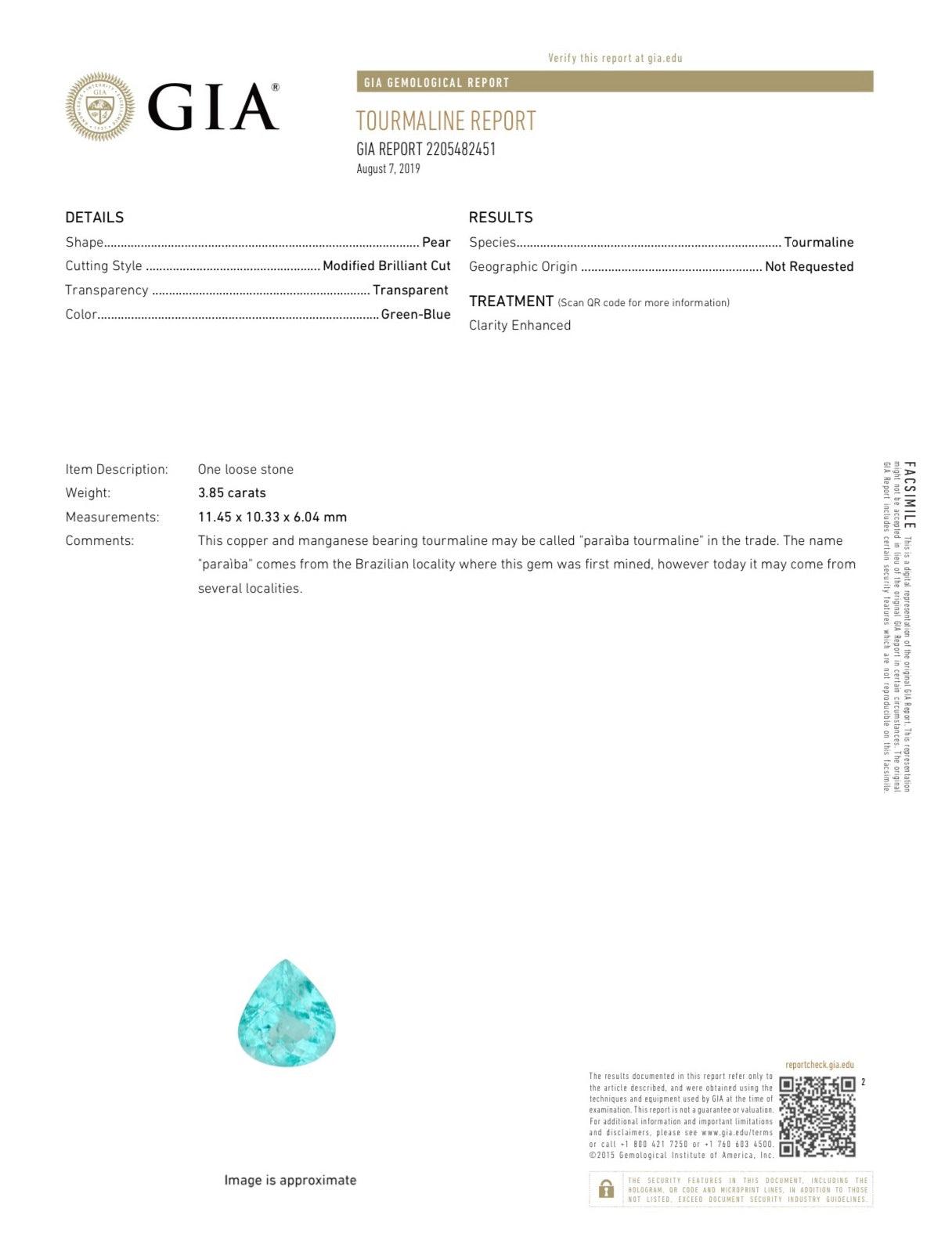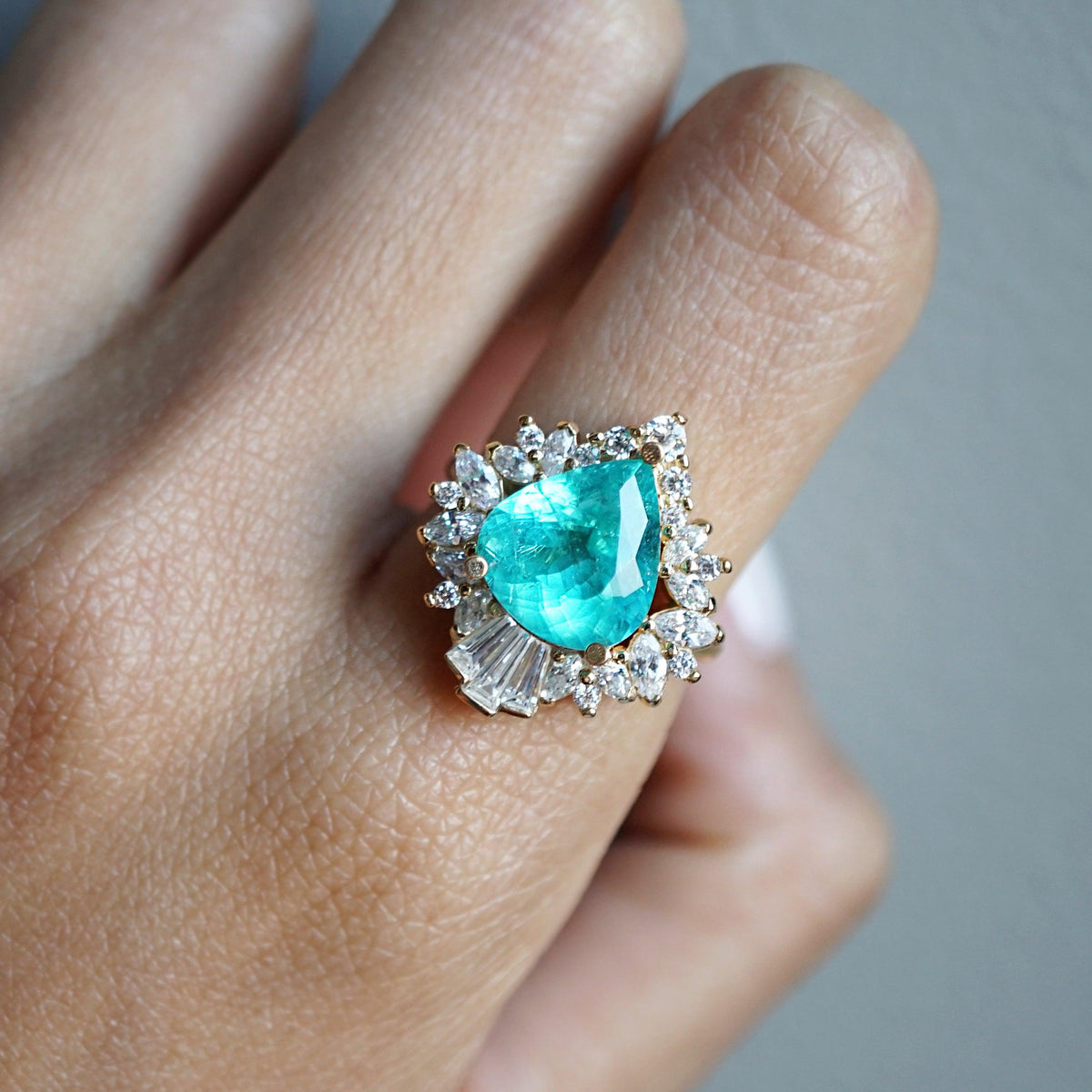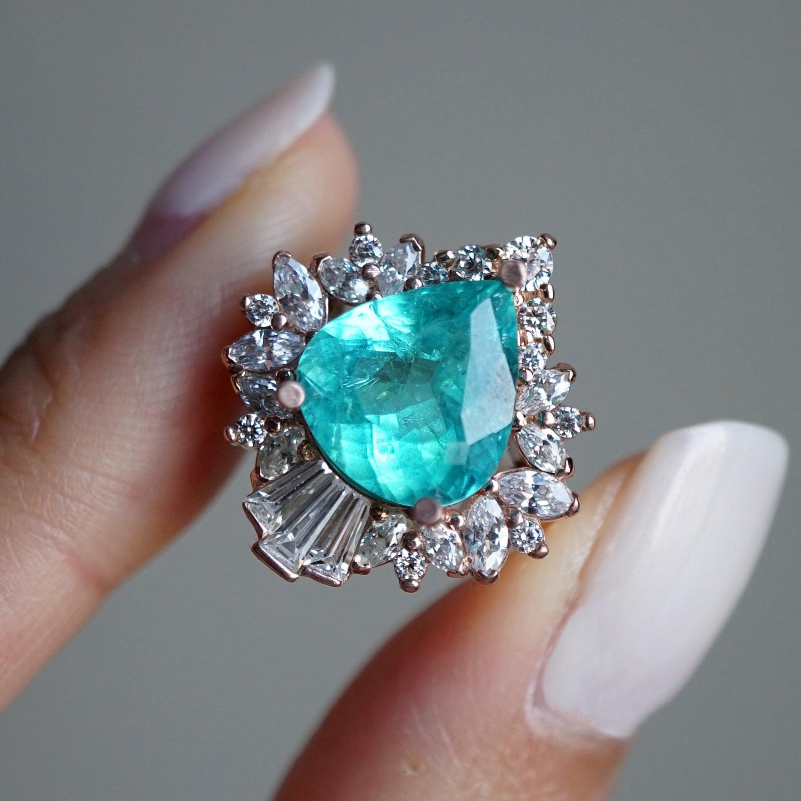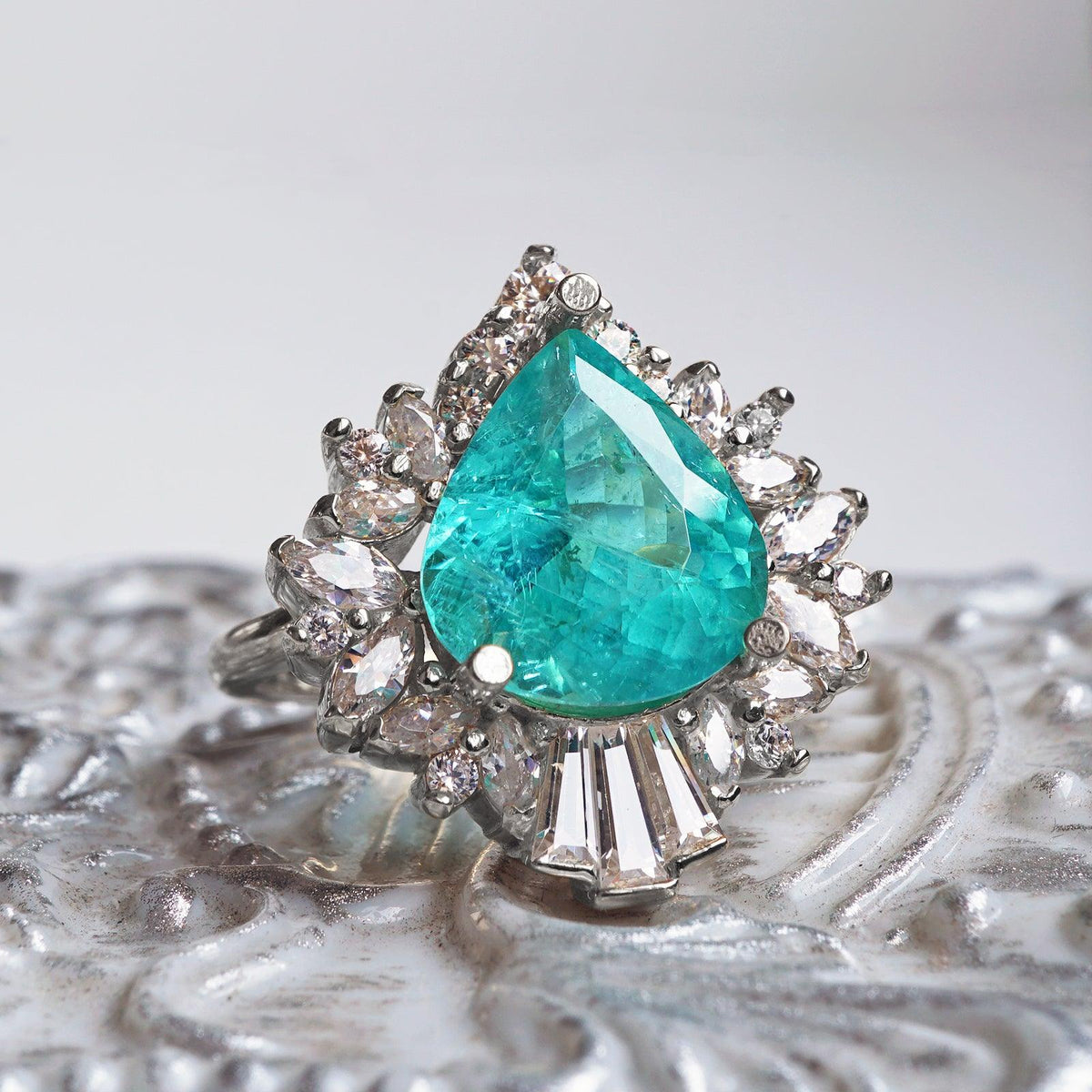 Prized for its neon blue color, the Tourmaline Paraiba is a collectors gem. The Halls Of Mirror Tourmaline Paraiba Diamond ring is sure to make your heart skip a beat. Featuring a certified 3.85ct natural pear Tourmaline Paraiba. It's truly a one-of-a-kind gem. Handcrafted in your choice of 14K yellow gold, rose gold, or white gold.