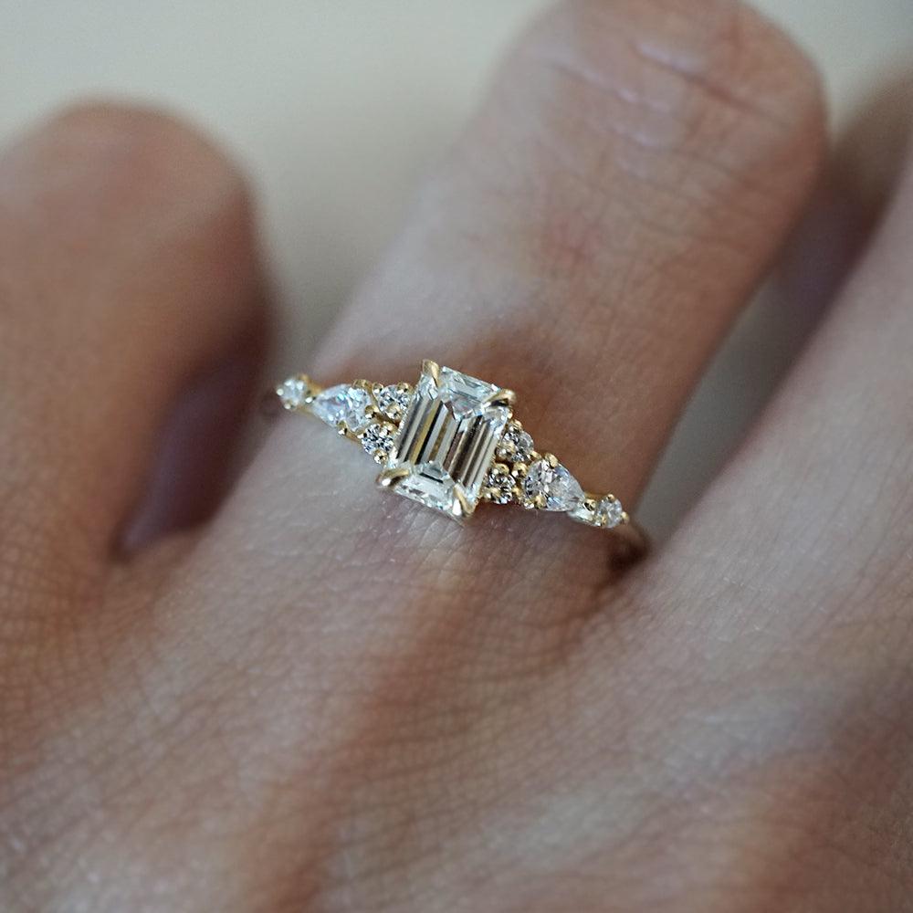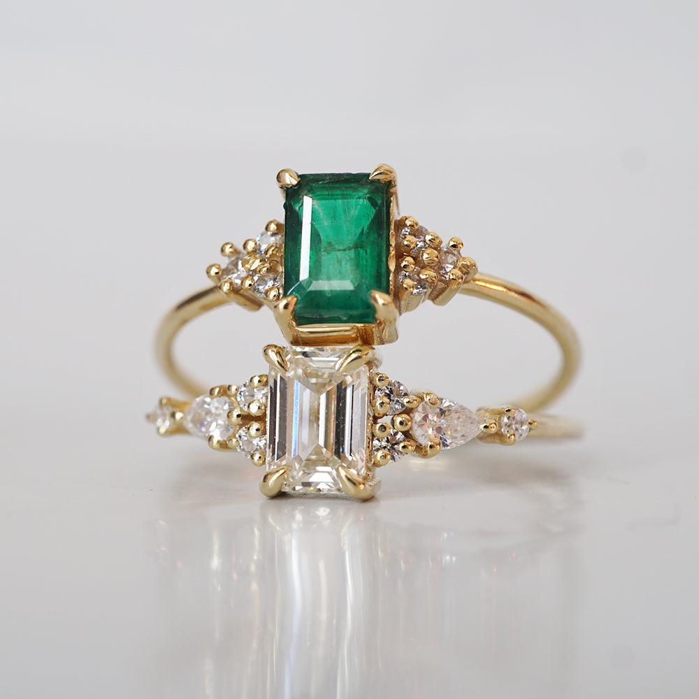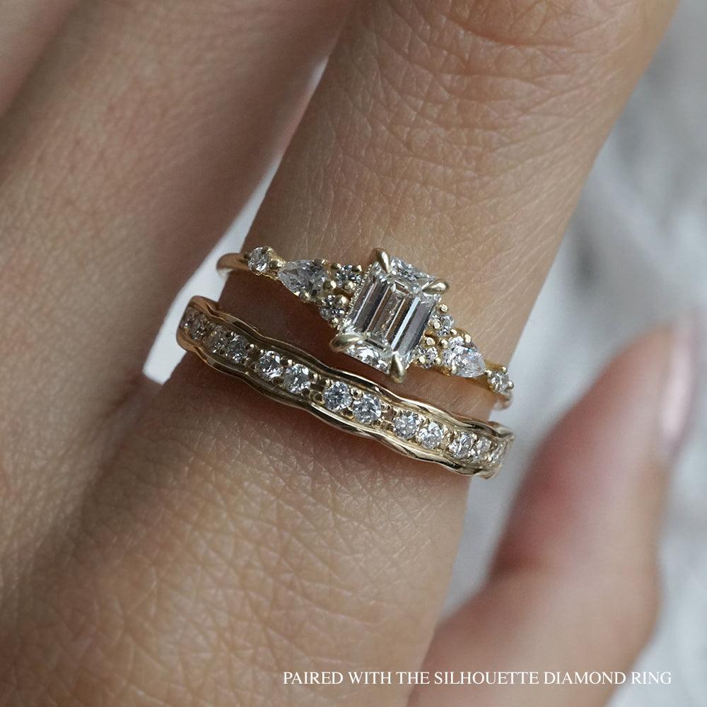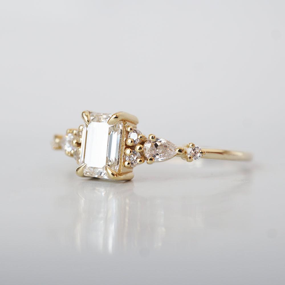 As romantic as the roads of Paris, this ring features a beautiful emerald-cut natural diamond hugged by two pear diamonds and round diamonds. A dainty classy ring for an engagement or to mark a special occasion. Available in 14K yellow gold, rose gold and white gold.