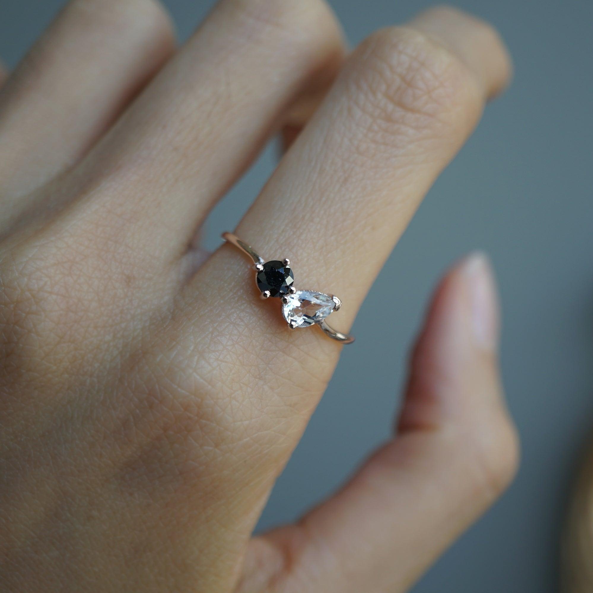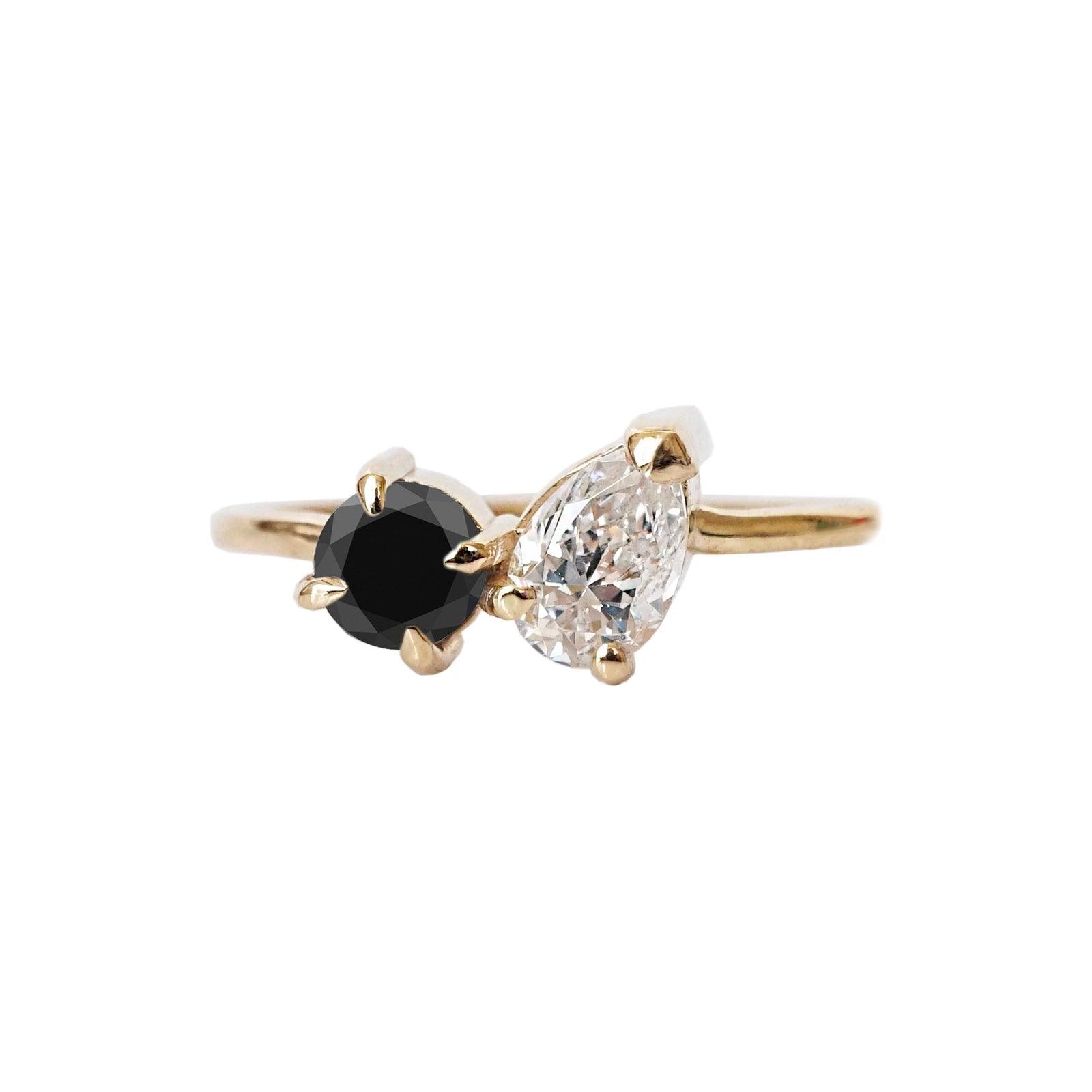 The Toi et Moi Ring celebrates duality — two contrasting gems joined in perfect harmony. Featuring a natural round salt and pepper diamond or natural black diamond, paired with a pear-shaped white topaz, this design captures balance, contrast, and timeless romance.