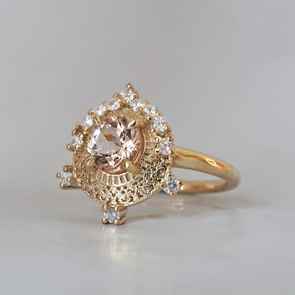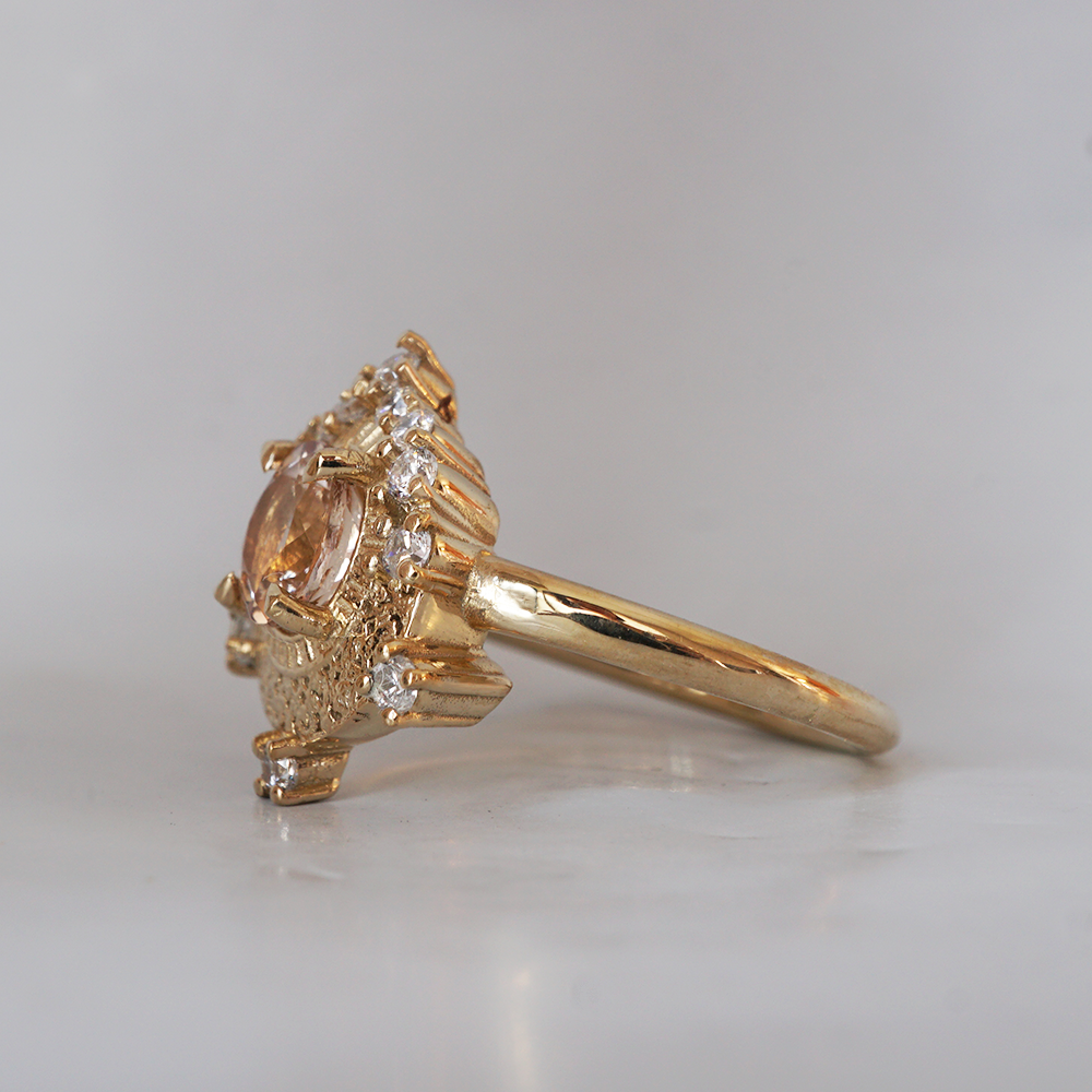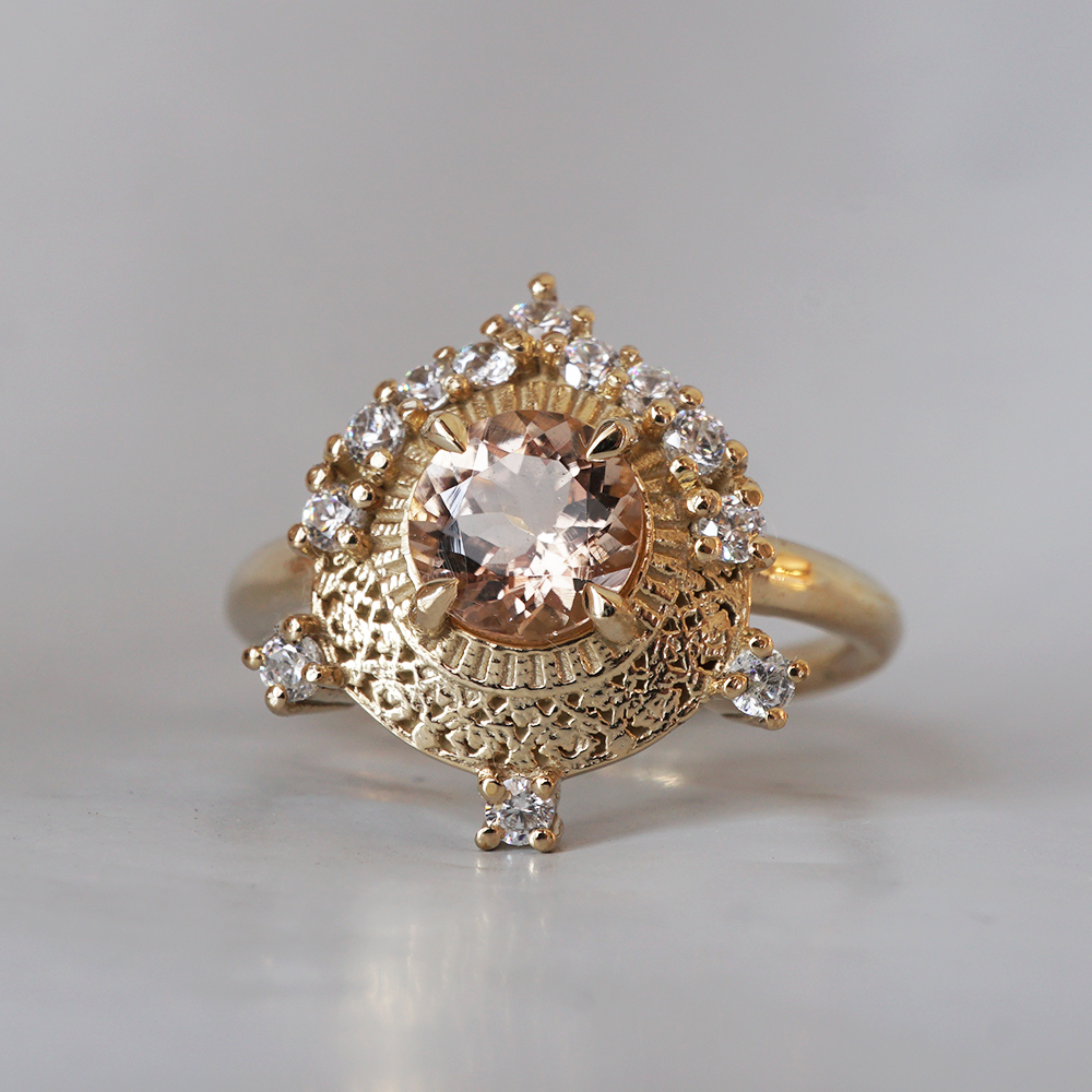 The Morganite Minaret Diamond Ring captures the harmony of art, culture, and craftsmanship. At its center glows a natural round morganite, radiating soft peach hues that embody warmth and grace. Surrounding the gem, a halo of brilliant natural white diamonds enhances its luminous beauty, creating a celestial sparkle that catches the light with every movement.