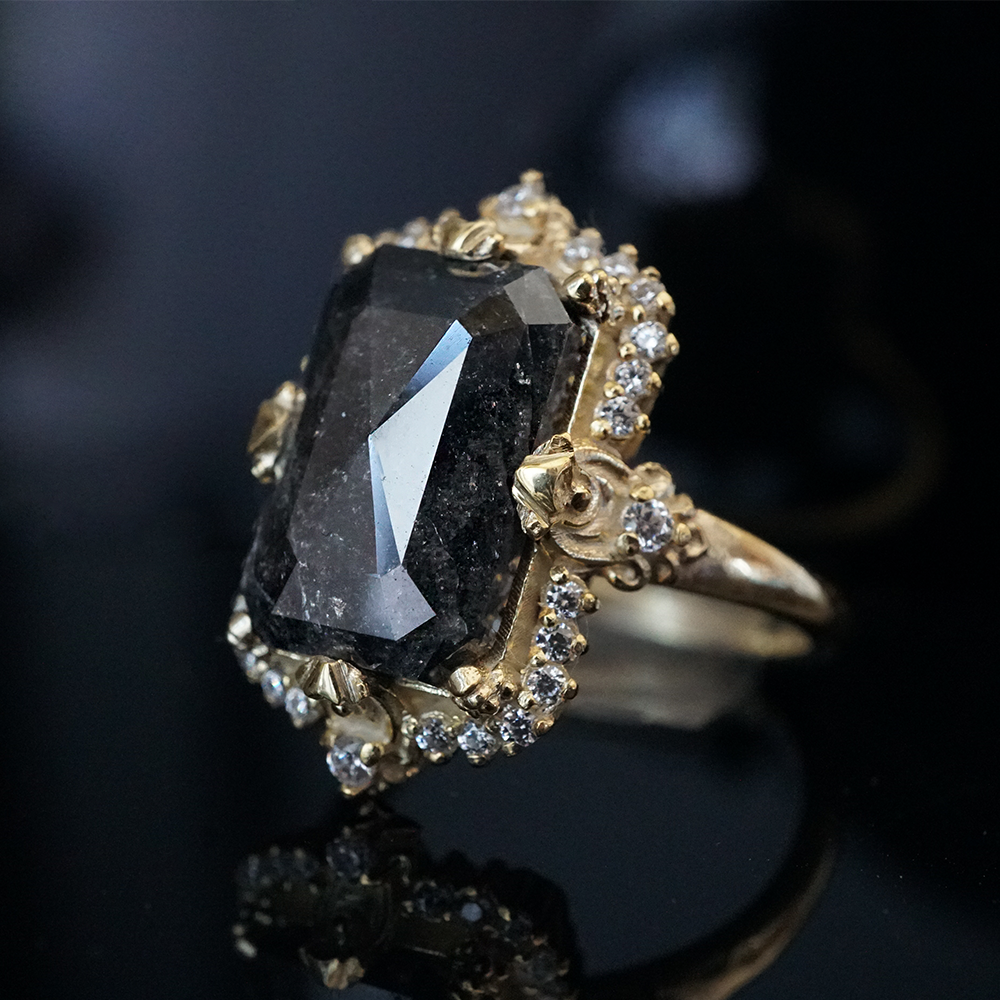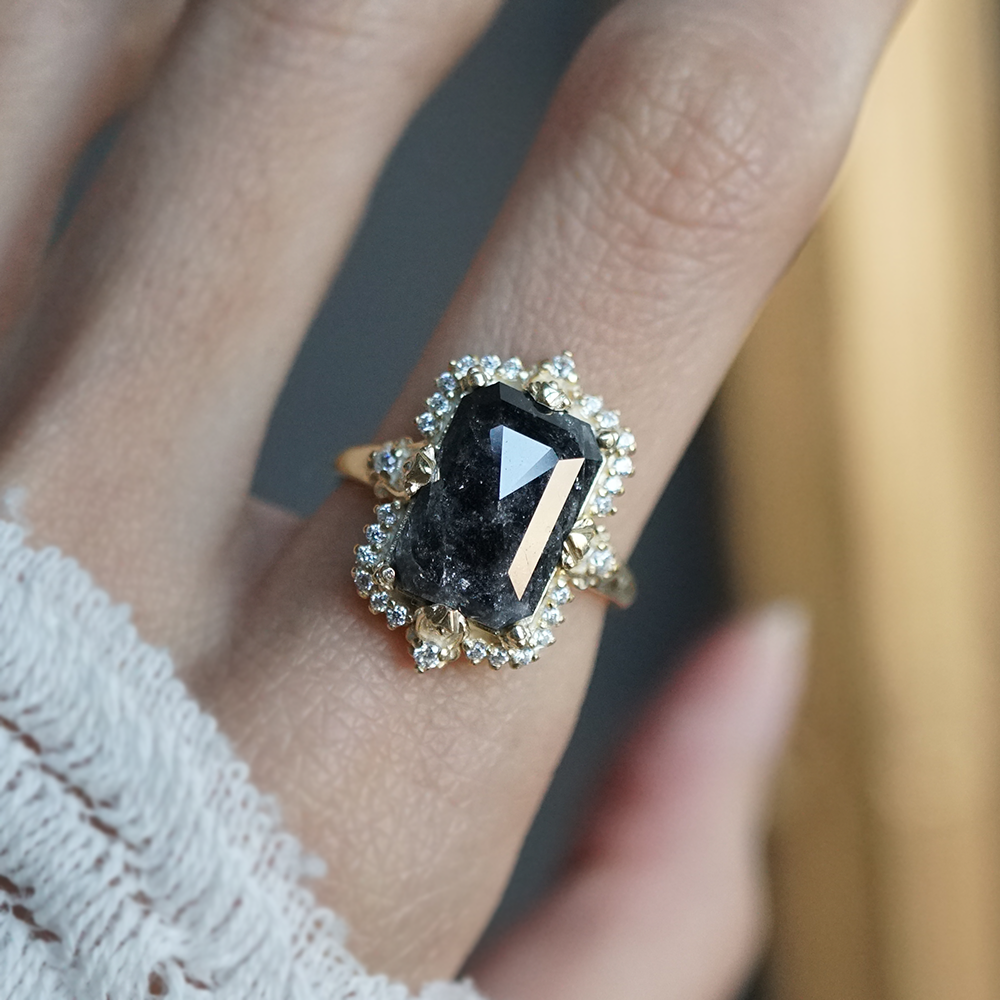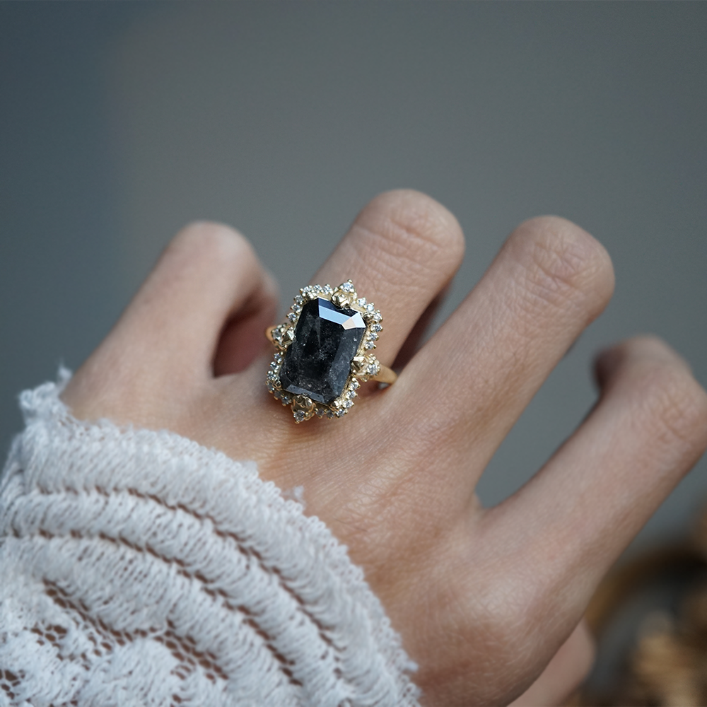 A masterpiece of high jewelry, Imperium Noctis is a ring that commands attention, embodying the mystique of the night sky and the majesty of a royal dynasty. At its heart lies a resplendent salt & pepper diamond, an emerald-cut gem of captivating depth and mystery. Encased in an ornate gold setting, this rare stone is framed by a luminous halo of brilliant-cut white diamonds, reminiscent of distant stars against a midnight sky.