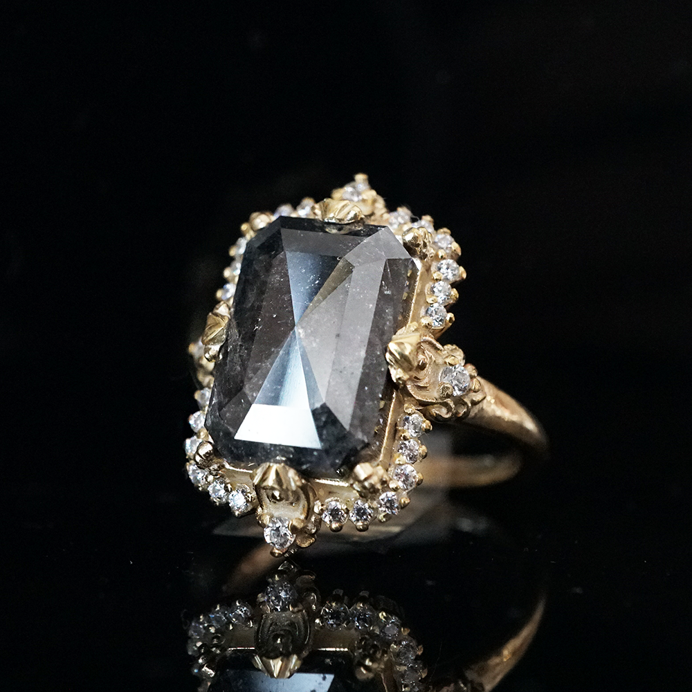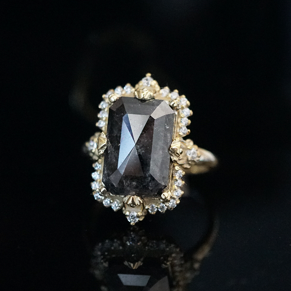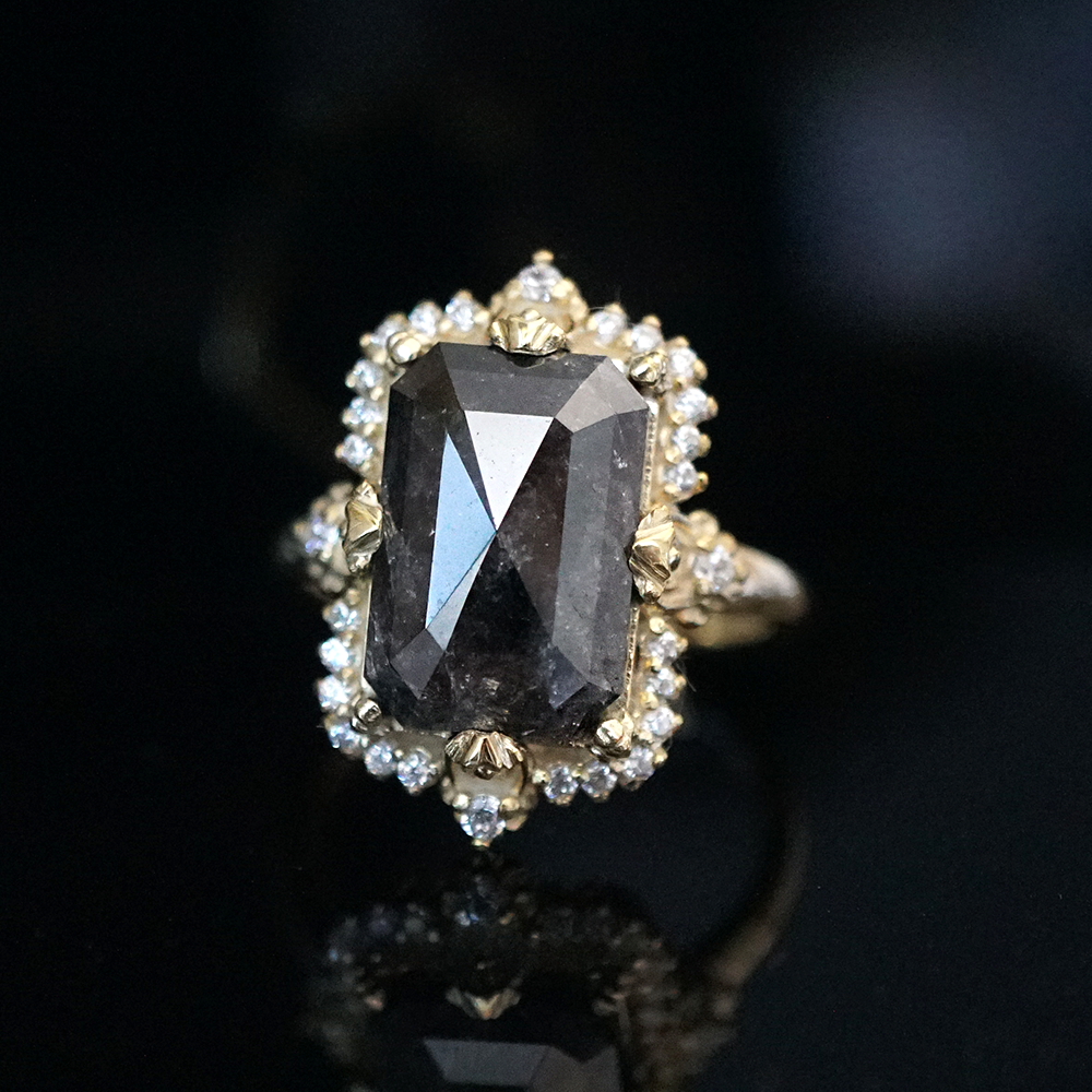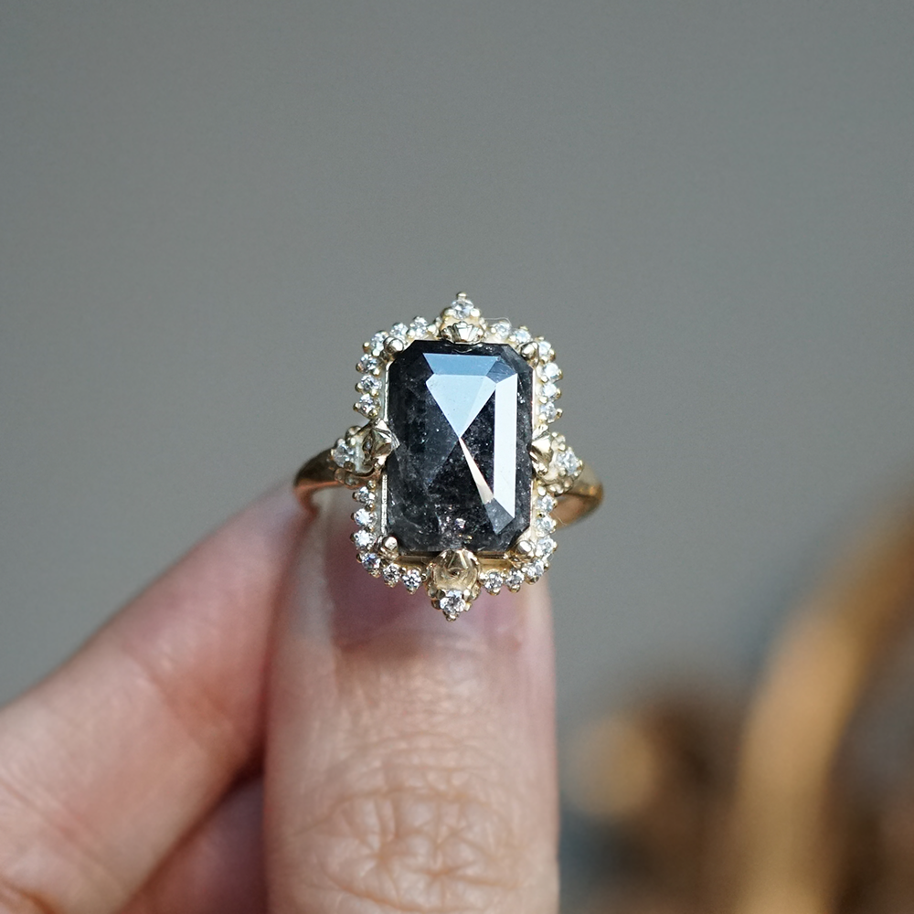 A masterpiece of high jewelry, Imperium Noctis is a ring that commands attention, embodying the mystique of the night sky and the majesty of a royal dynasty. At its heart lies a resplendent salt & pepper diamond, an emerald-cut gem of captivating depth and mystery. Encased in an ornate gold setting, this rare stone is framed by a luminous halo of brilliant-cut white diamonds, reminiscent of distant stars against a midnight sky.