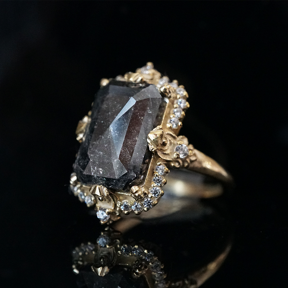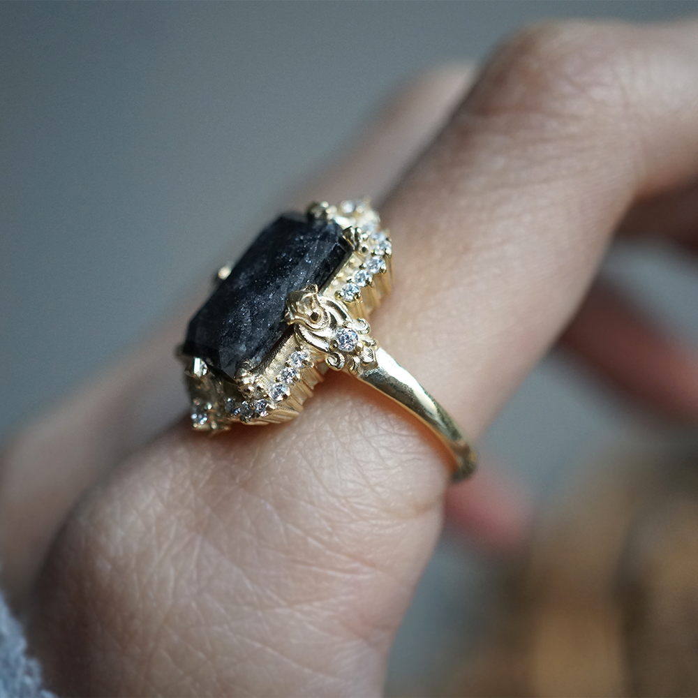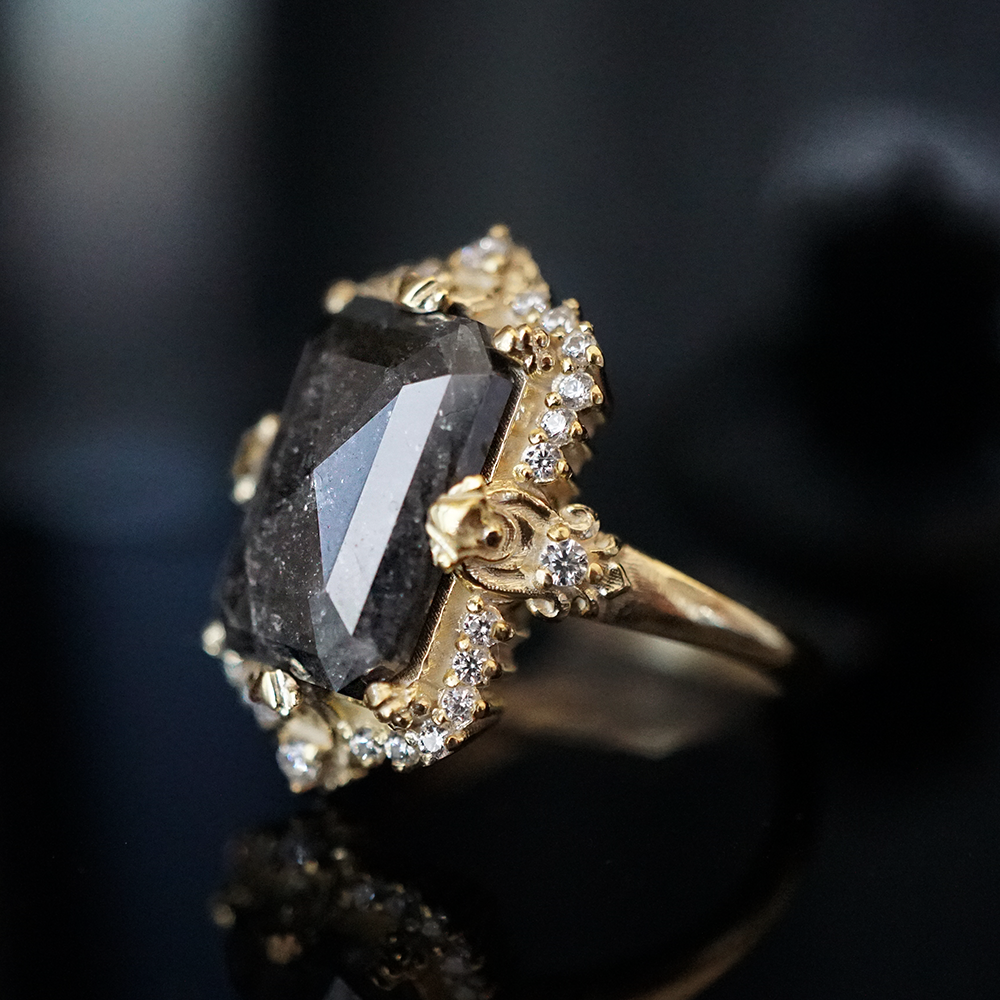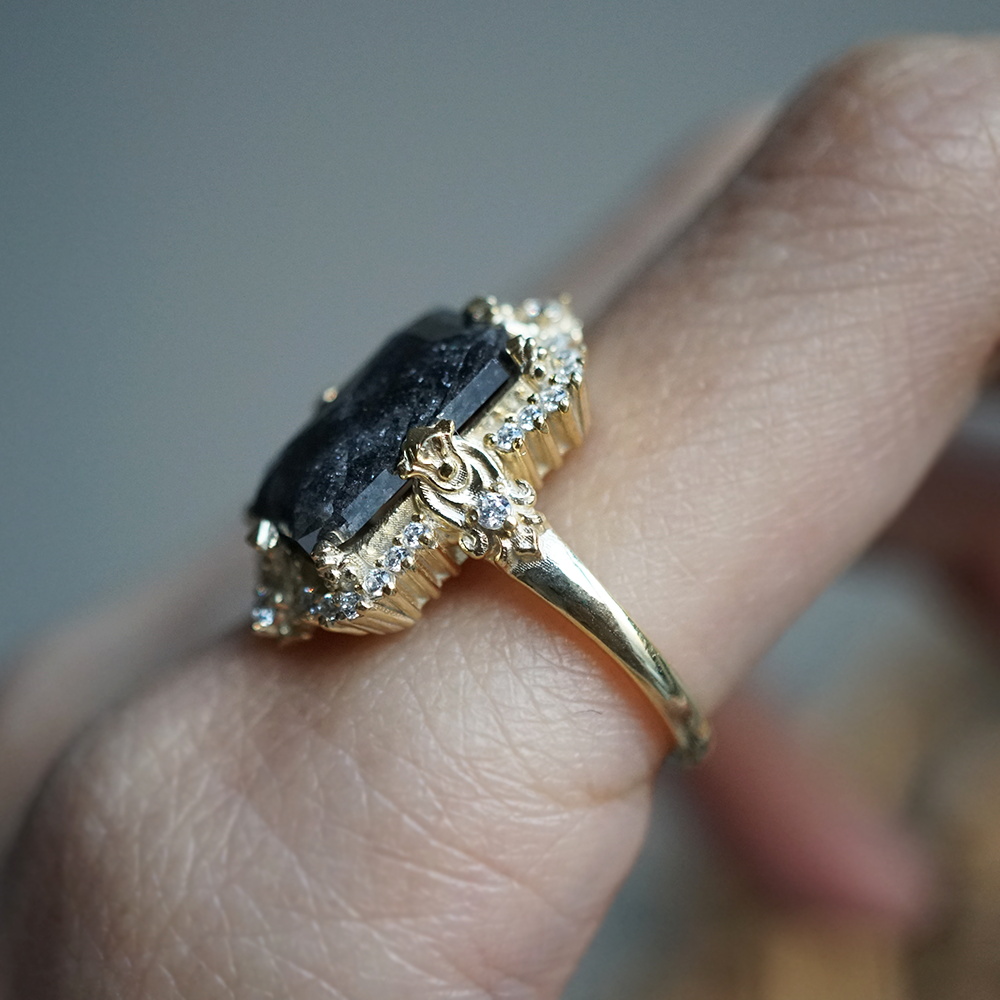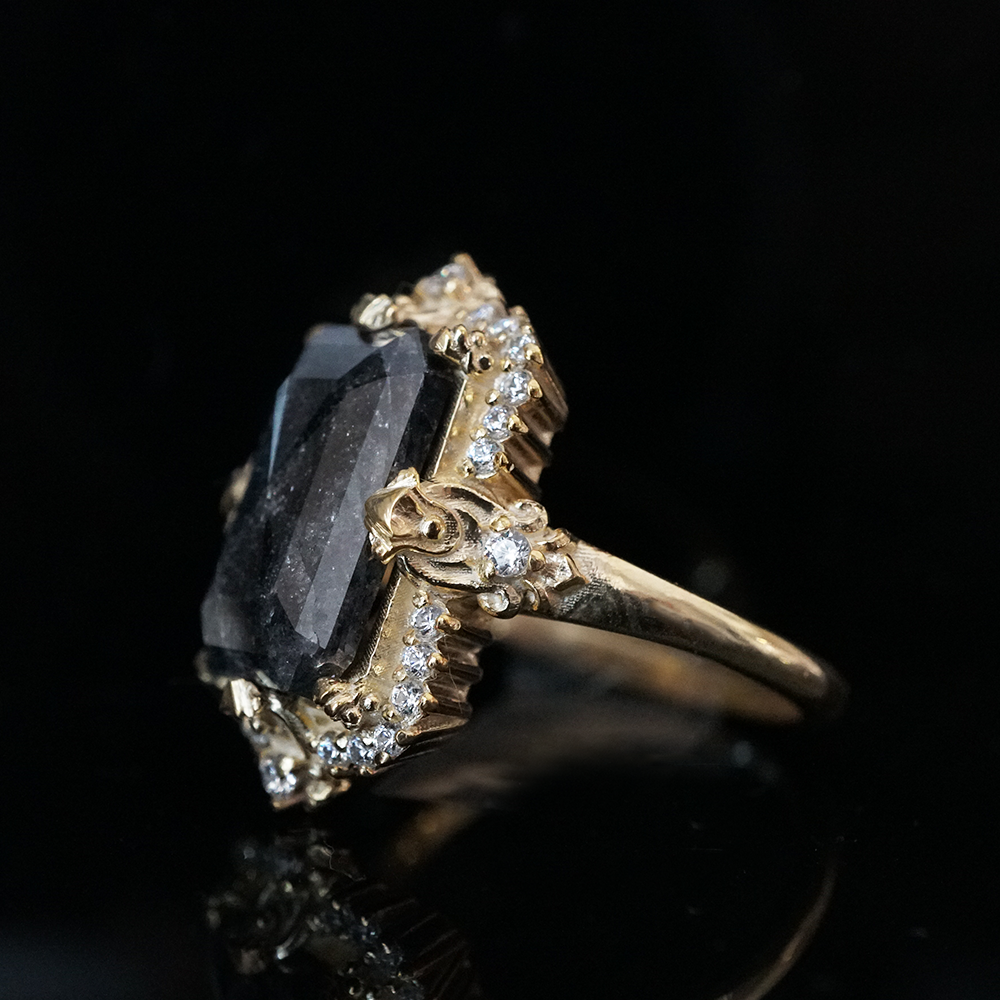 But the true artistry lies in the intricate details-sculpted prongs cradle the salt & pepper diamond like a royal crown, their baroque-inspired curves reminiscent of antique European heirlooms. The ornate goldwork along the band is masterfully engraved with vintage scroll motifs, an ode to classical elegance. These meticulously crafted elements ensure that every angle of Imperium Noctis tells a story of nobility and grandeur.
