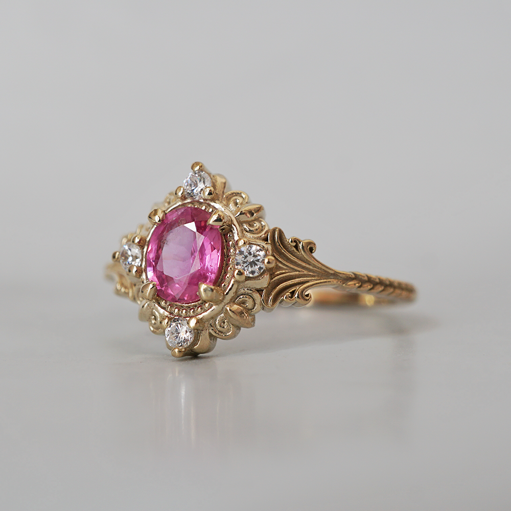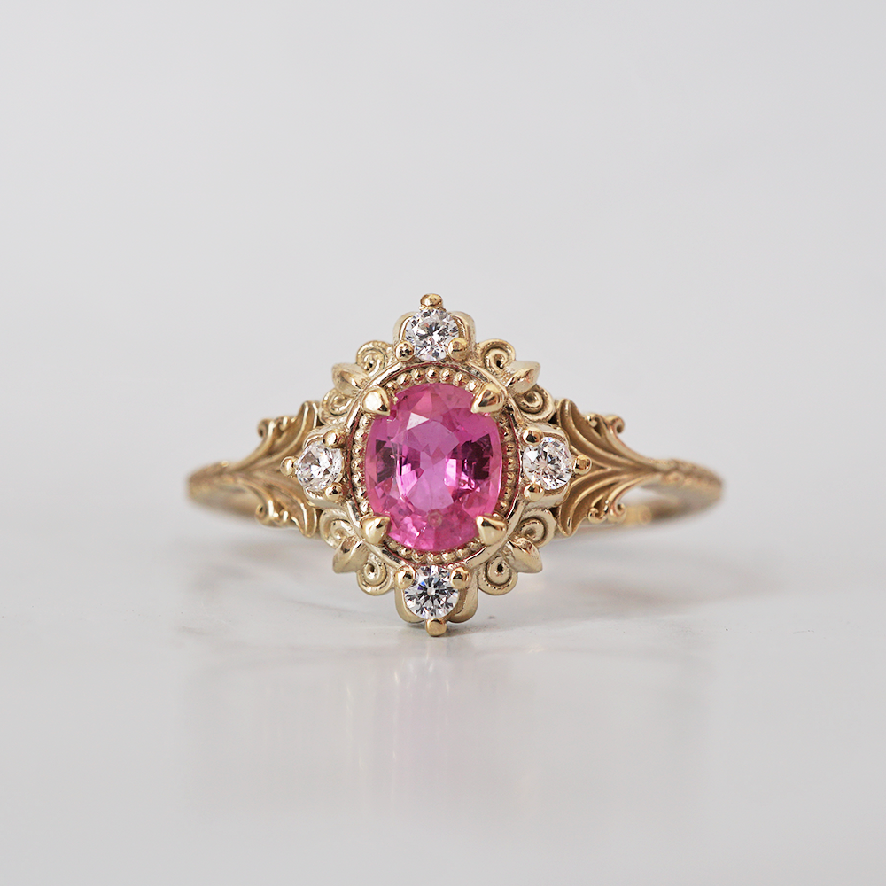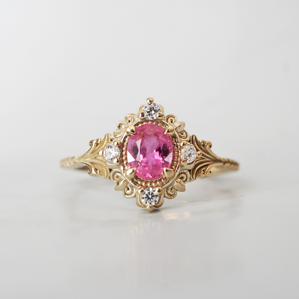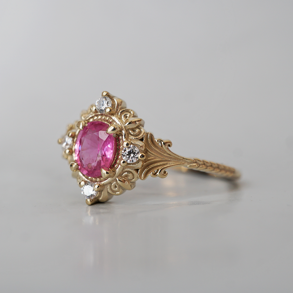 Romantic and radiant, the Seraphina ring captures the elegance of a bygone era. At its center, a vivid pink sapphire glows with warmth and charm, framed by intricate golden filigree and sparkling diamond accents. The ornate detailing on the band adds a timeless vintage touch, evoking the beauty of antique heirlooms. A cherished piece for those drawn to classic romance with a hint of bold color.