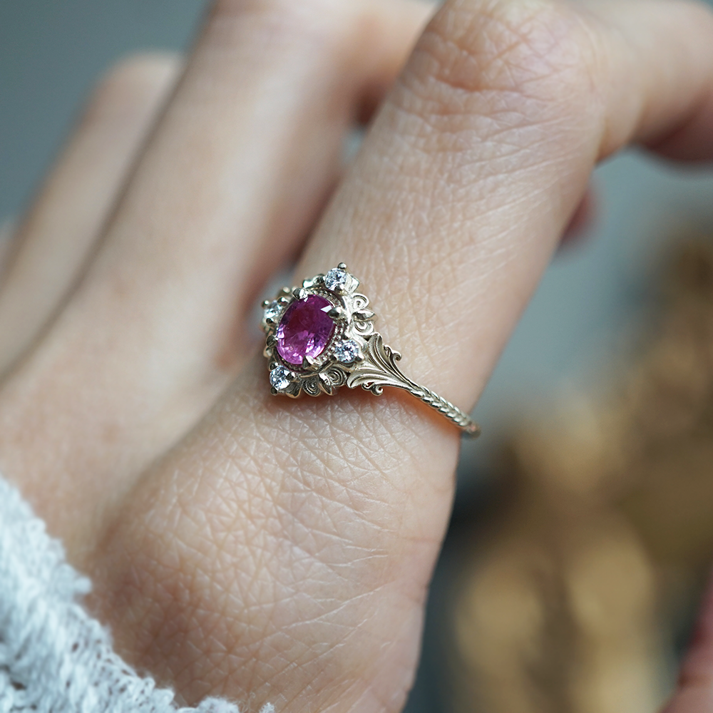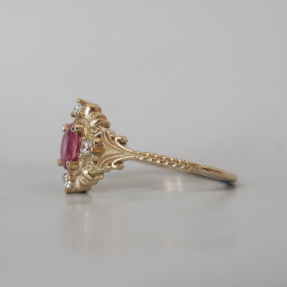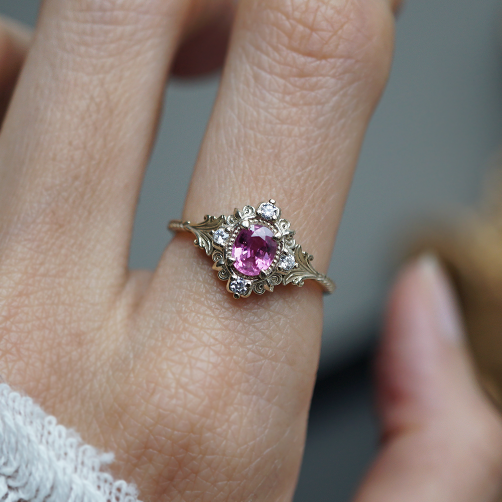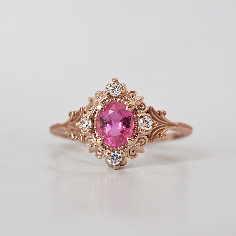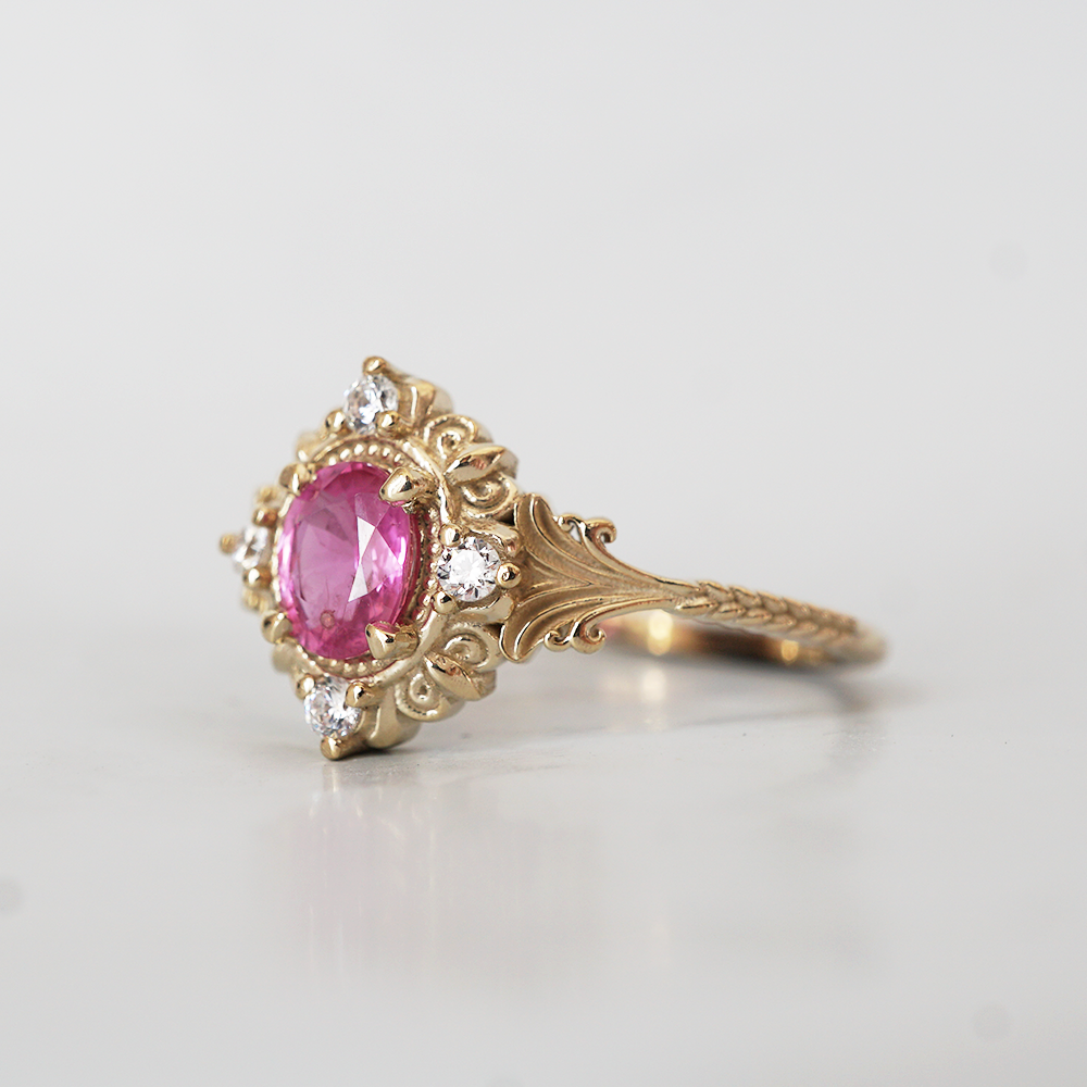 Romantic and radiant, the Seraphina ring captures the elegance of a bygone era. At its center, a vivid pink sapphire glows with warmth and charm, framed by intricate golden filigree and sparkling diamond accents. The ornate detailing on the band adds a timeless vintage touch, evoking the beauty of antique heirlooms. A cherished piece for those drawn to classic romance with a hint of bold color.