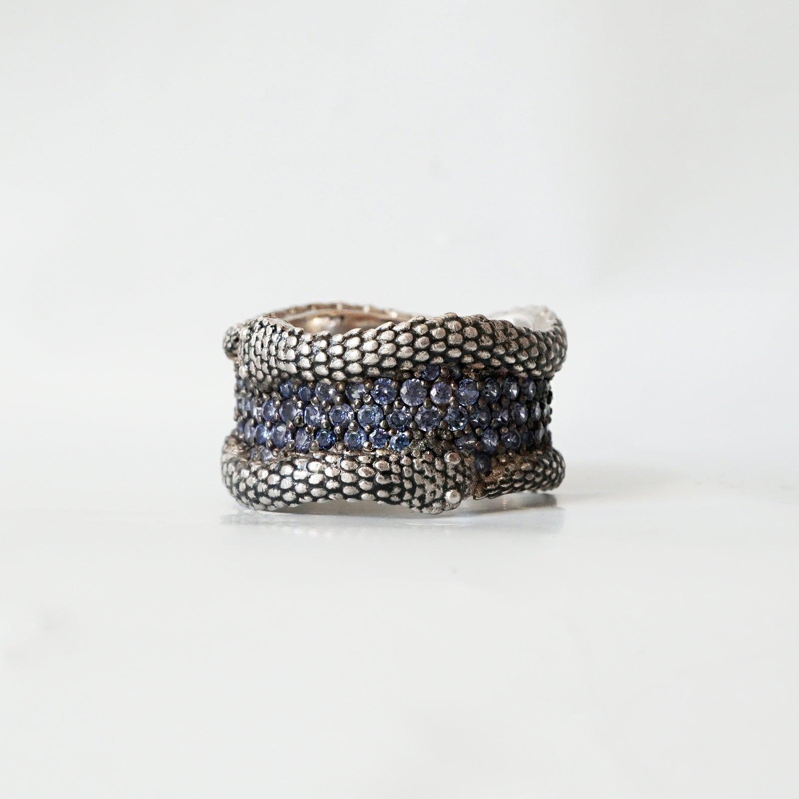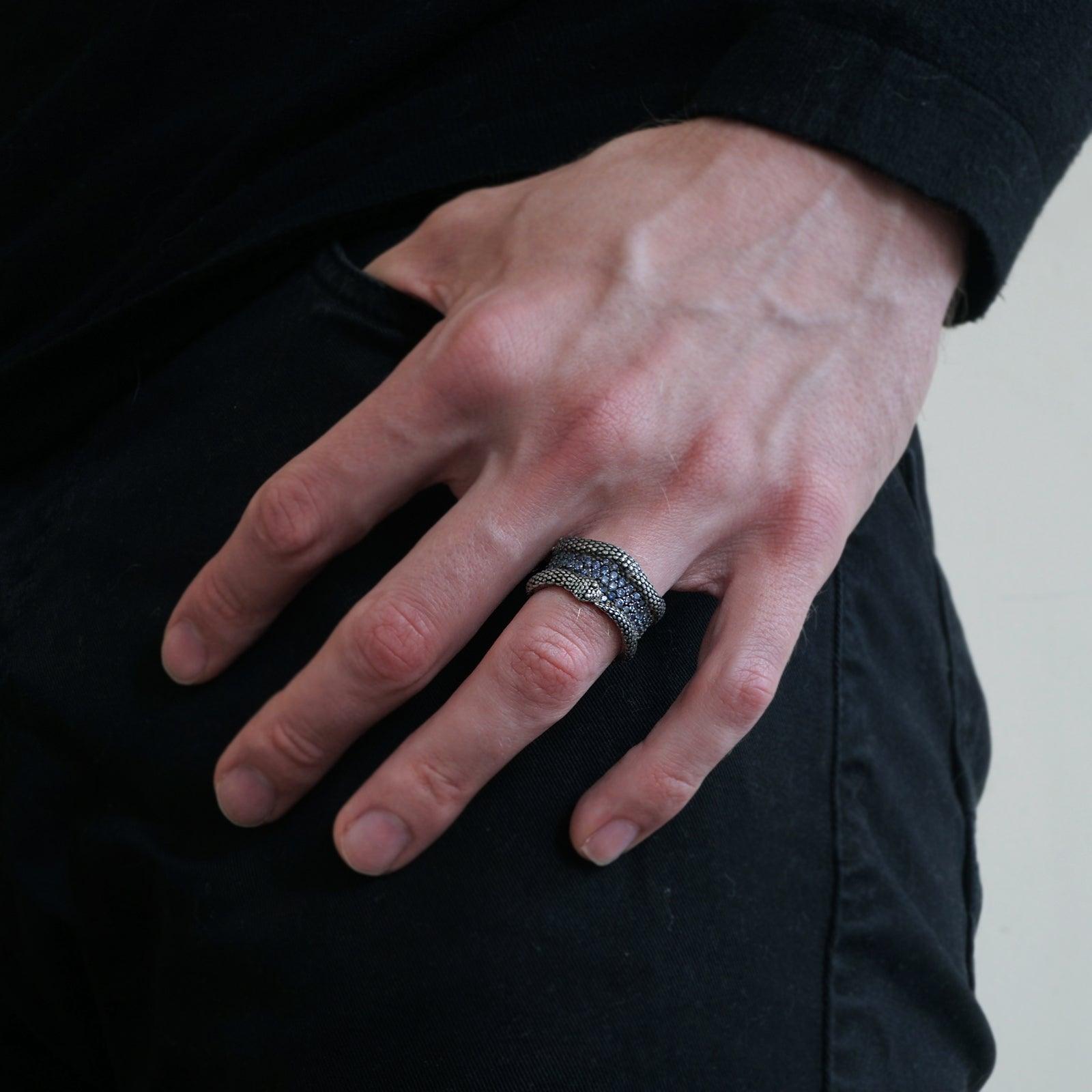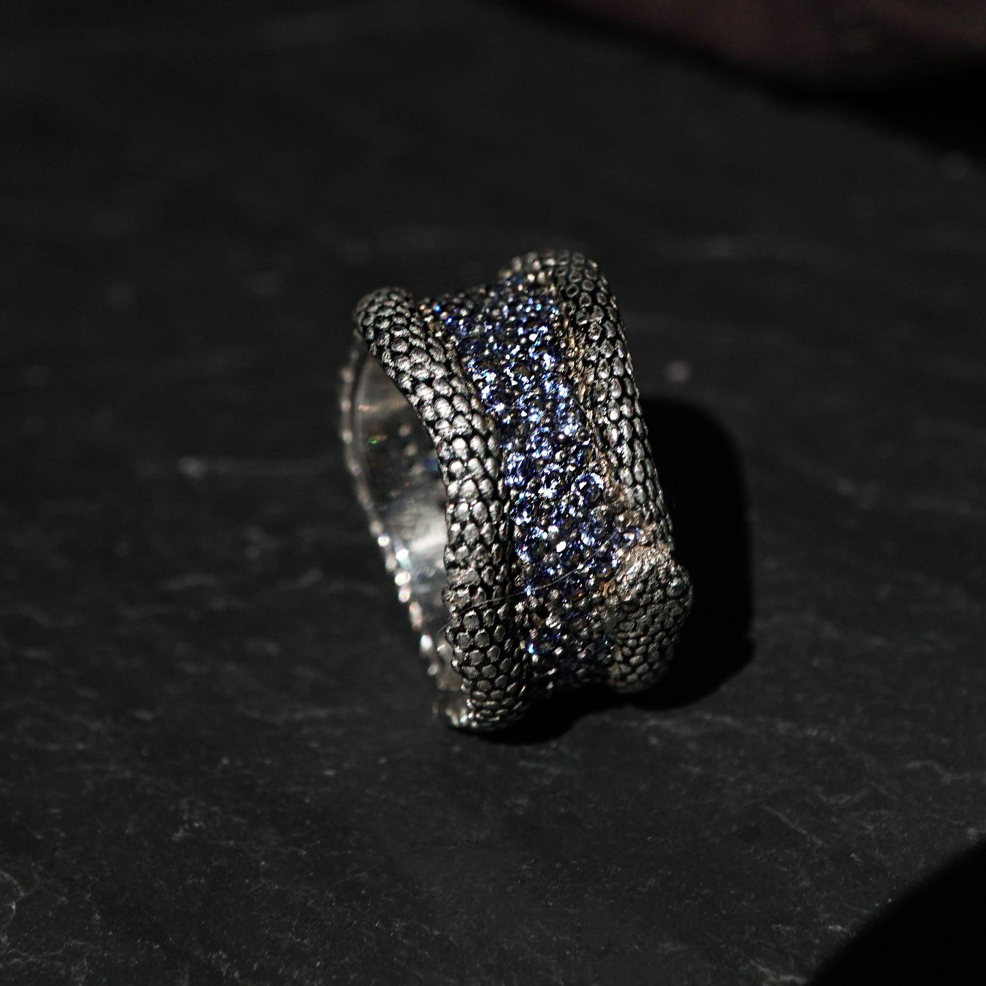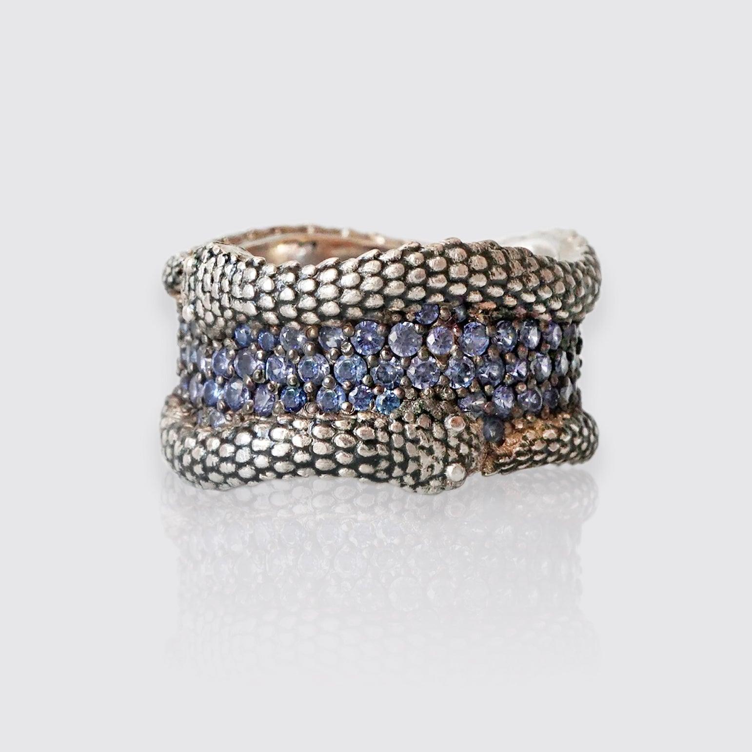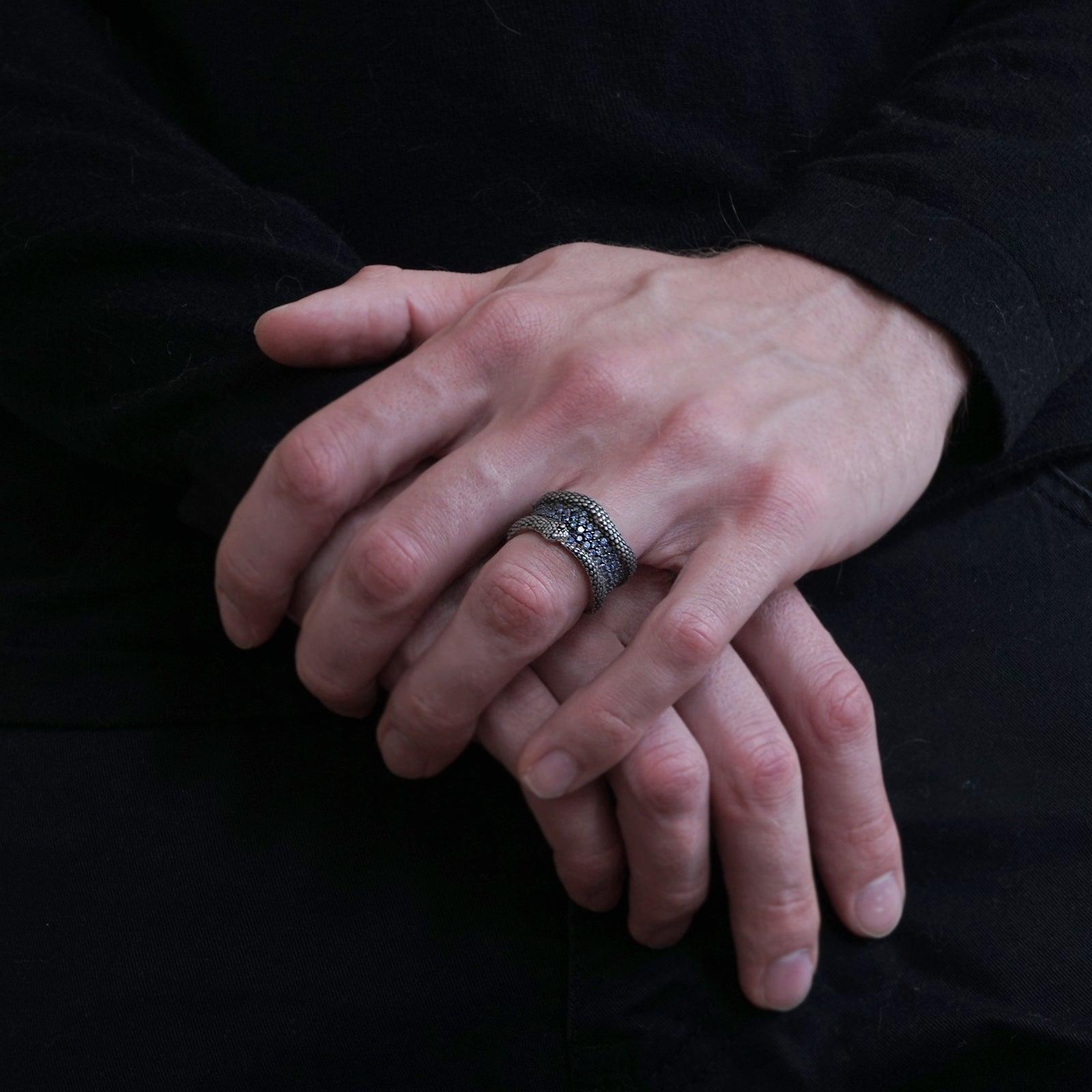 Our majestic Blue Serpent ring is finished with glossy black enamel and 155 blue cubic zirconia. A masterpiece to be passed down for generations. Handcrafted in New York City.