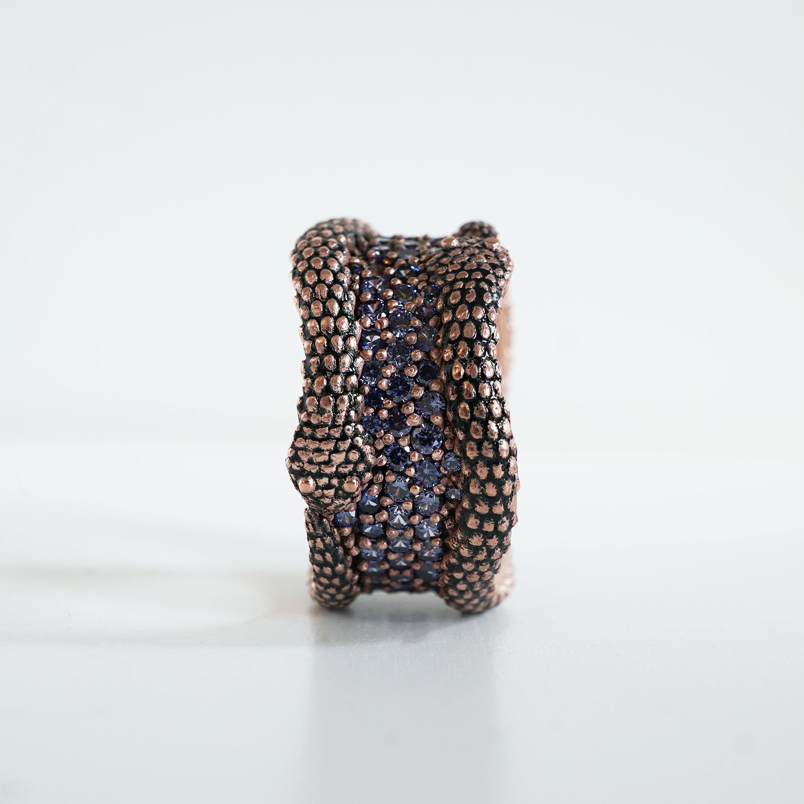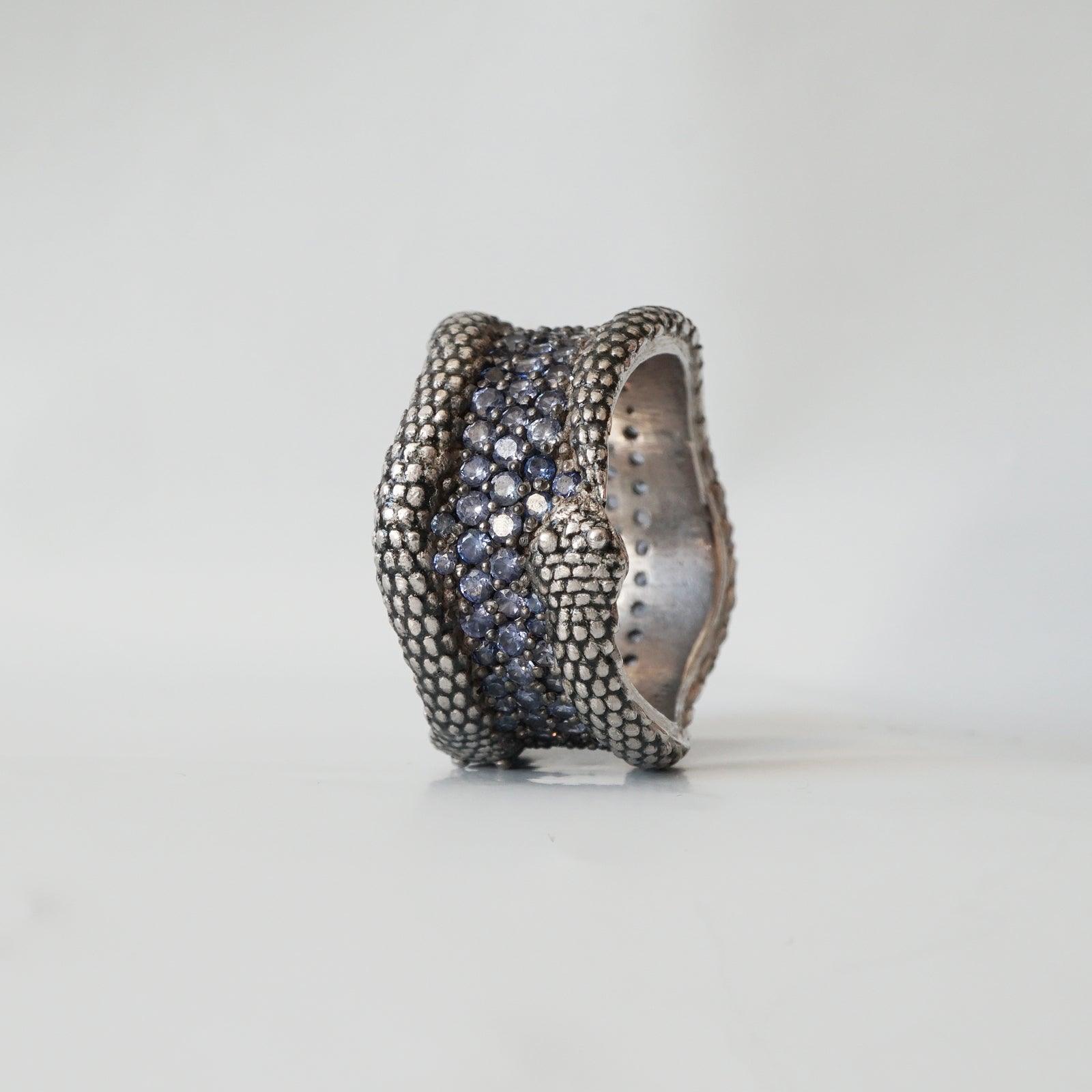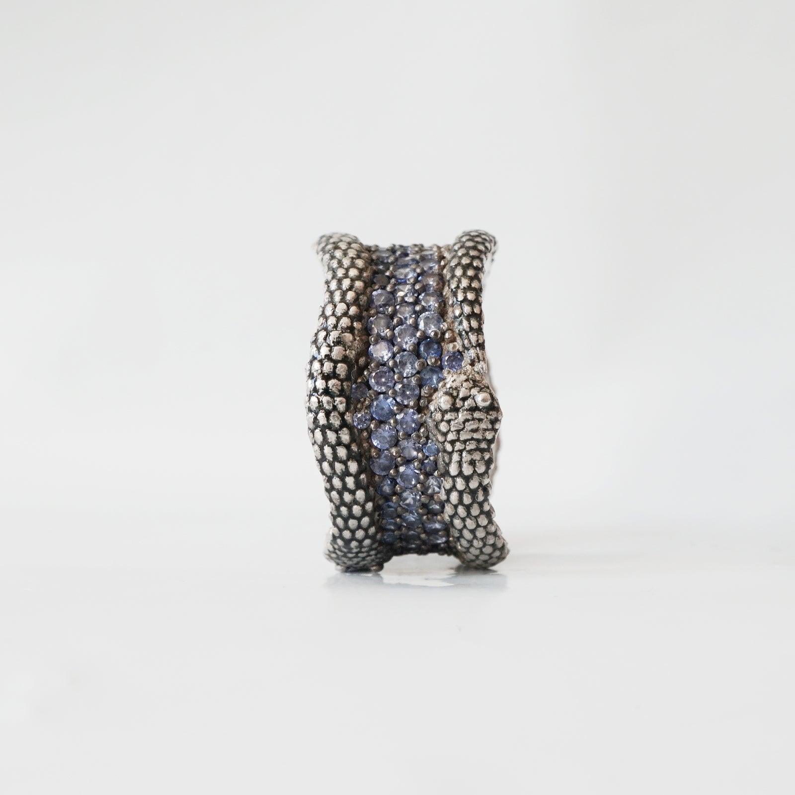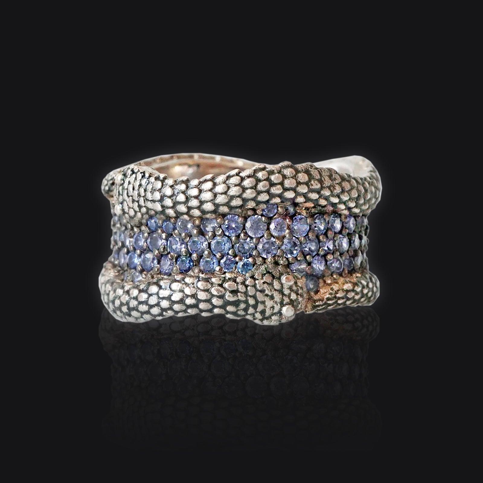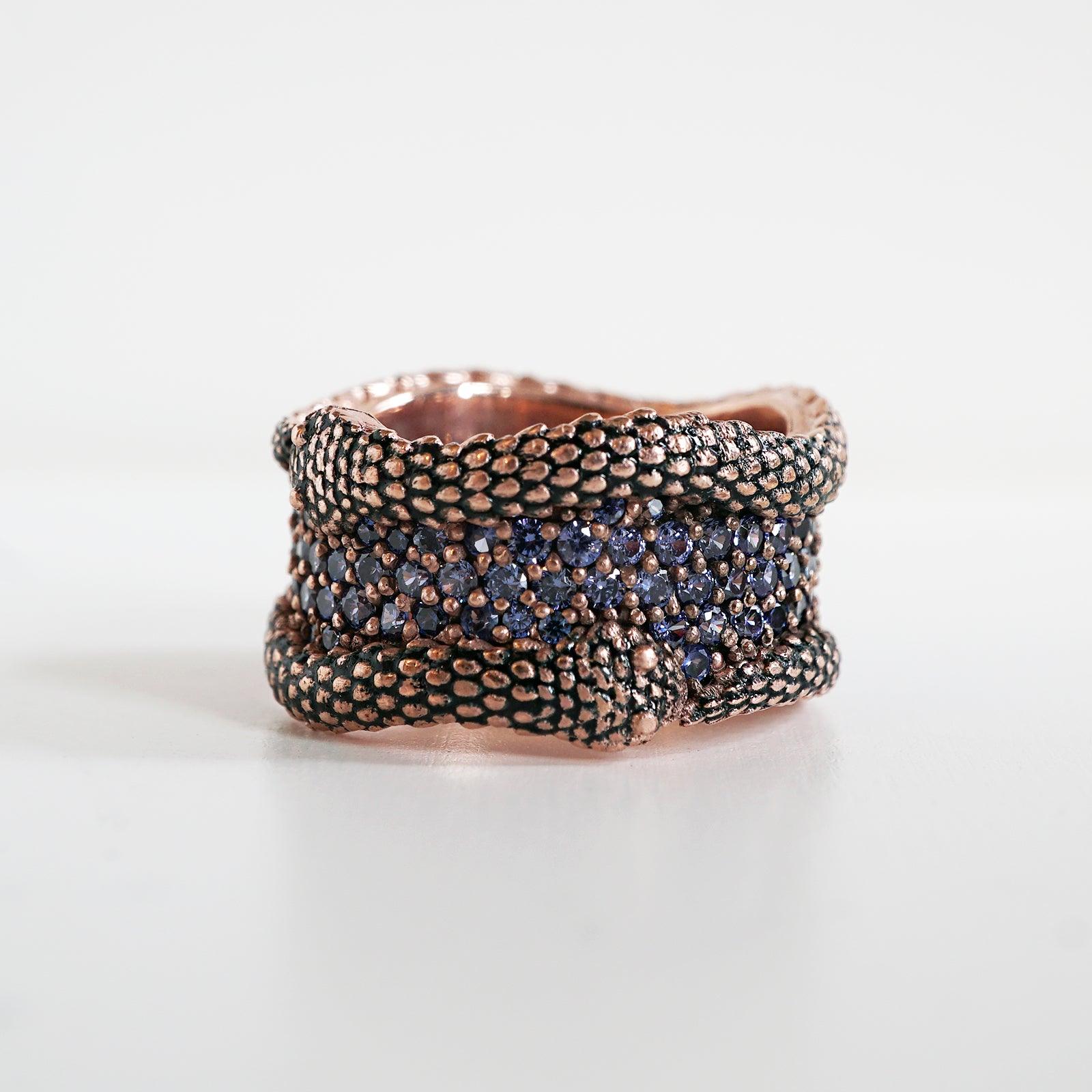 Our majestic Blue Serpent ring is finished with glossy black enamel and 155 blue cubic zirconia. A masterpiece to be passed down for generations. Handcrafted in New York City.