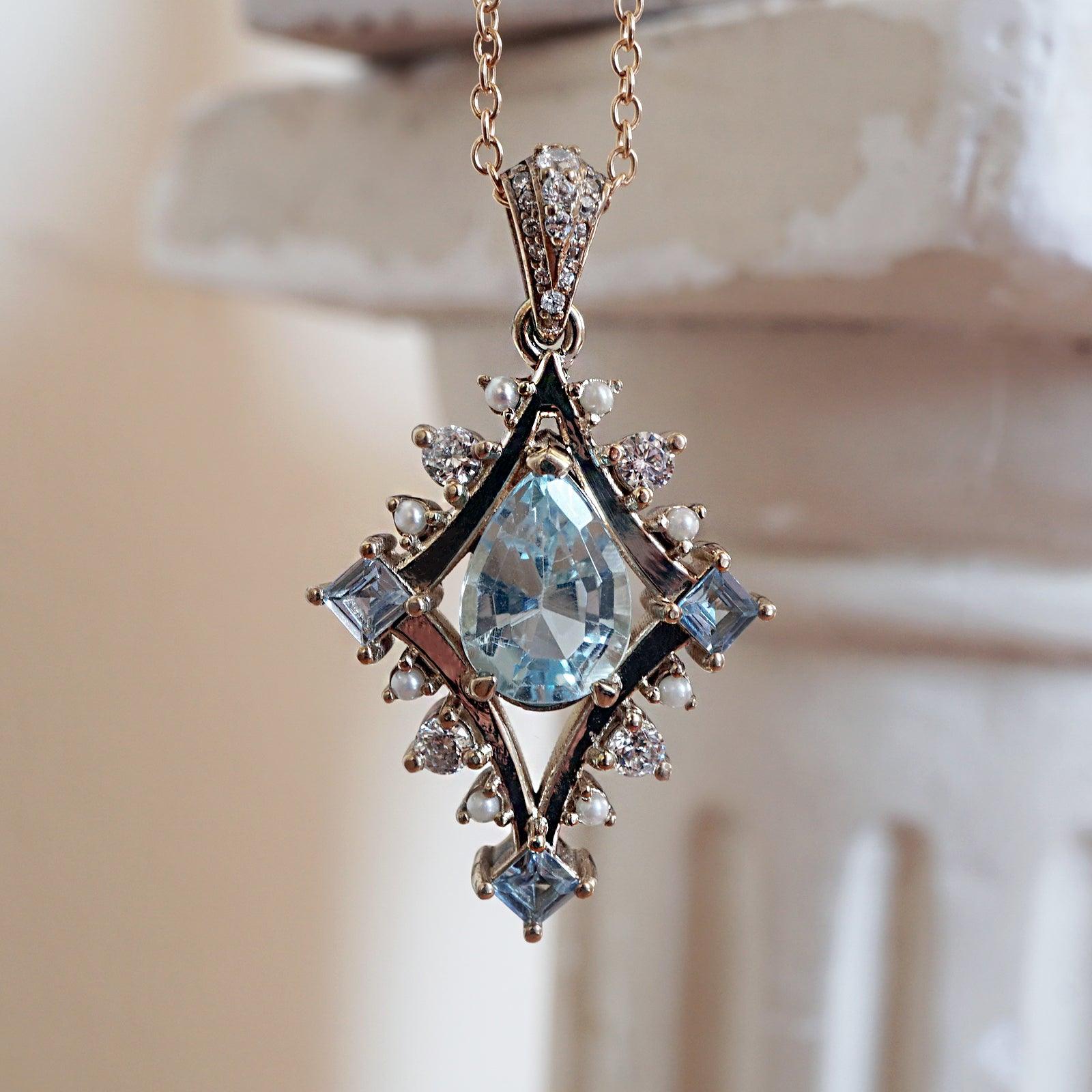 With diamond accents along the bail, princess-cut aquamarines, and delicate pearls, The Sea & Sky Necklace is a poetic ode to the women who carry both grace and strength — as vast and beautiful as the sea itself.