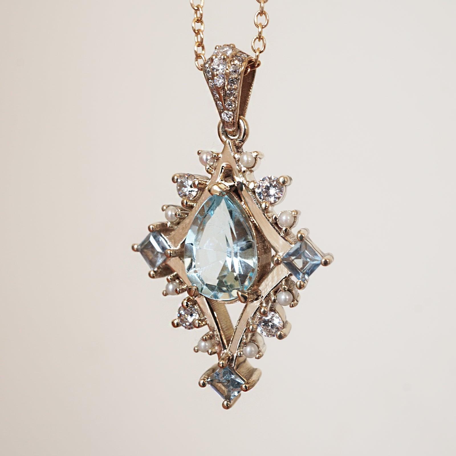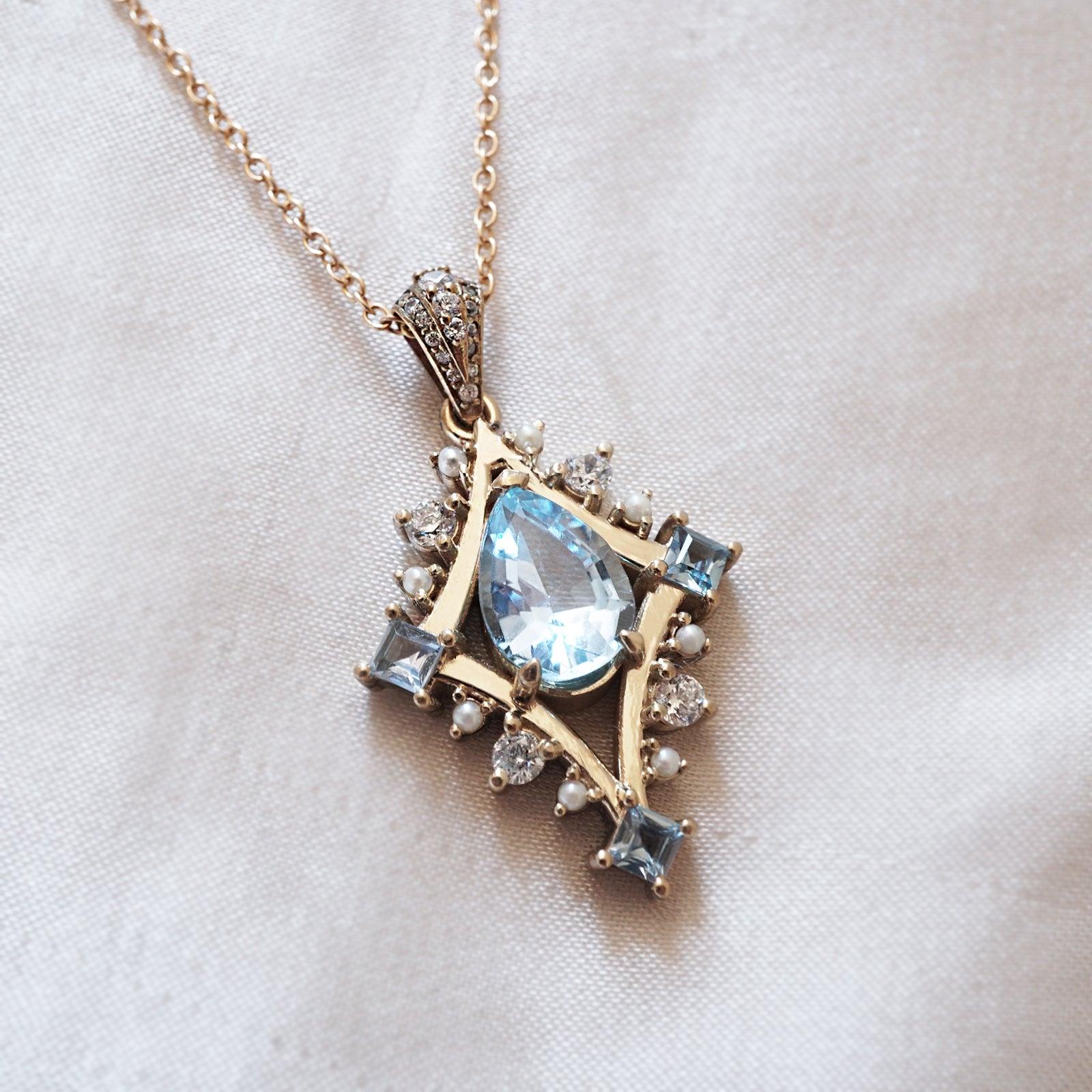 At its heart glows a 1.75ct natural pear shaped aquamarine, serene and luminous as calm ocean light. Framed by natural white diamonds and freshwater pearls, each detail glimmers like sunlight dancing upon gentle waves. Handcrafted in rich 14K solid gold, it’s a treasure meant to be cherished for a lifetime.
