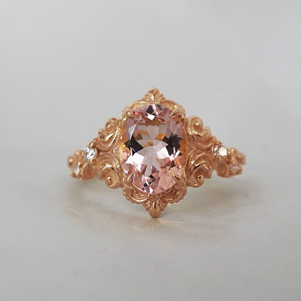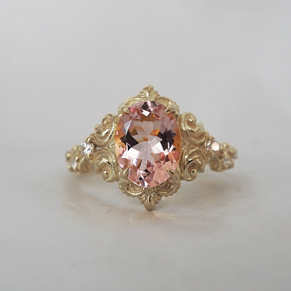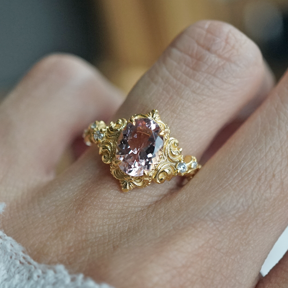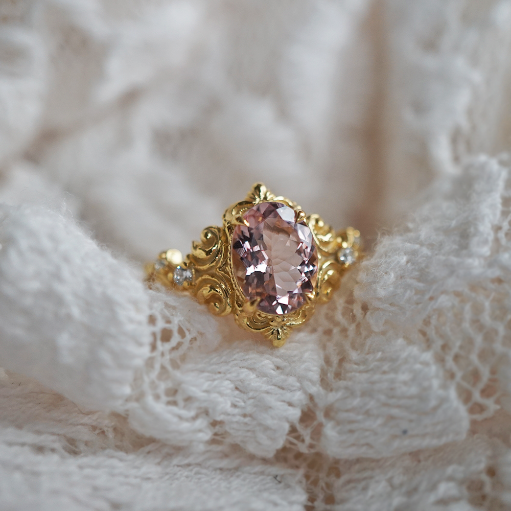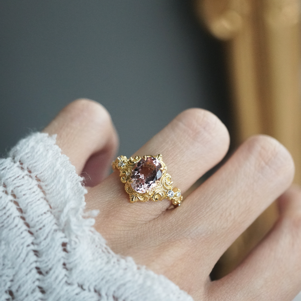 The Whispering Bloom Ring captures the essence of timeless romance and quiet luxury. A natural oval morganite glows with soft blush hues, reminiscent of a sunrise over silk. Cradled in an intricately detailed baroque-inspired gold setting, it is adorned with delicate scrollwork and sparkling diamonds—a poetic balance of grace and refinement.