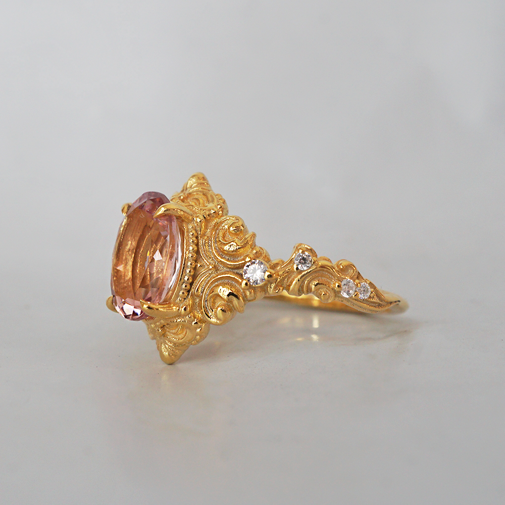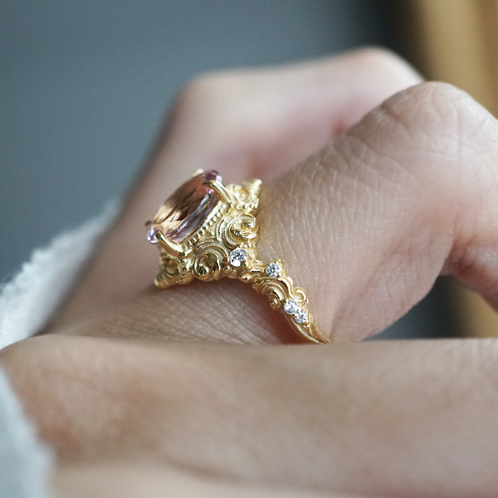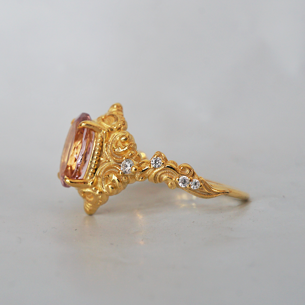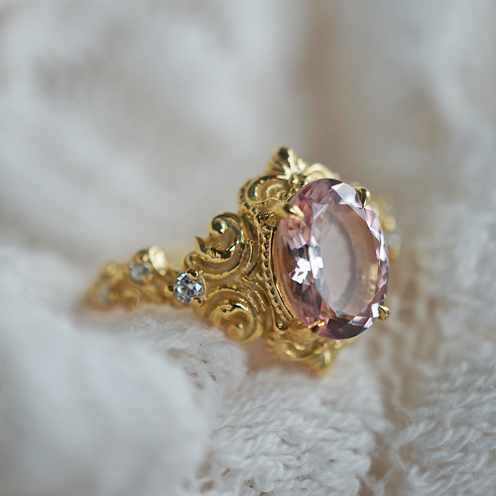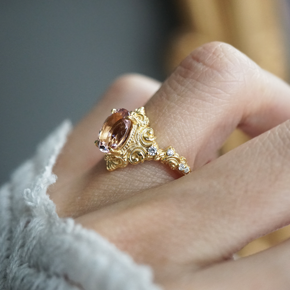 The Whispering Bloom Ring captures the essence of timeless romance and quiet luxury. A natural oval morganite glows with soft blush hues, reminiscent of a sunrise over silk. Cradled in an intricately detailed baroque-inspired gold setting, it is adorned with delicate scrollwork and sparkling diamonds—a poetic balance of grace and refinement.