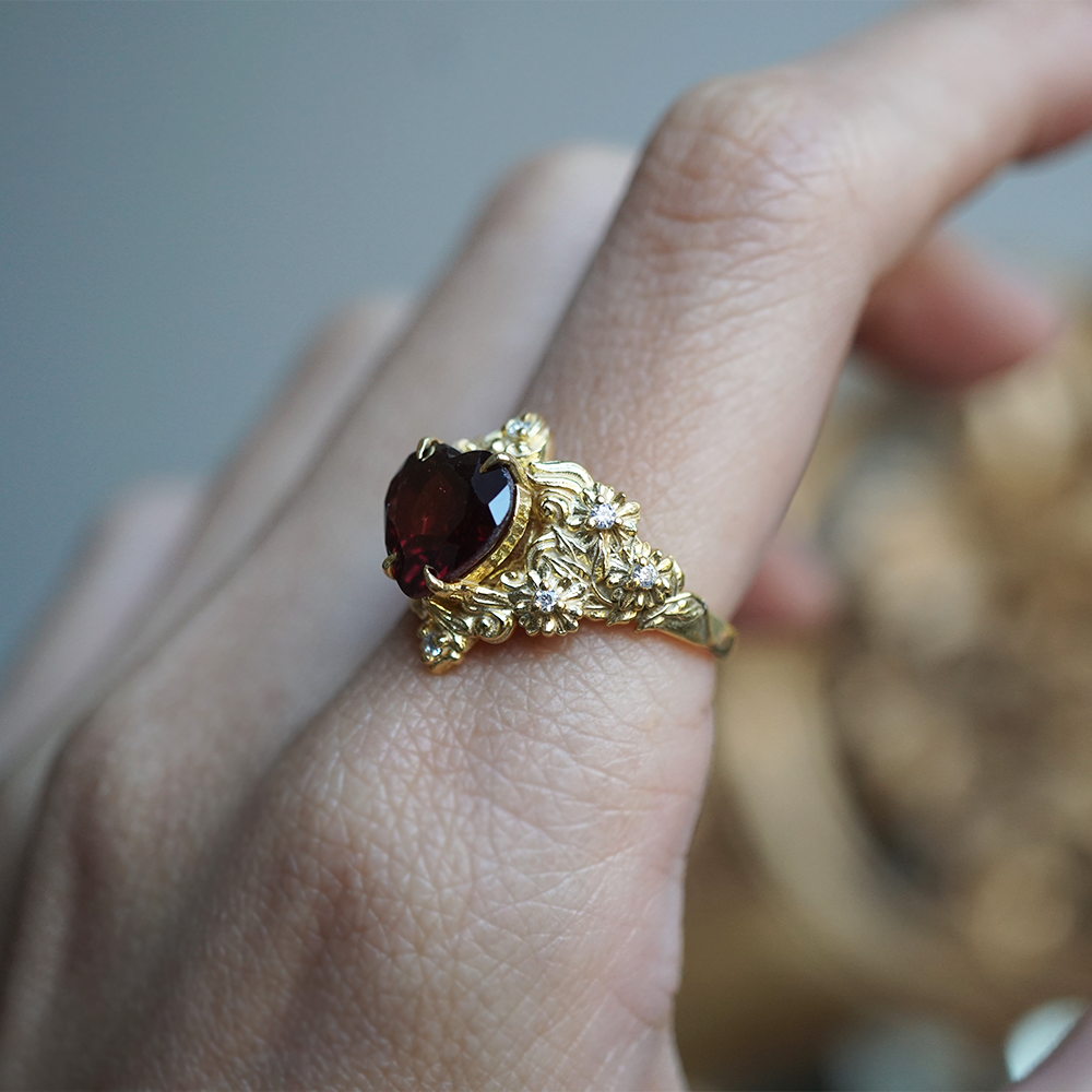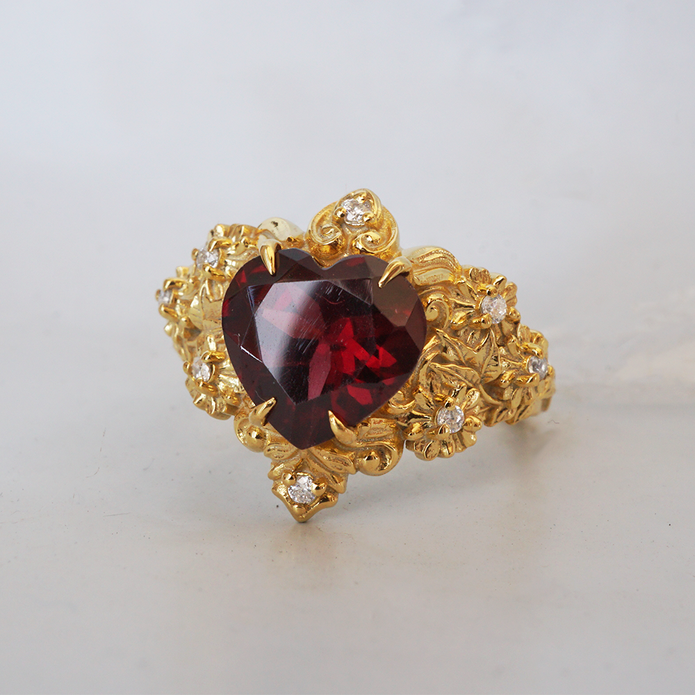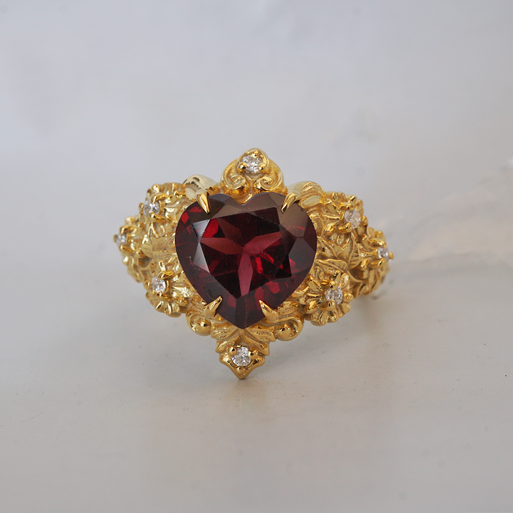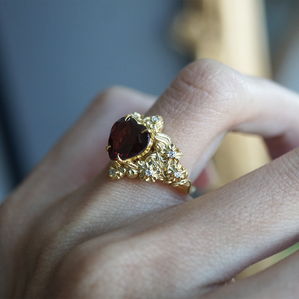 Introducing the Rosetta Heart Ring, a captivating creation that brings old-world romance to life. At its center lies a deep garnet heart, set within an intricately sculpted gold band, the design is adorned with delicate floral accents and sparkling diamond details, exuding timeless elegance and passion. A true heirloom piece that celebrates love in its most poetic form.