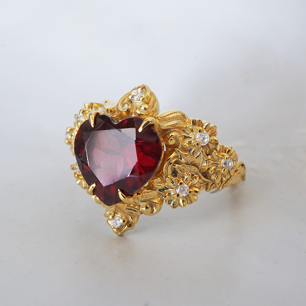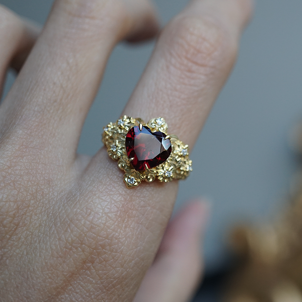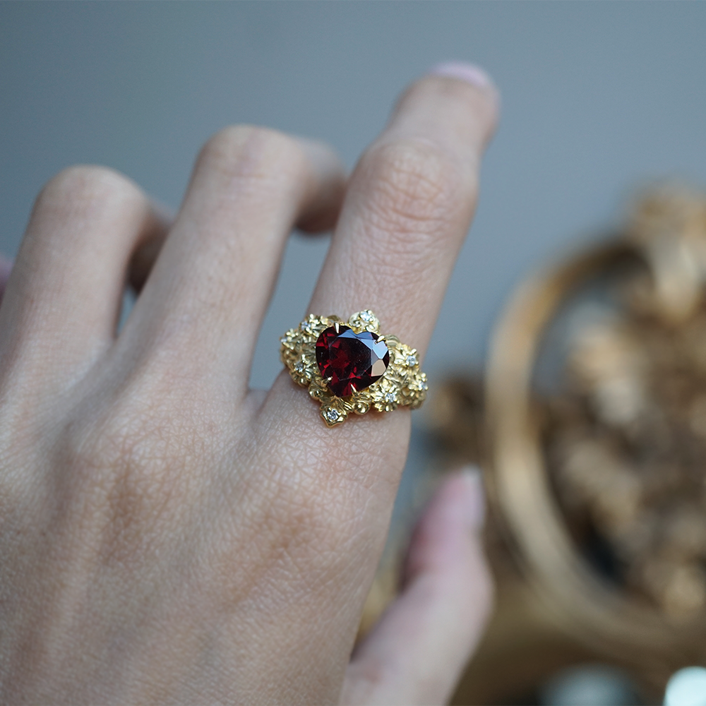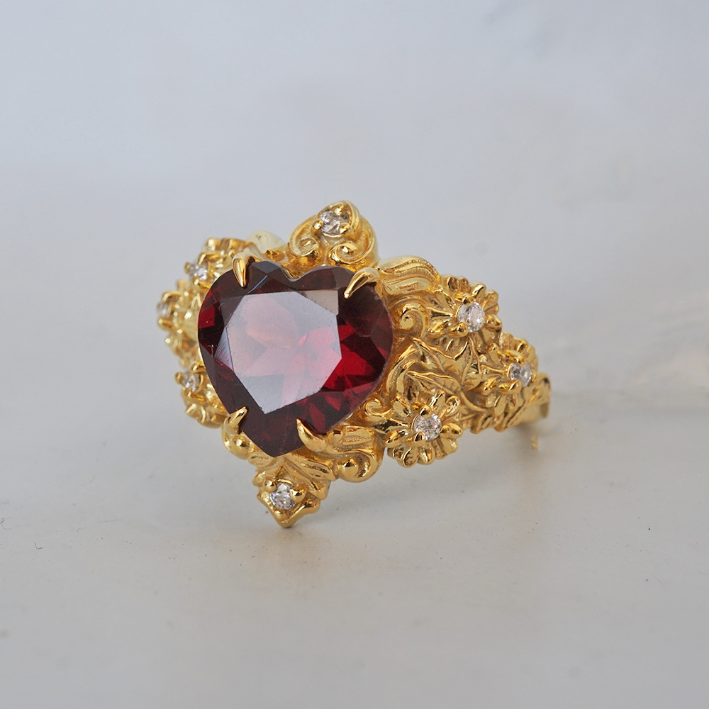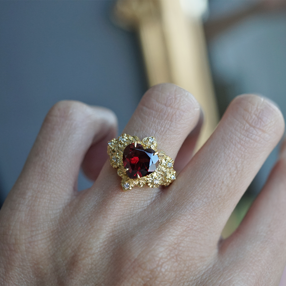 Introducing the Rosetta Heart Ring, a captivating creation that brings old-world romance to life. At its center lies a deep garnet heart, set within an intricately sculpted gold band, the design is adorned with delicate floral accents and sparkling diamond details, exuding timeless elegance and passion. A true heirloom piece that celebrates love in its most poetic form.