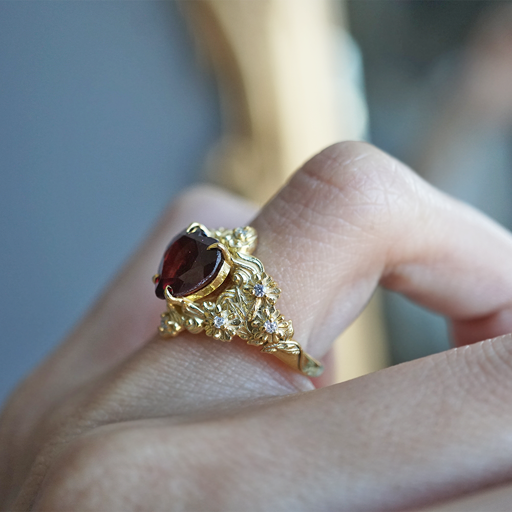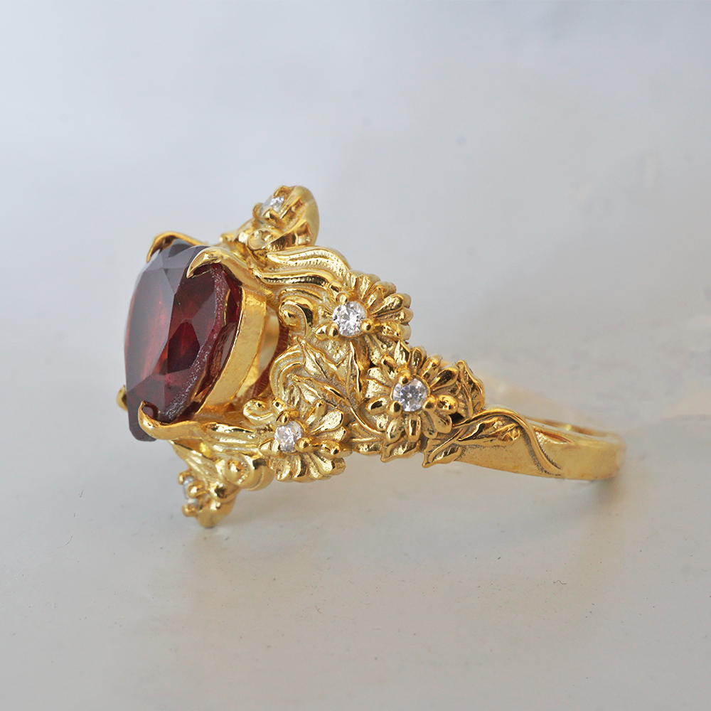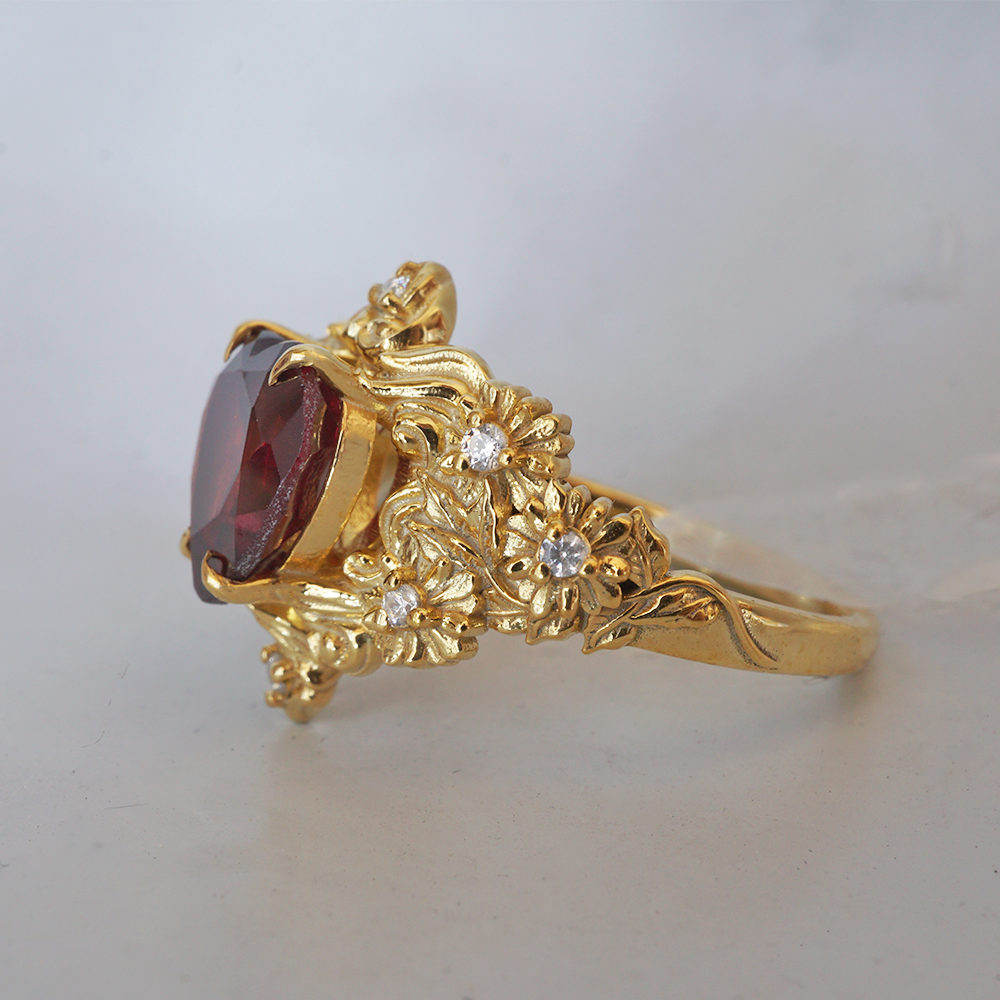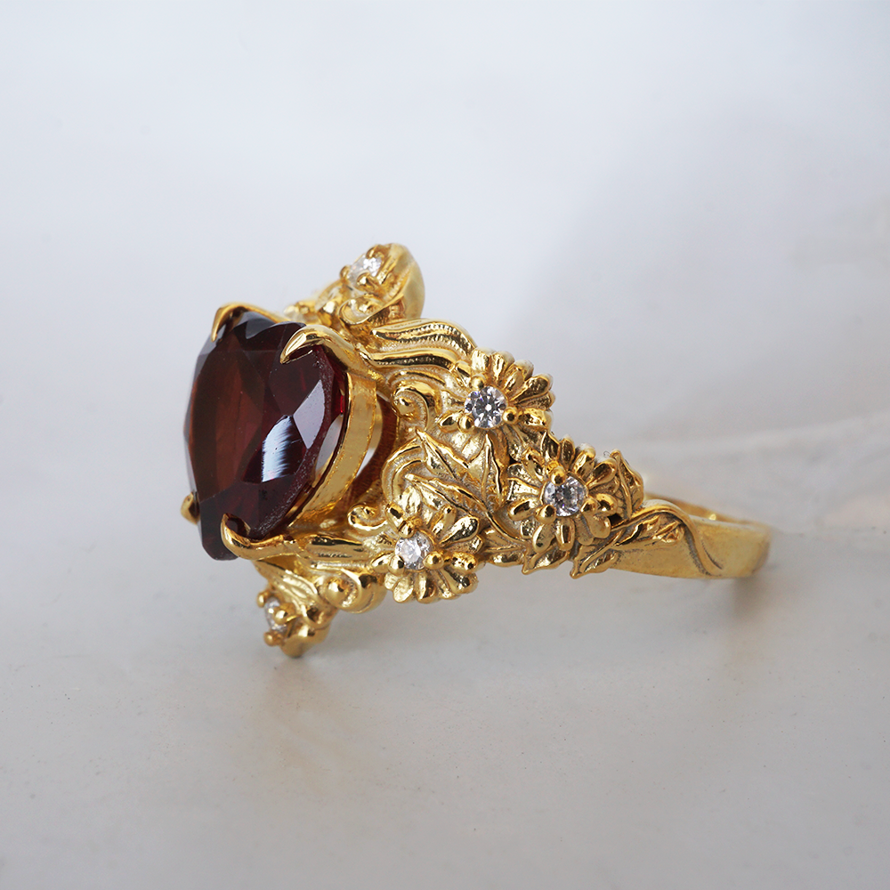 Introducing the Rosetta Heart Ring, a captivating creation that brings old-world romance to life. At its center lies a deep garnet heart, set within an intricately sculpted gold band, the design is adorned with delicate floral accents and sparkling diamond details, exuding timeless elegance and passion. A true heirloom piece that celebrates love in its most poetic form.