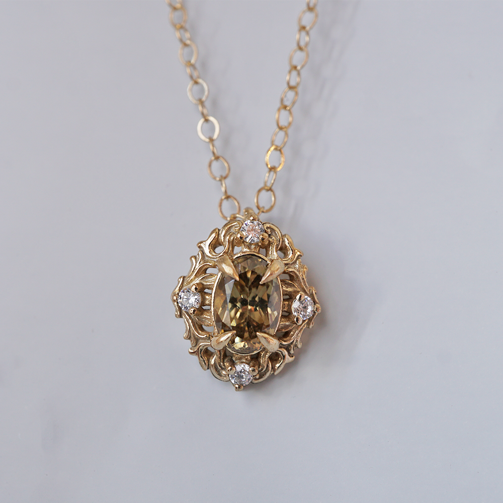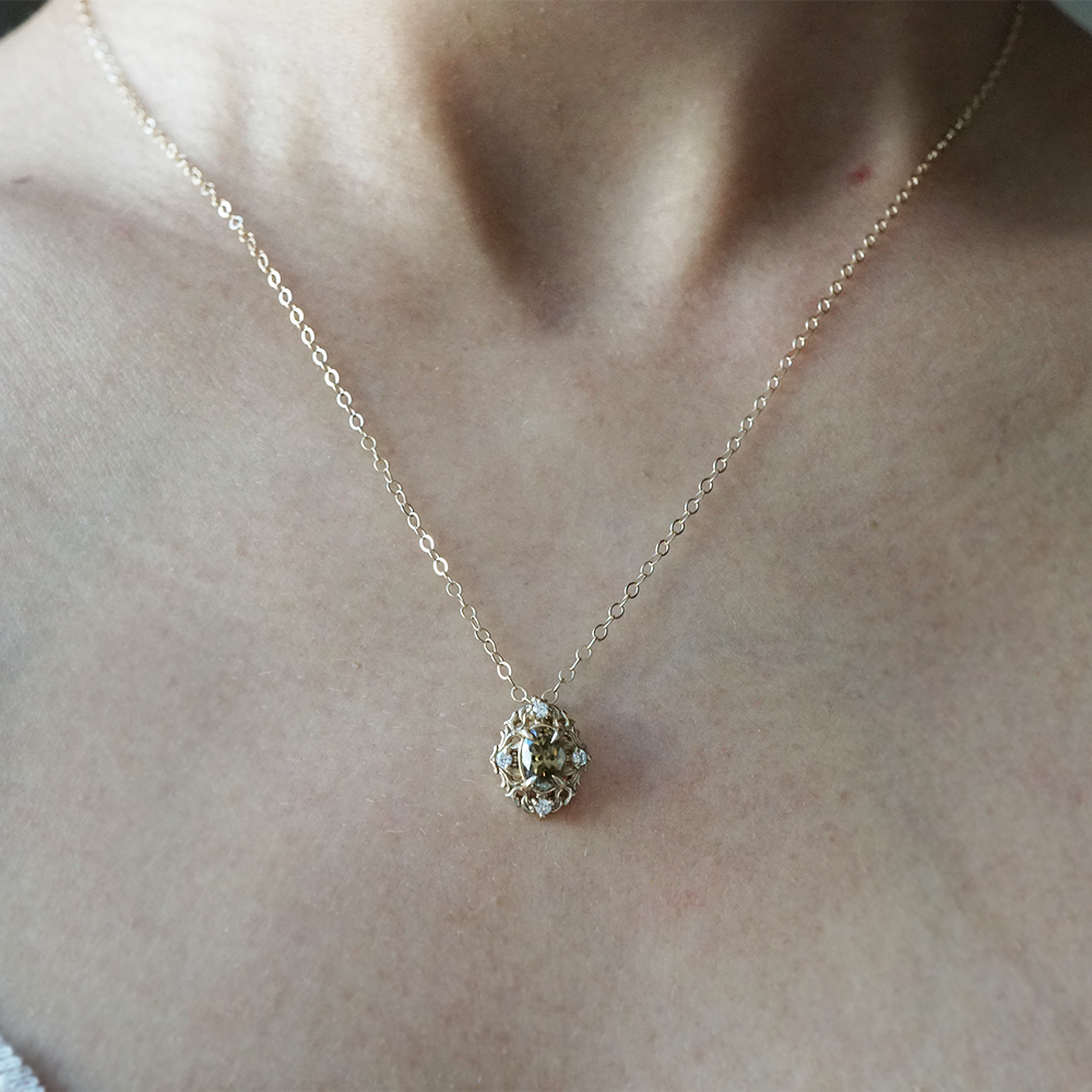 Handcrafted in New York City, this necklace is available in 14K solid gold. Its deep, moody hues and vintage-inspired setting make it the perfect piece for dreamers and old souls who cherish artistry and subtle sophistication.