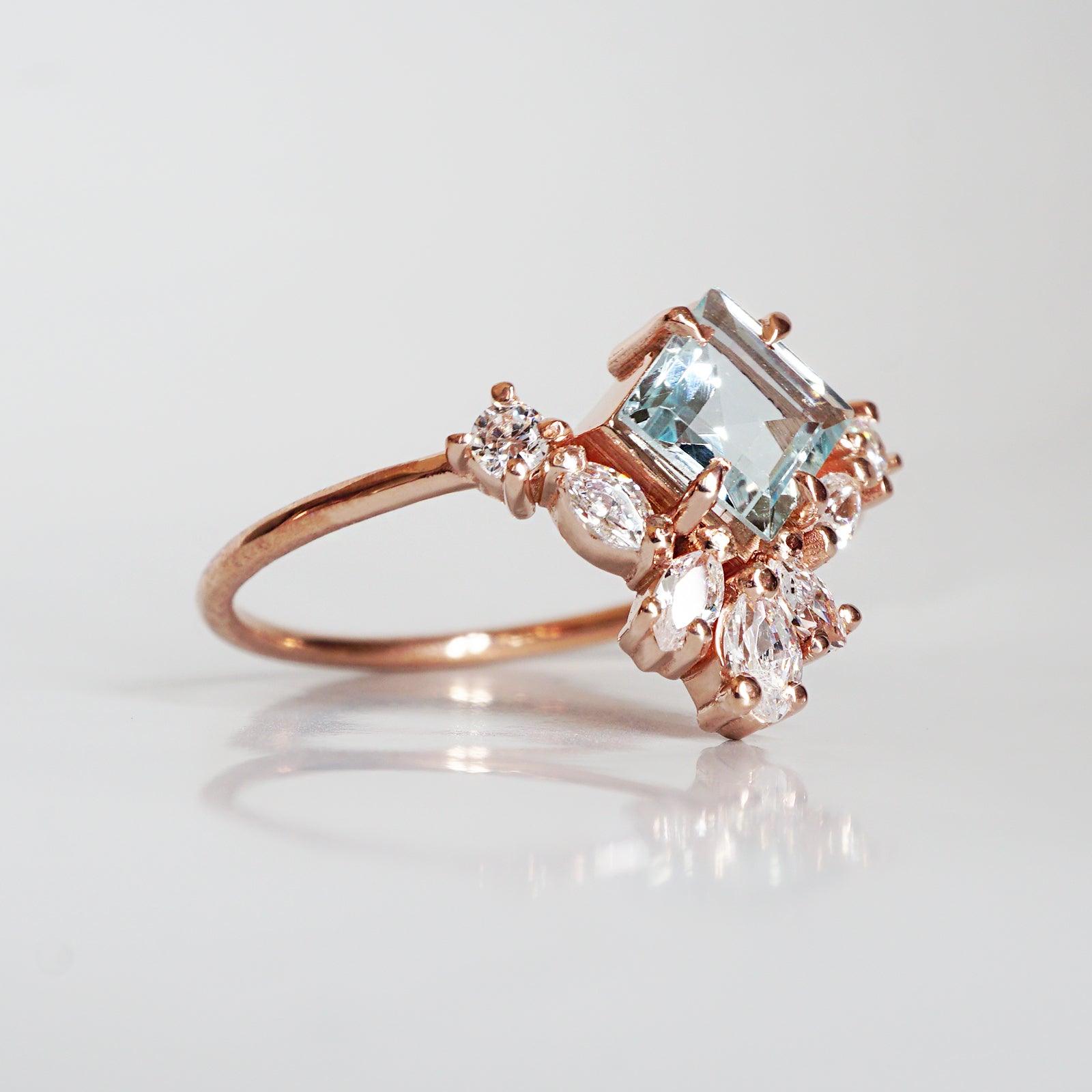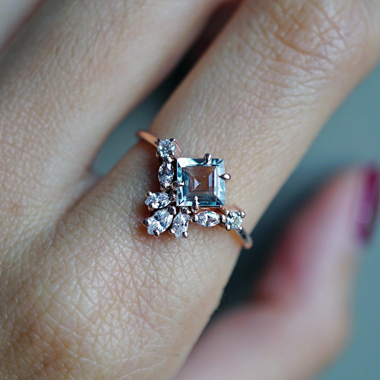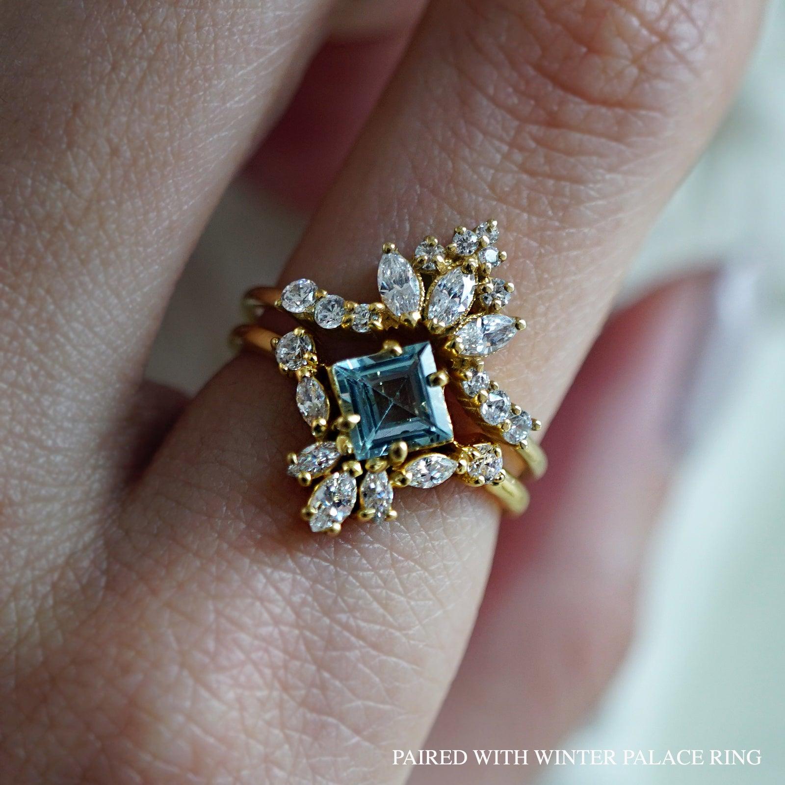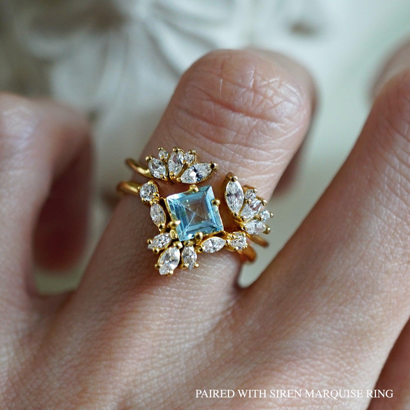 Indulge yourself in the serene beauty of the Aquamarine Lily ring. Featuring a natural princess cut Aquamarine surrounded by a mix of sparkly marquise and round CZ.