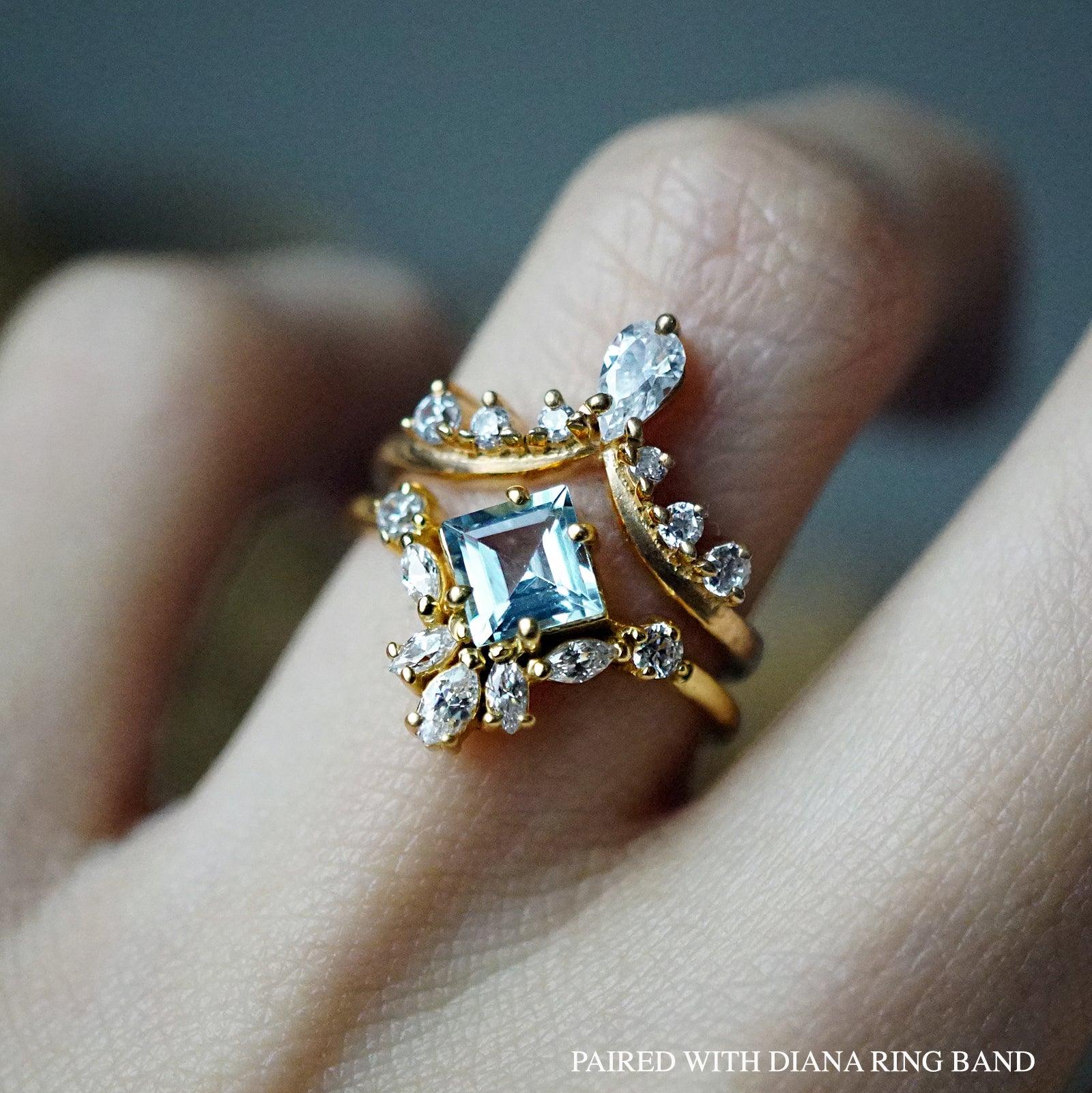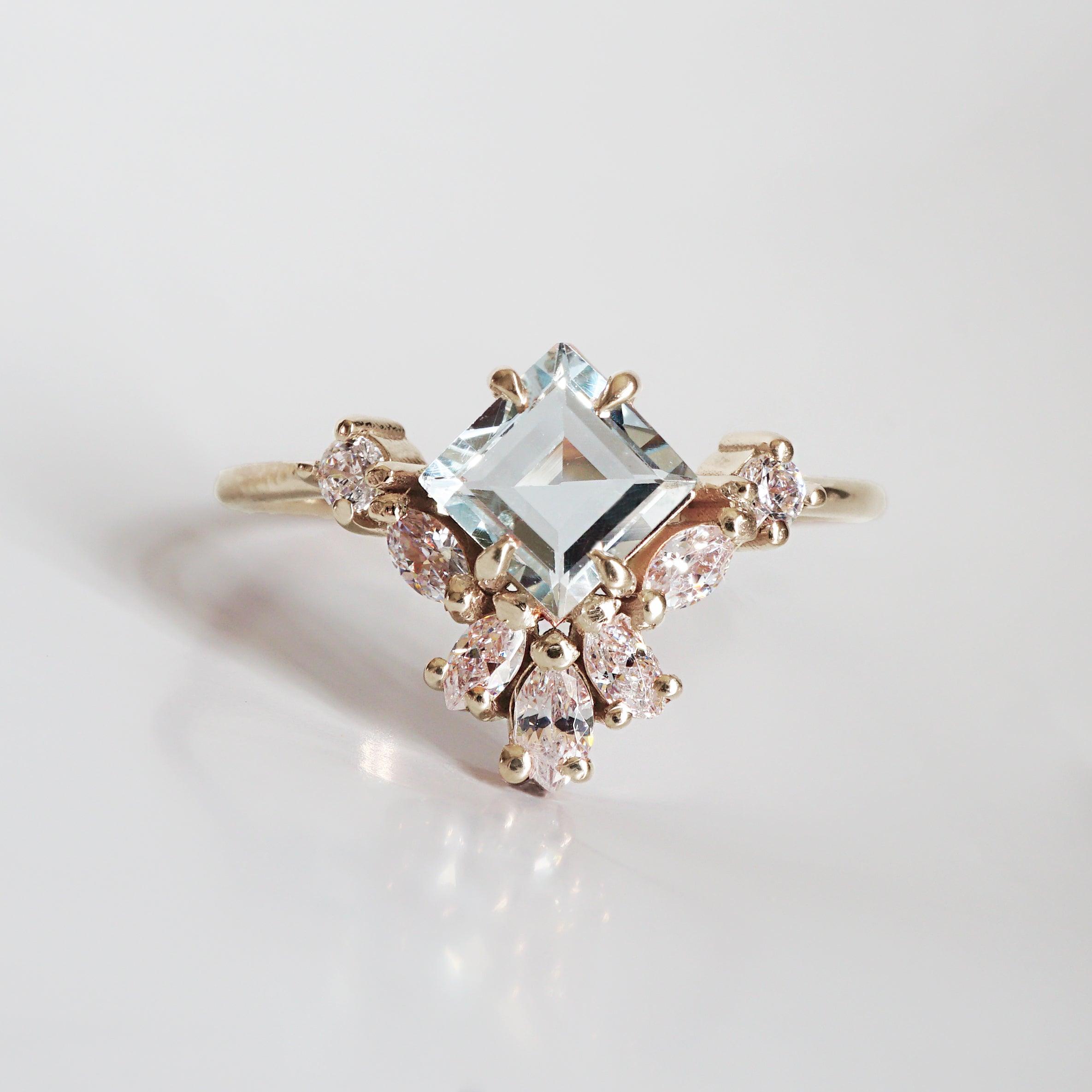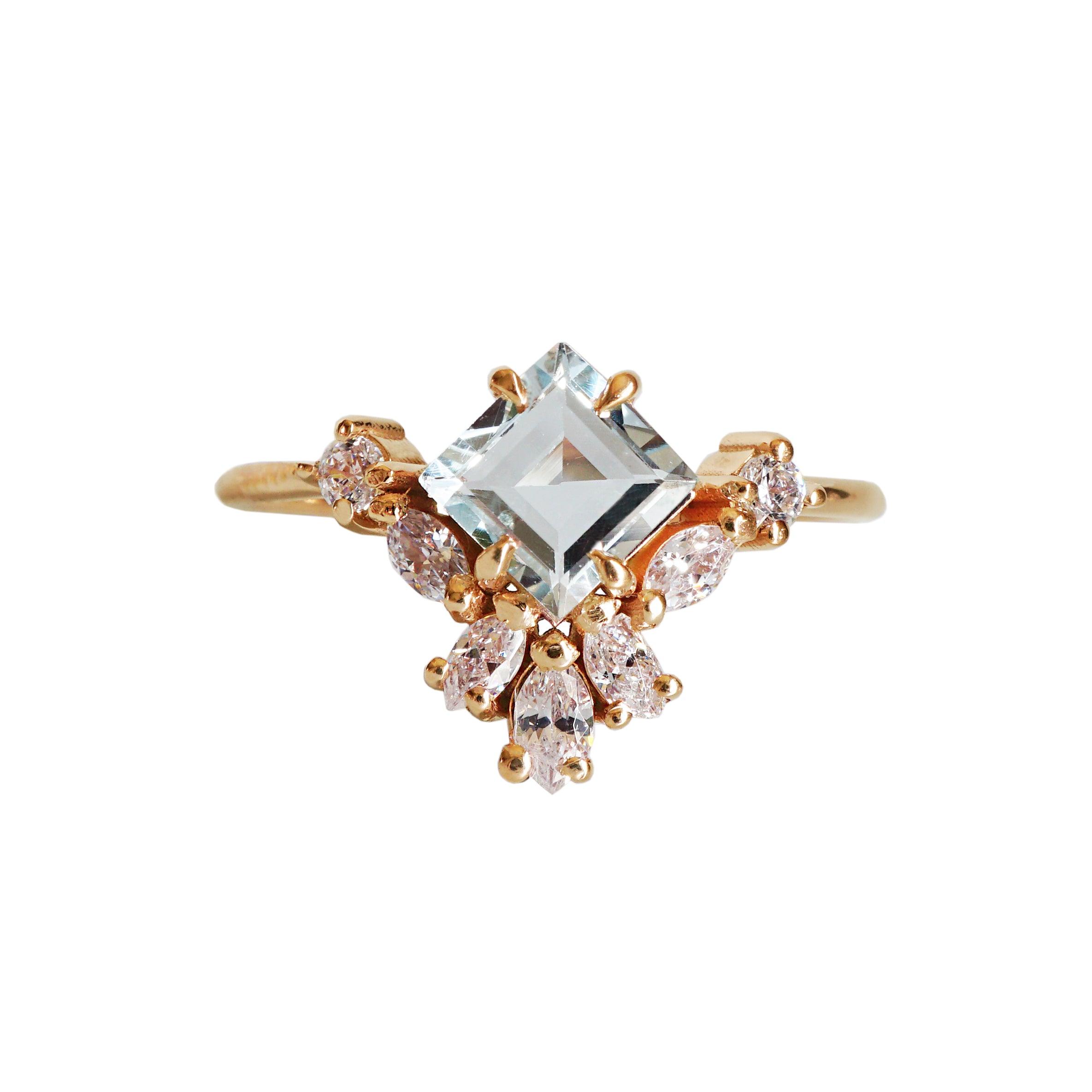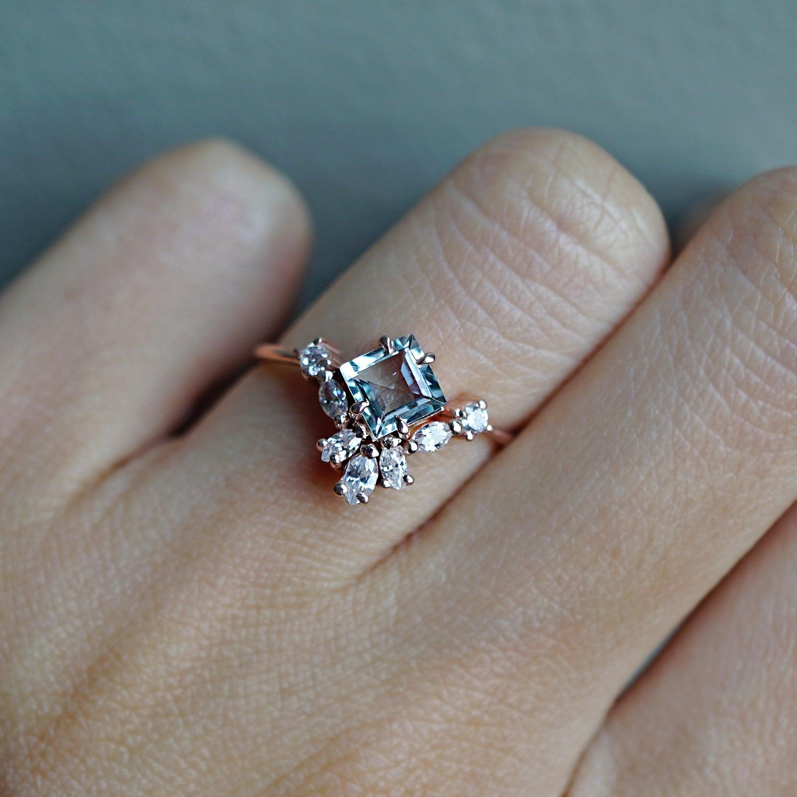 Indulge yourself in the serene beauty of the Aquamarine Lily ring. Featuring a natural princess cut Aquamarine surrounded by a mix of sparkly marquise and round CZ.