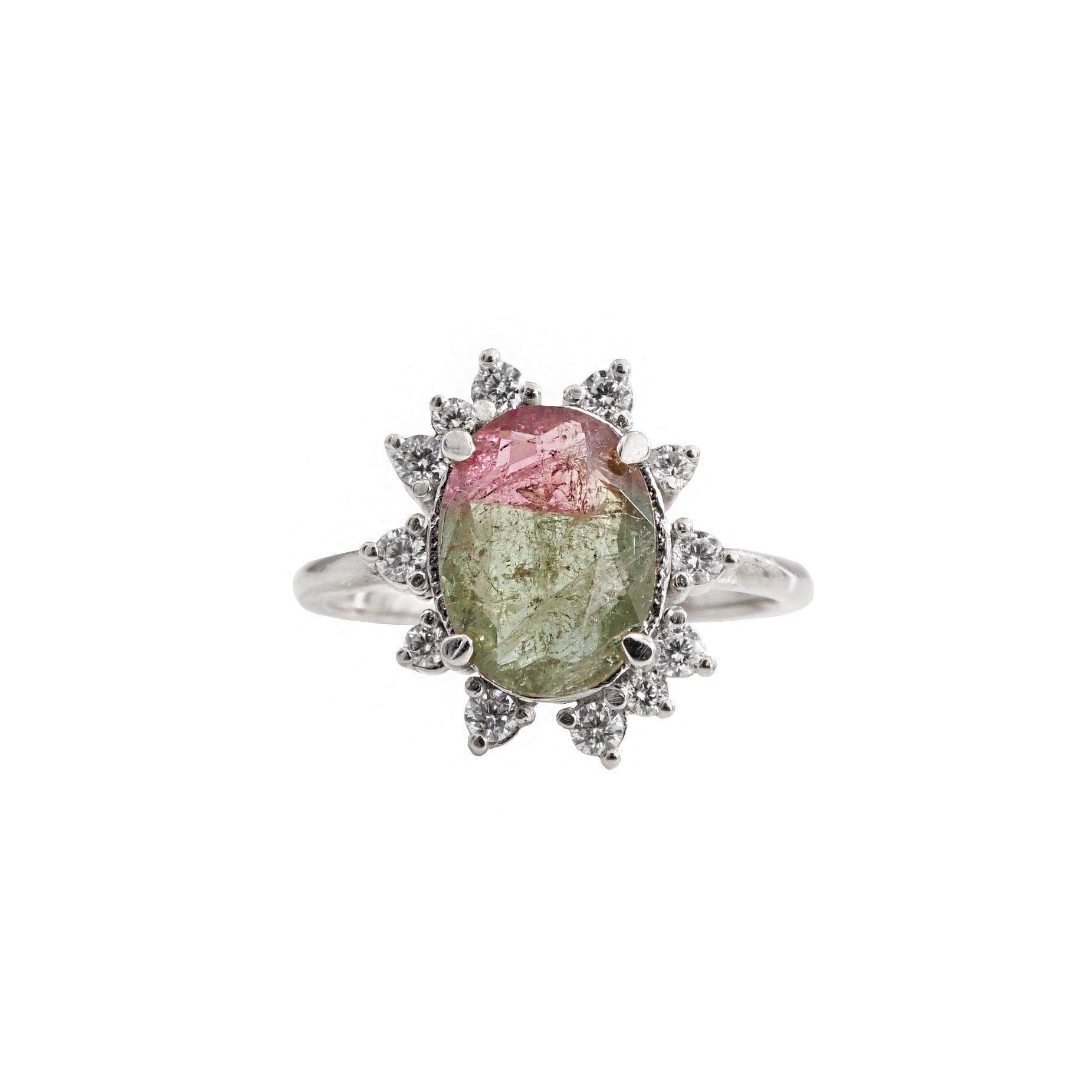 A delicious and refreshing watermelon tourmaline is set in a 14K and 18K solid gold setting surrounded by sparkly white diamonds. No two watermelon tourmaline is alike which makes this piece even more unique. Simple and classic for everyday wear or as a ceremonial piece. This ring is designed and made in New York City.
