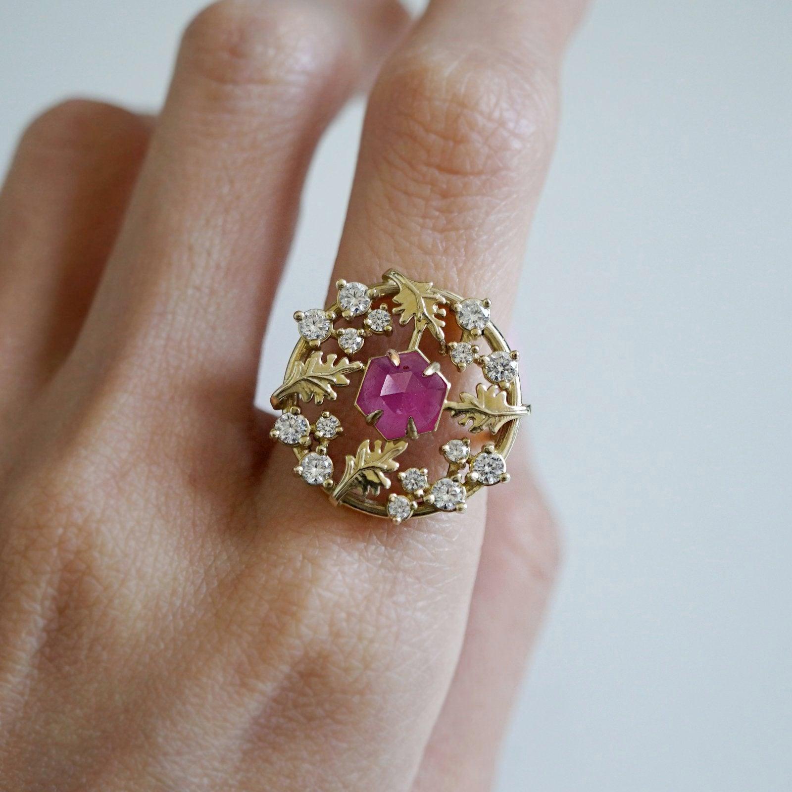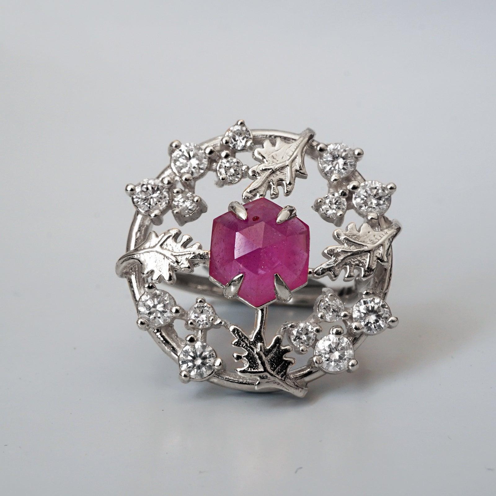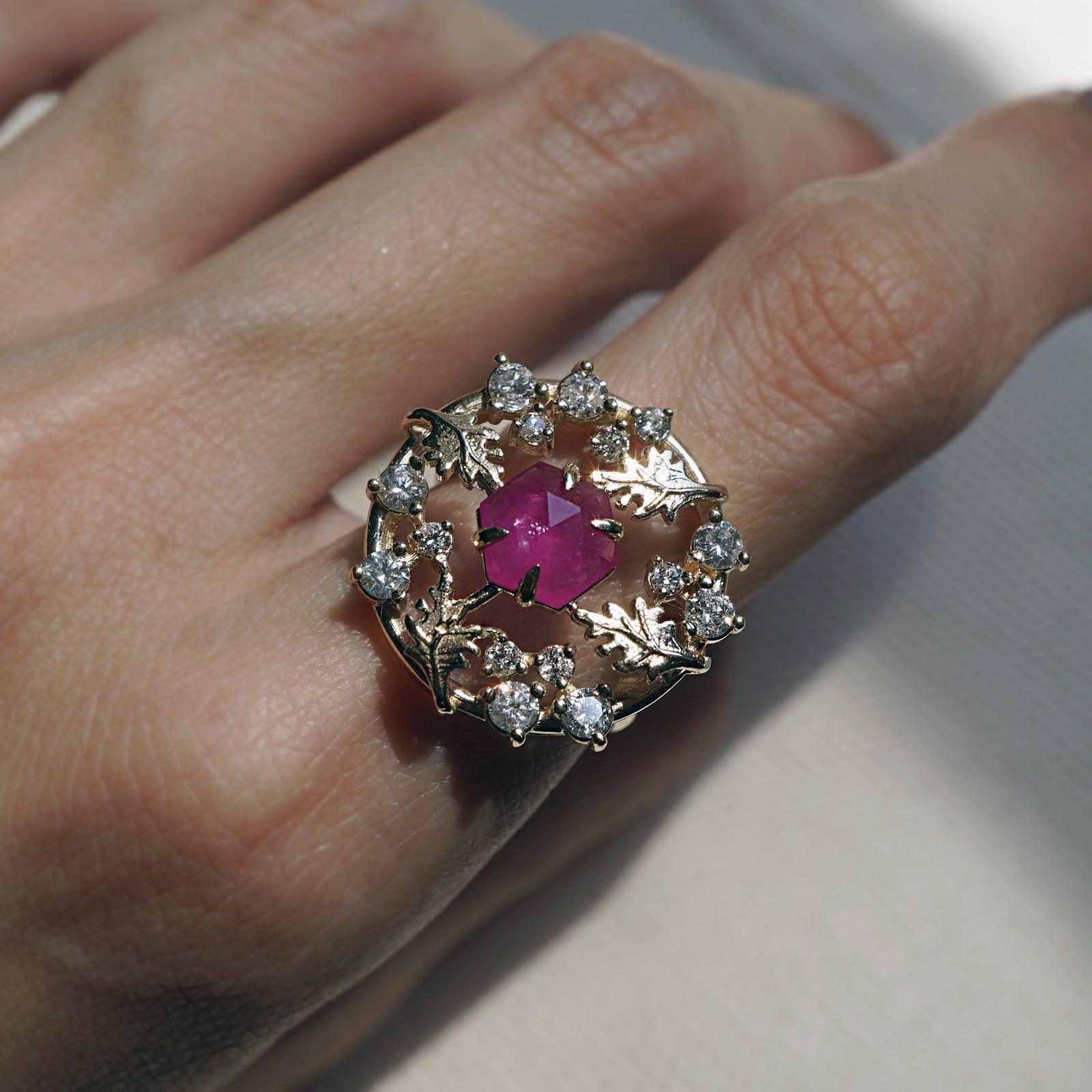 This one-of-a-kind ring is embellished with natural white diamonds like stars and features a stunning custom-cut hexagon-shaped natural ruby. This ring is designed and handcrafted in New York City.