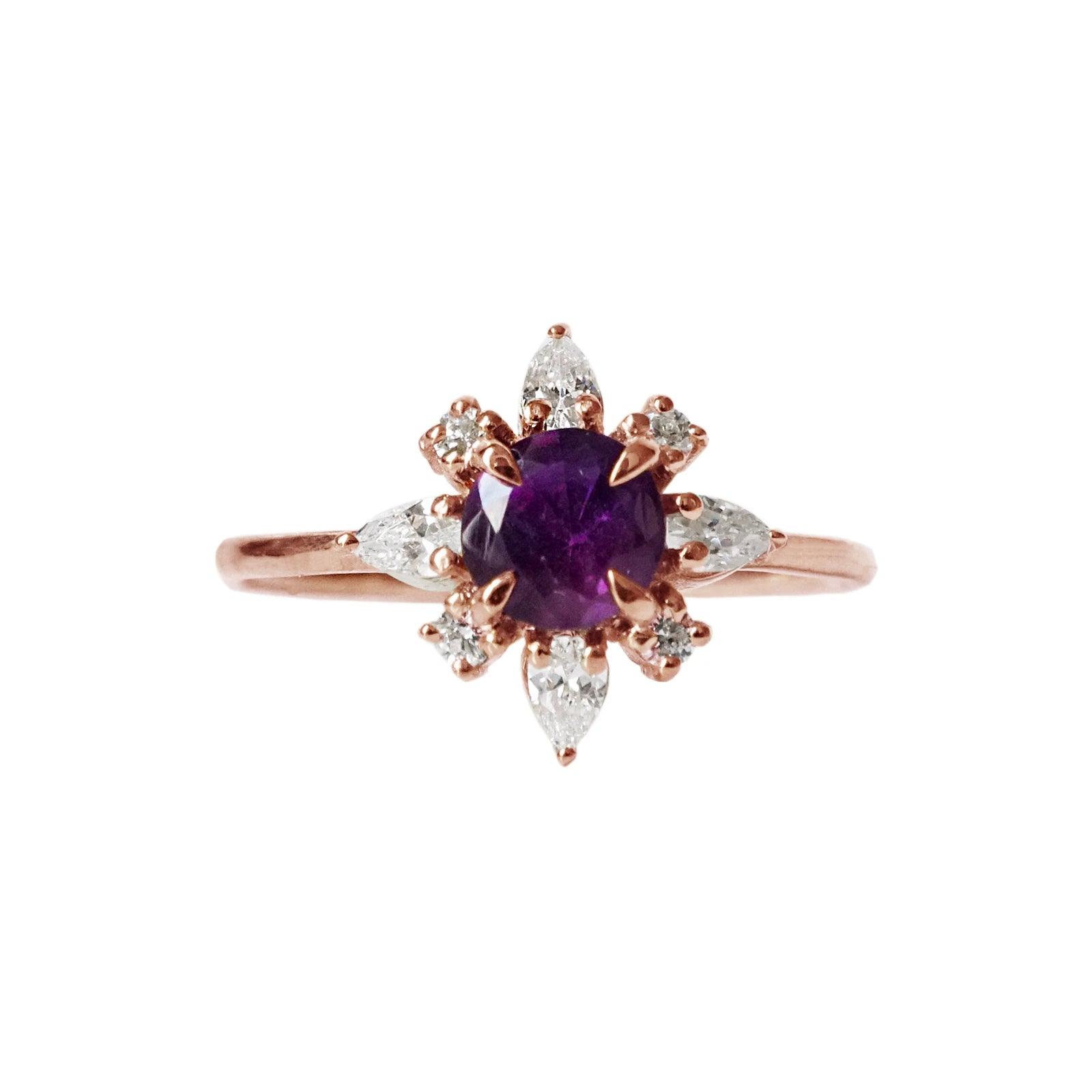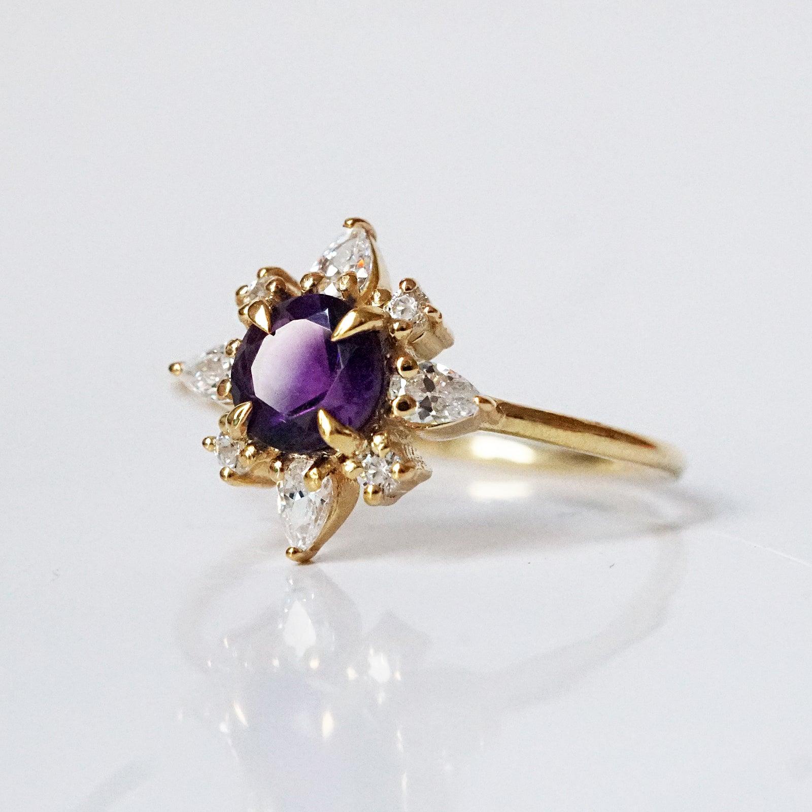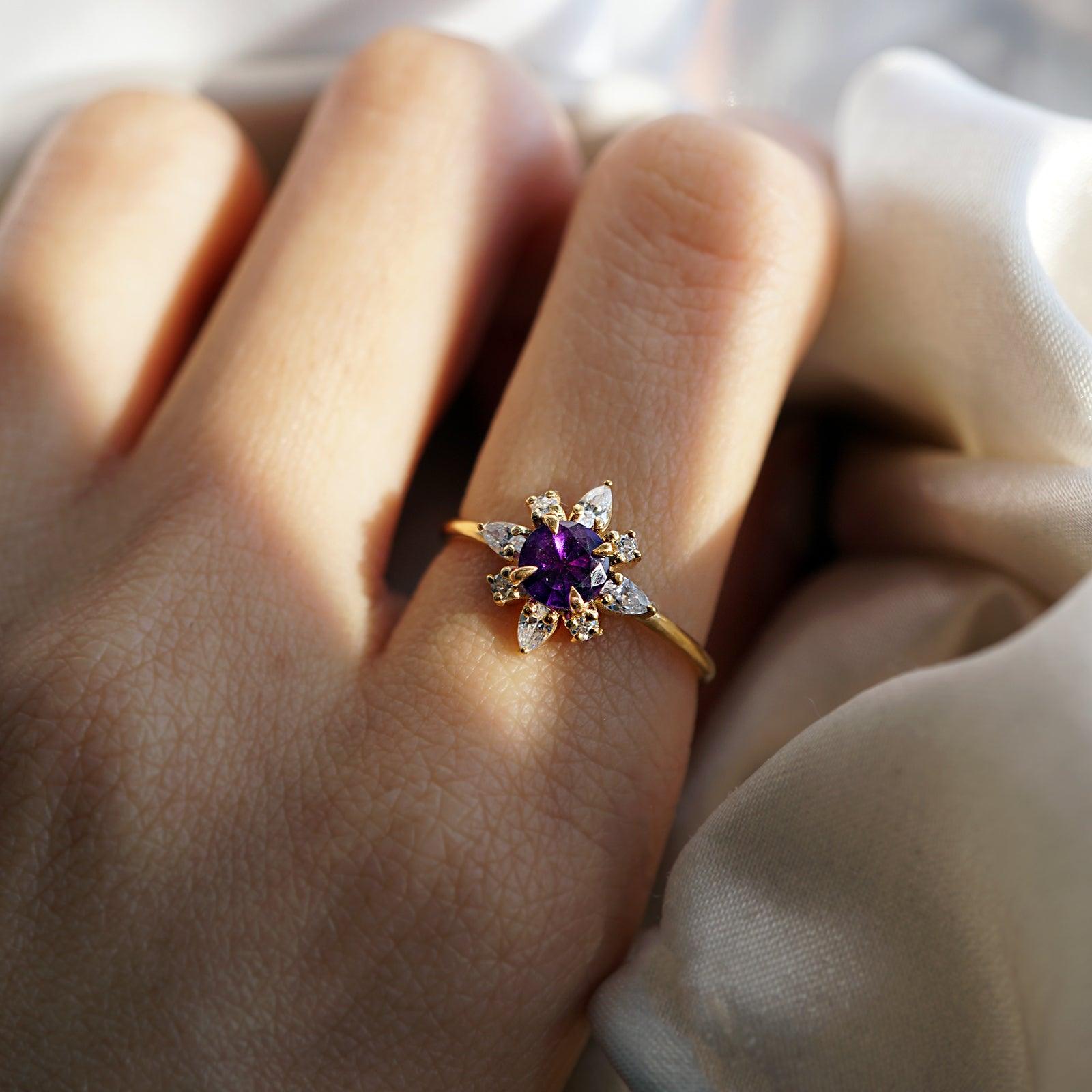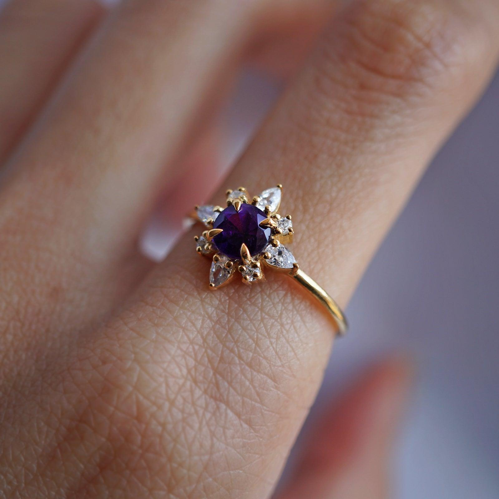 The Amethyst Passion Flower Ring embodies tranquility and vitality — a delicate bloom crafted from light and color. At its center glows a natural round amethyst, known for its power to clear the mind and inspire passion. Sparkling pear-shaped CZs surround the gemstone like petals catching the morning sun.