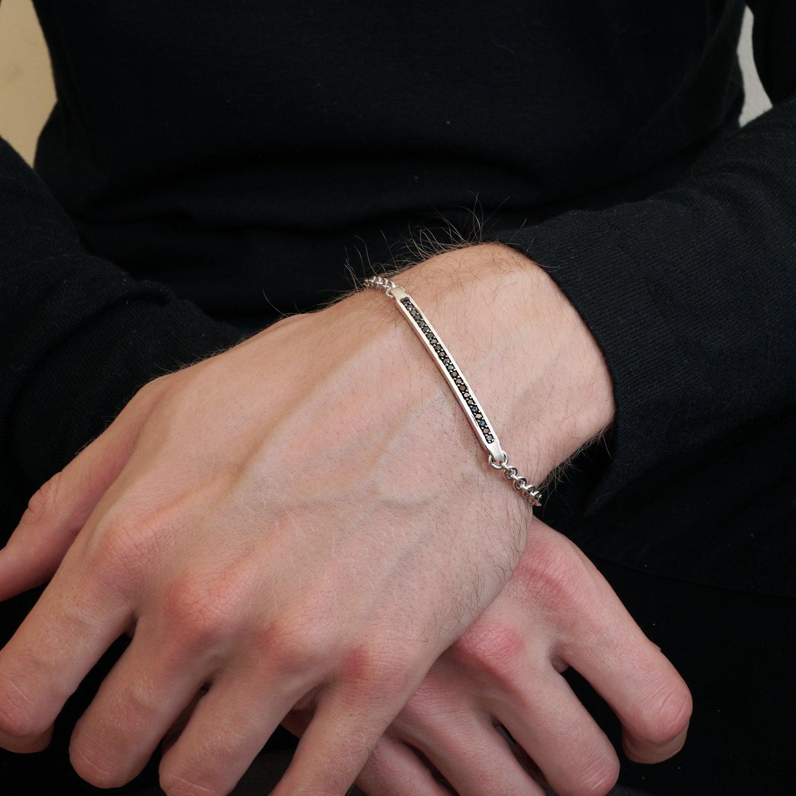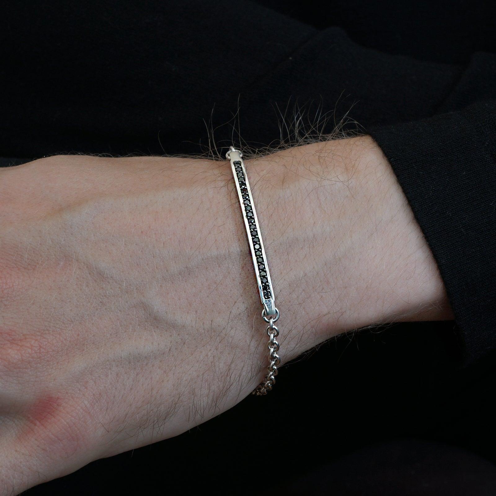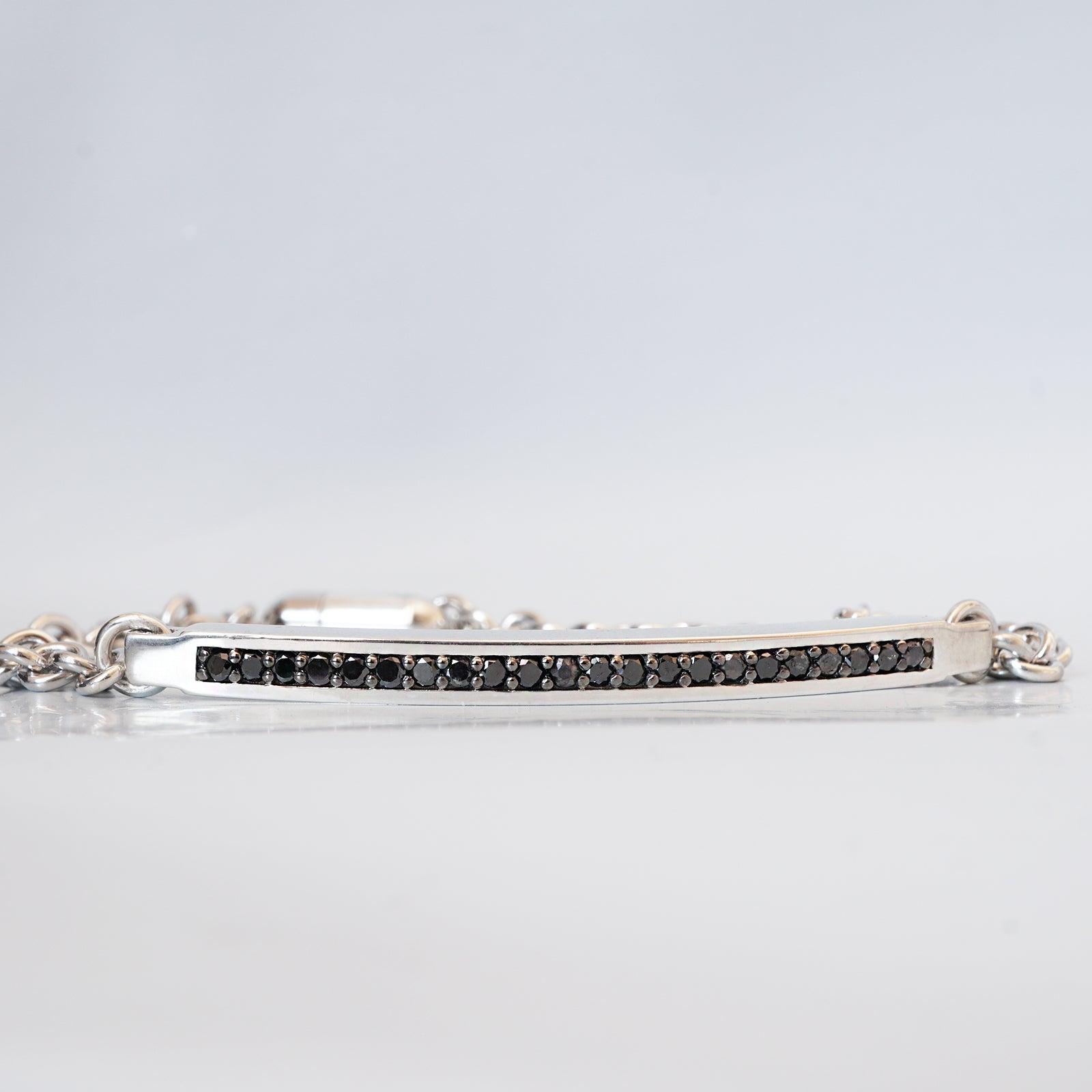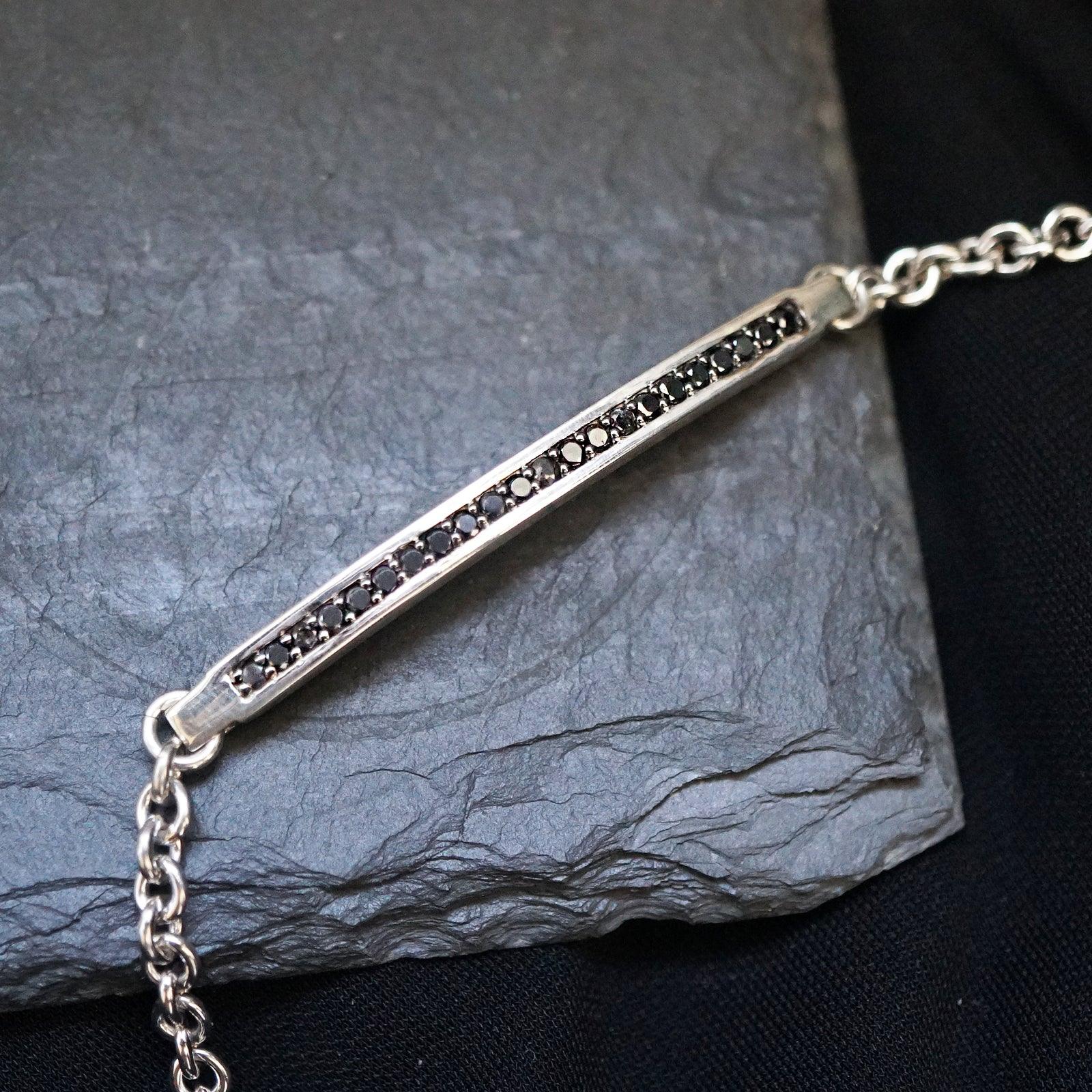 The Black Diamond Lining Bracelet embodies understated luxury and modern elegance. Twenty-two natural black diamonds are meticulously set along a slender sterling silver bar, connected by a fine silver cable chain and clasp.