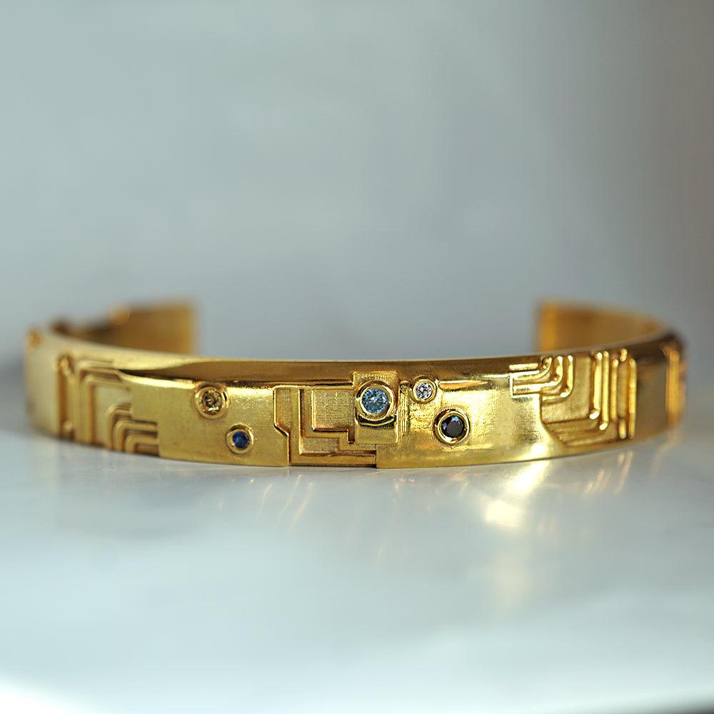This stylish sterling silver cuff is inspired by the mystery of UFOs. Encrusted with natural colored diamonds. A beautiful piece to wear and add to your collection.