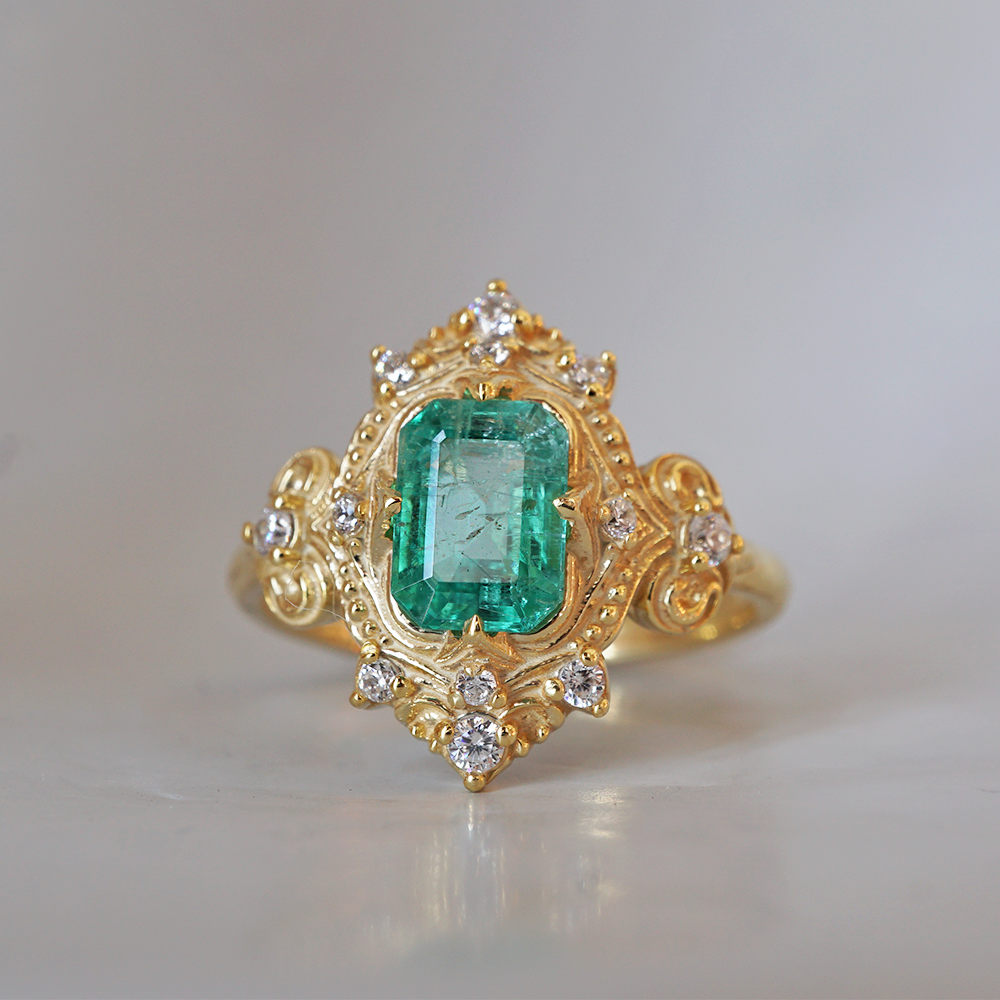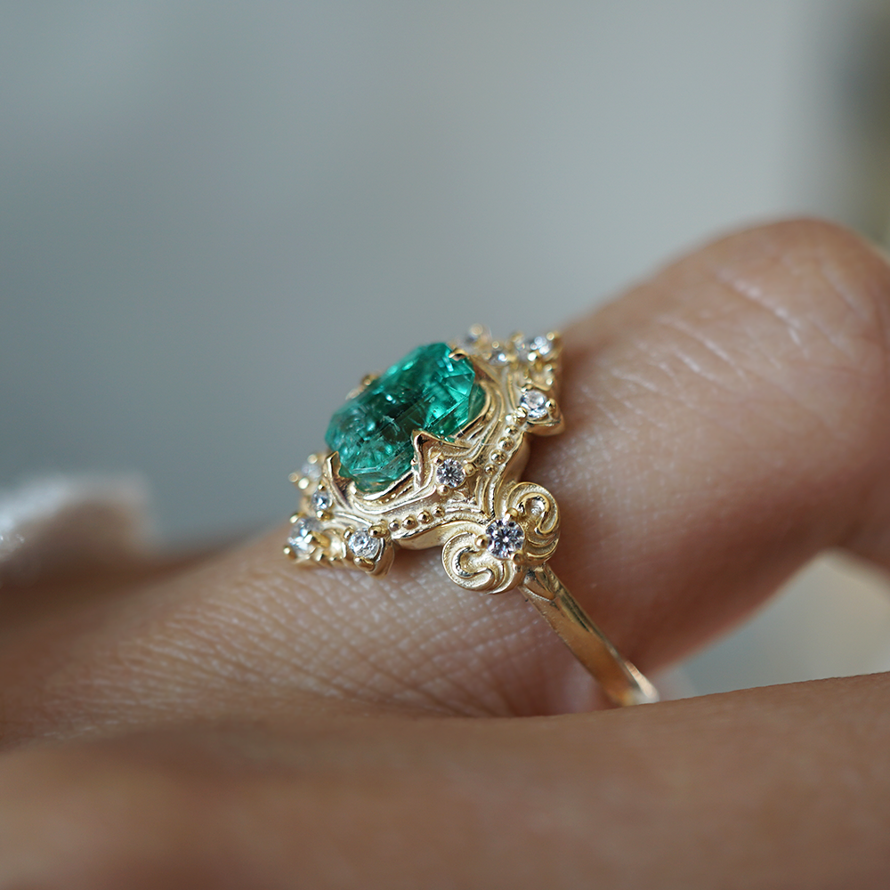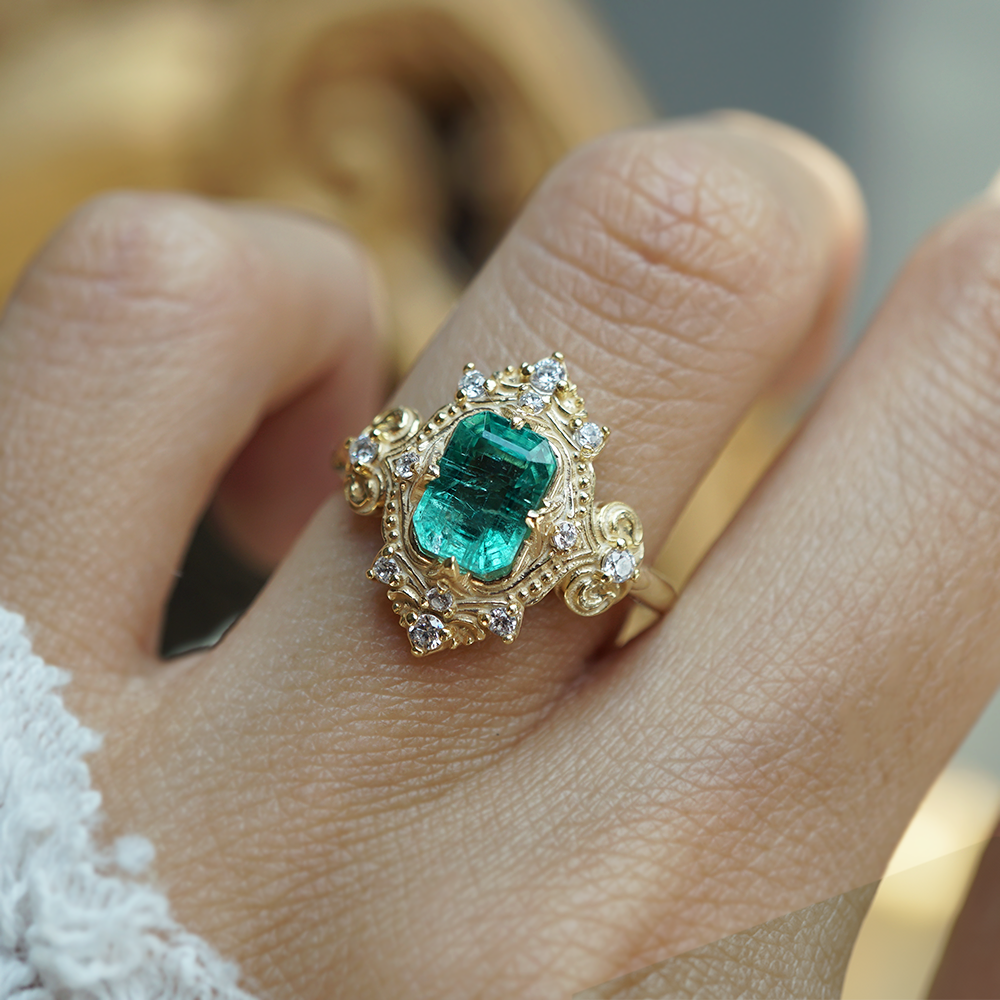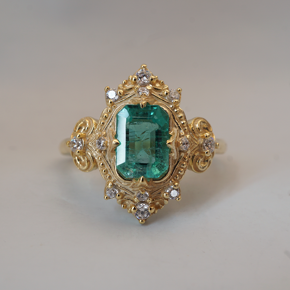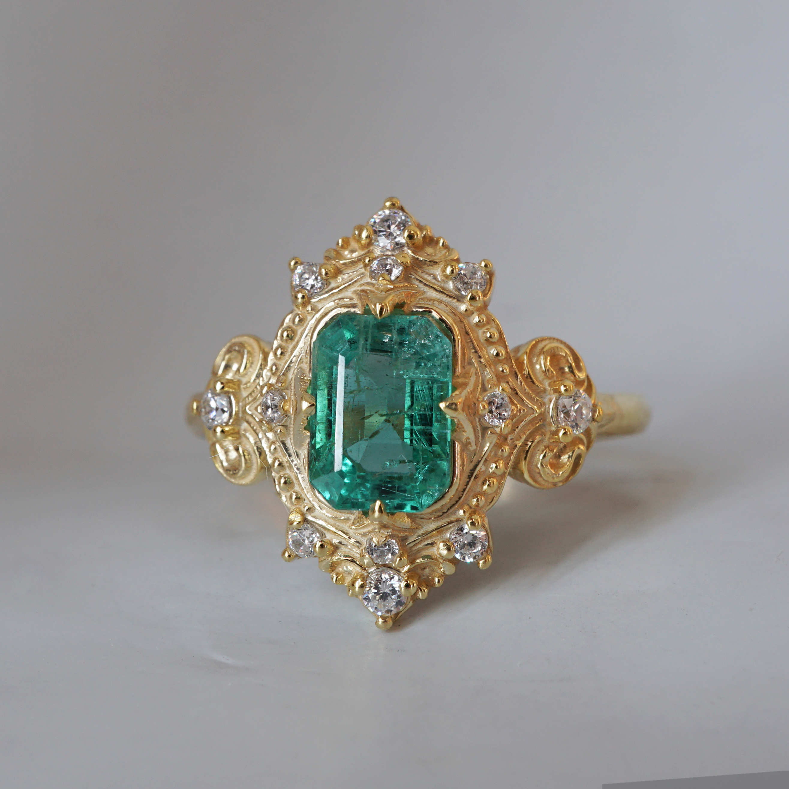 Inspired by the ornate beauty of French architecture, the design features delicate curves and intricate detailing that wrap gracefully around the vibrant emerald. Every line and flourish reflects masterful craftsmanship—creating a ring that feels regal, romantic, and undeniably refined.