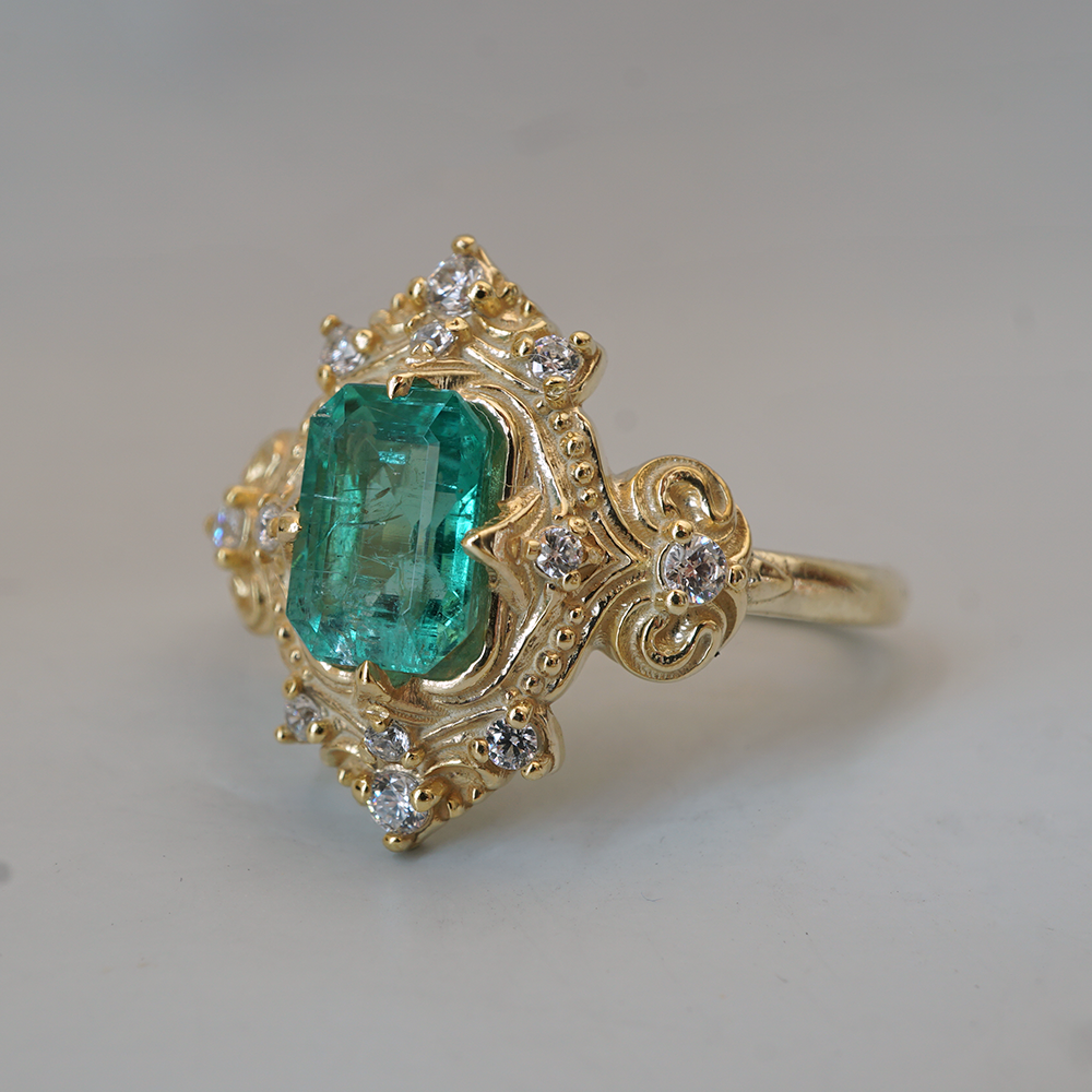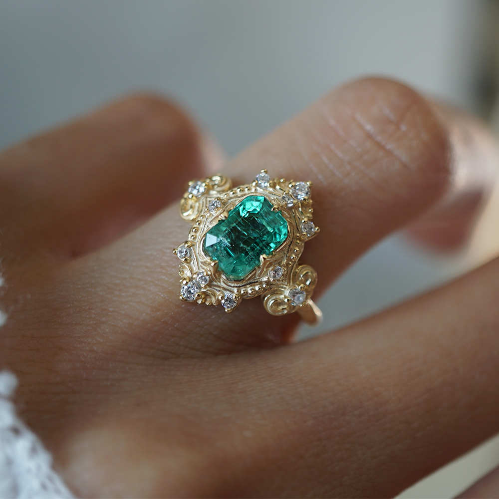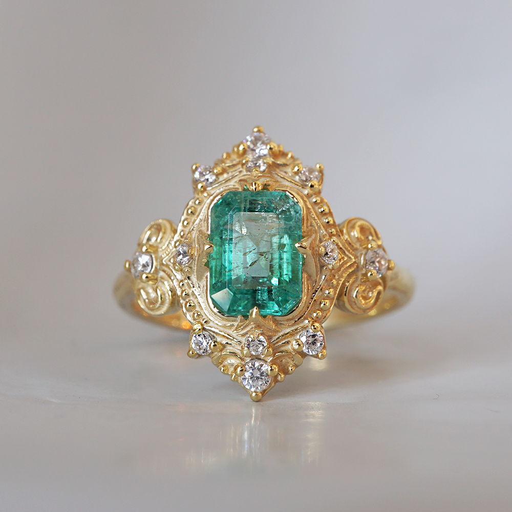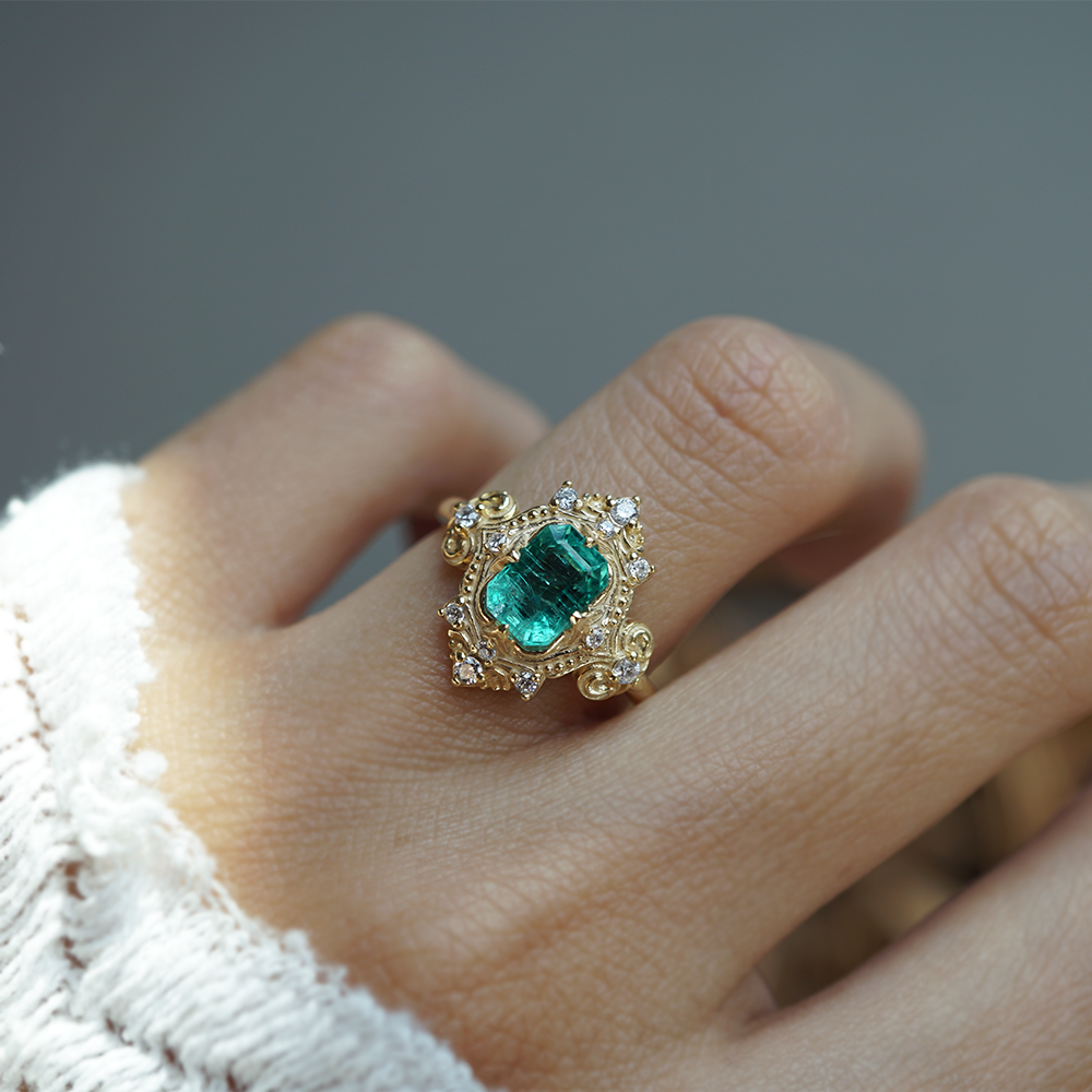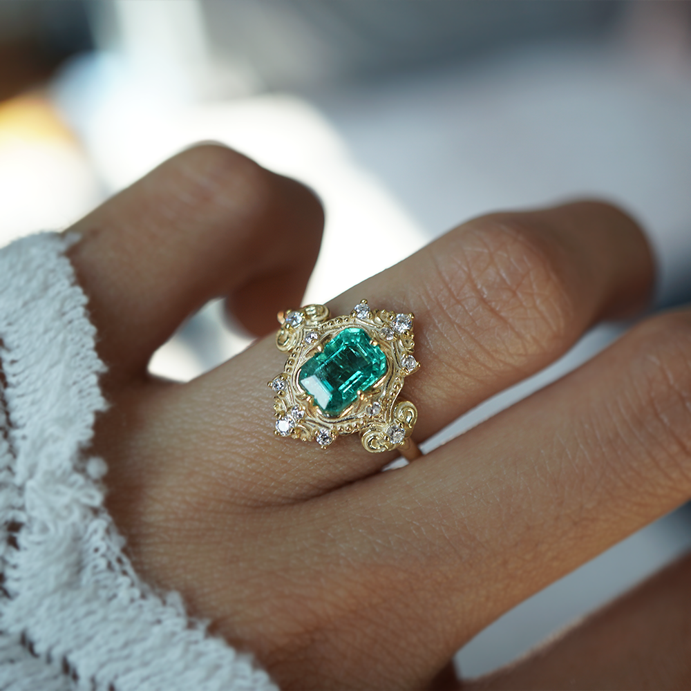 Inspired by the ornate beauty of French architecture, the design features delicate curves and intricate detailing that wrap gracefully around the vibrant emerald. Every line and flourish reflects masterful craftsmanship—creating a ring that feels regal, romantic, and undeniably refined.
