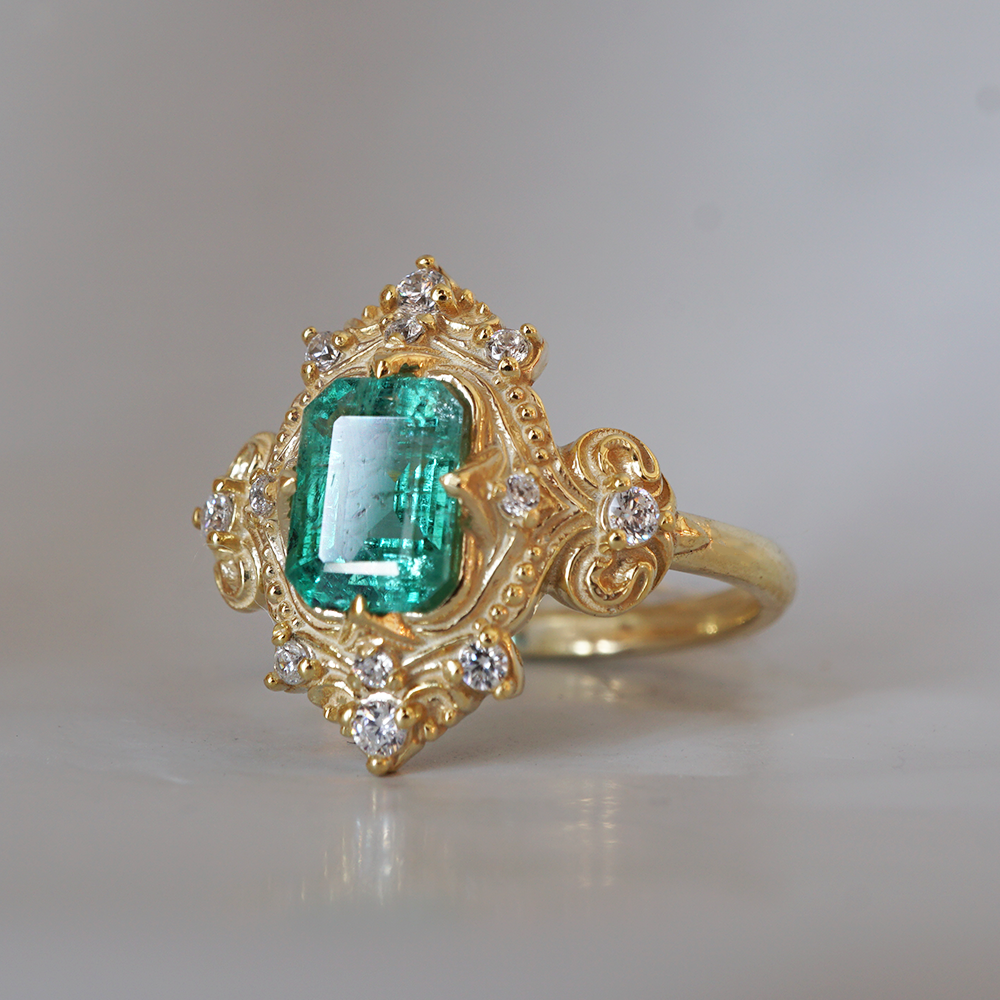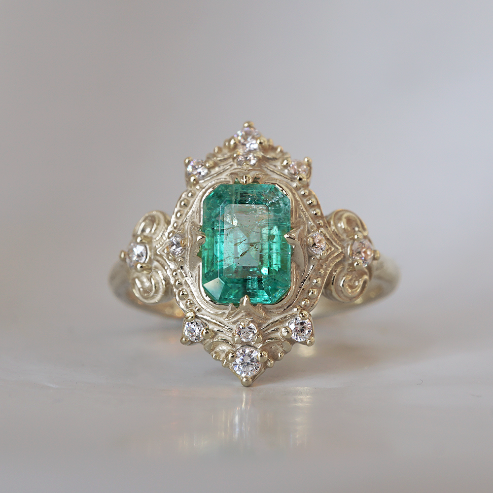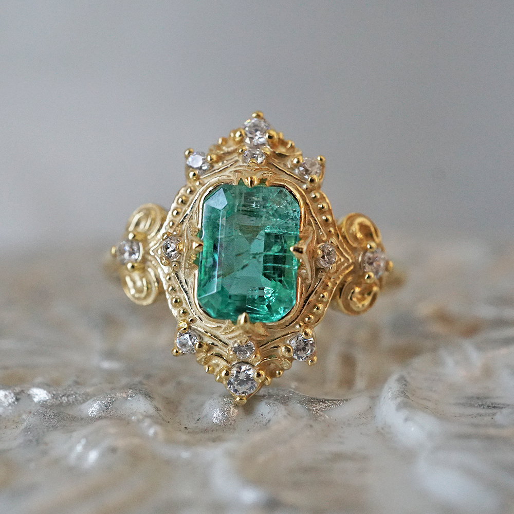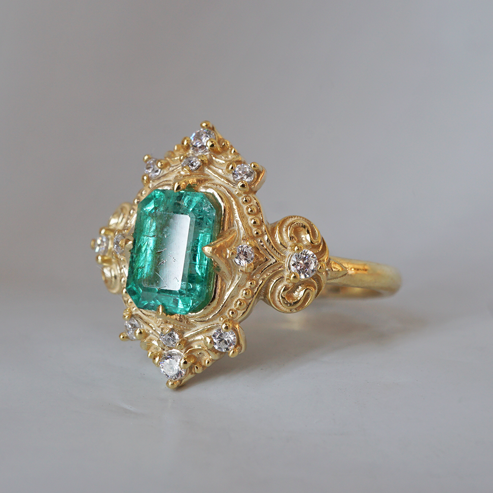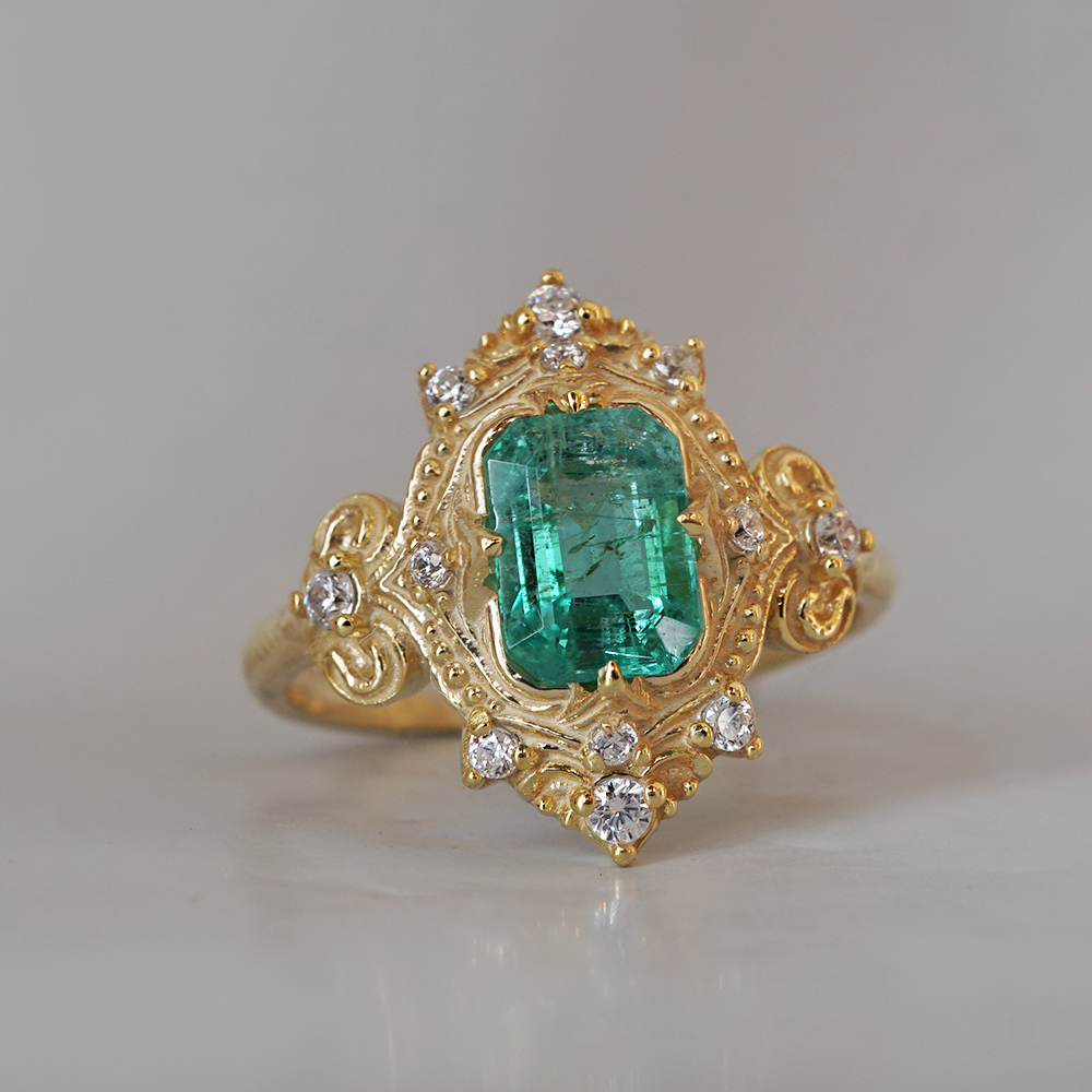 Inspired by the ornate beauty of French architecture, the design features delicate curves and intricate detailing that wrap gracefully around the vibrant emerald. Every line and flourish reflects masterful craftsmanship—creating a ring that feels regal, romantic, and undeniably refined.