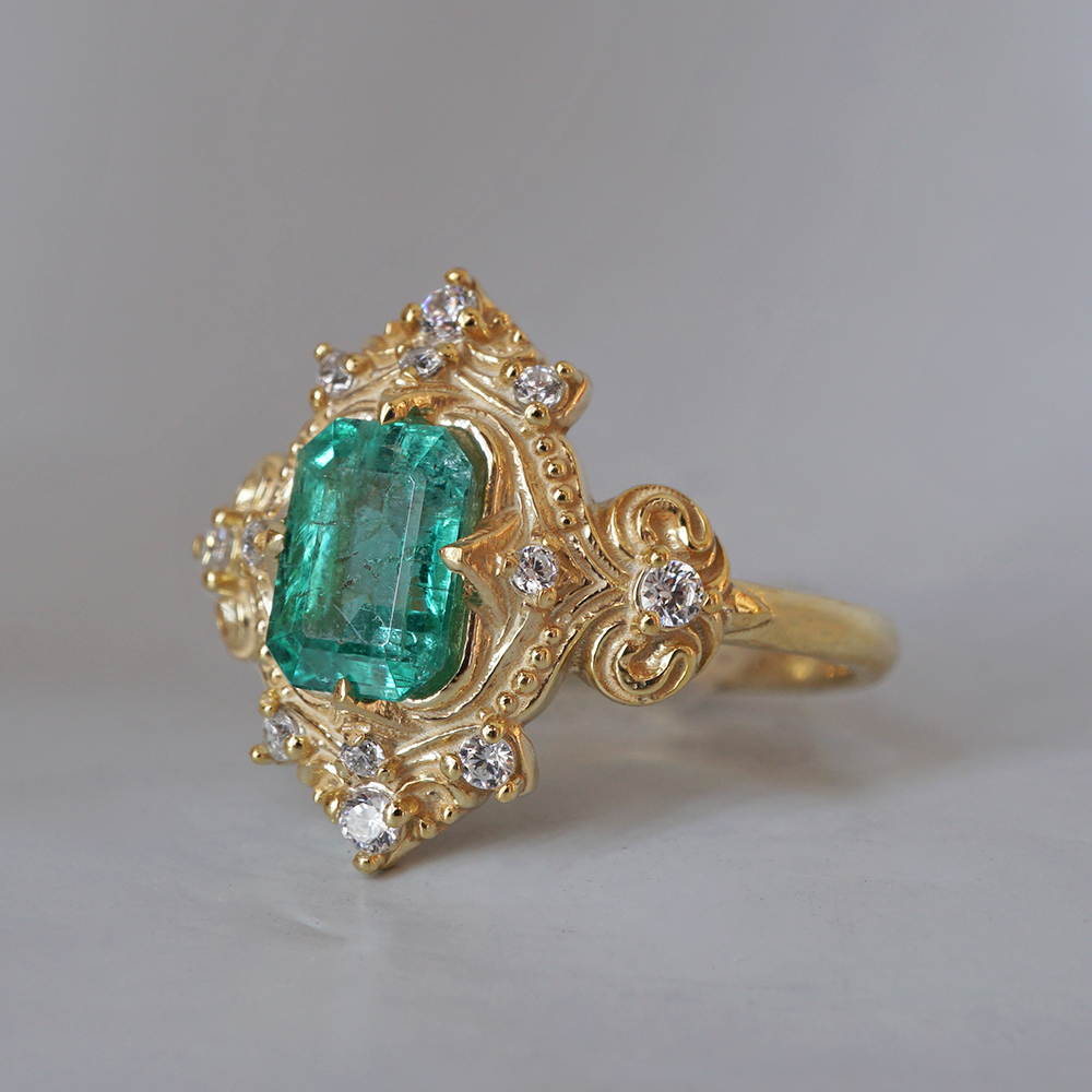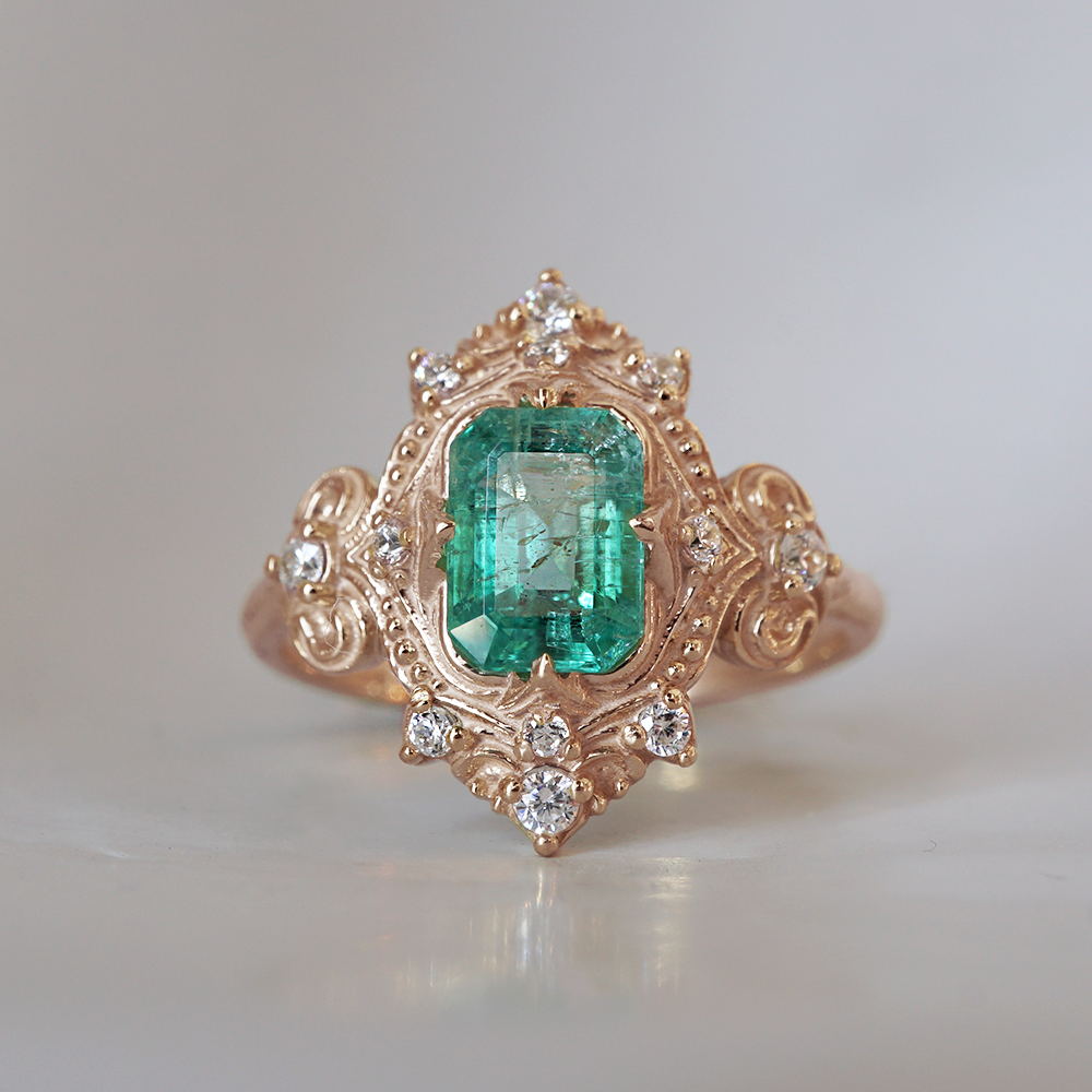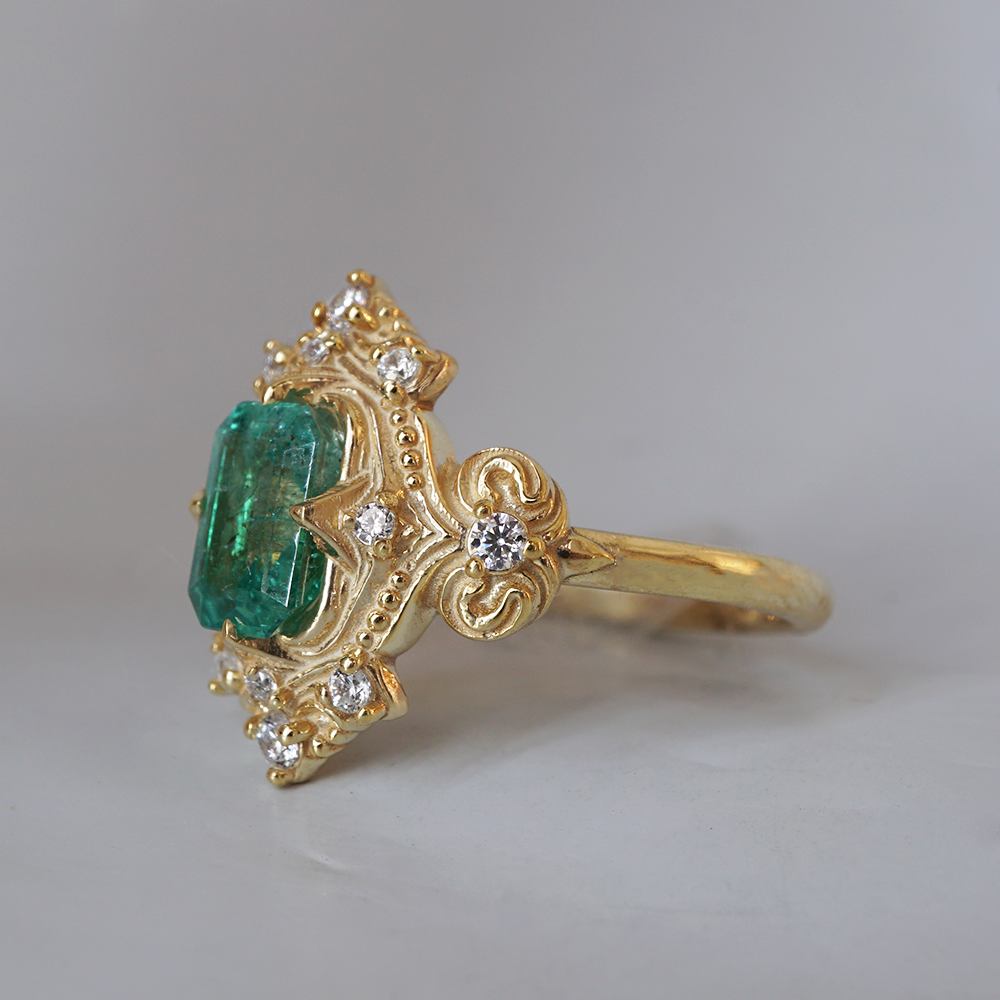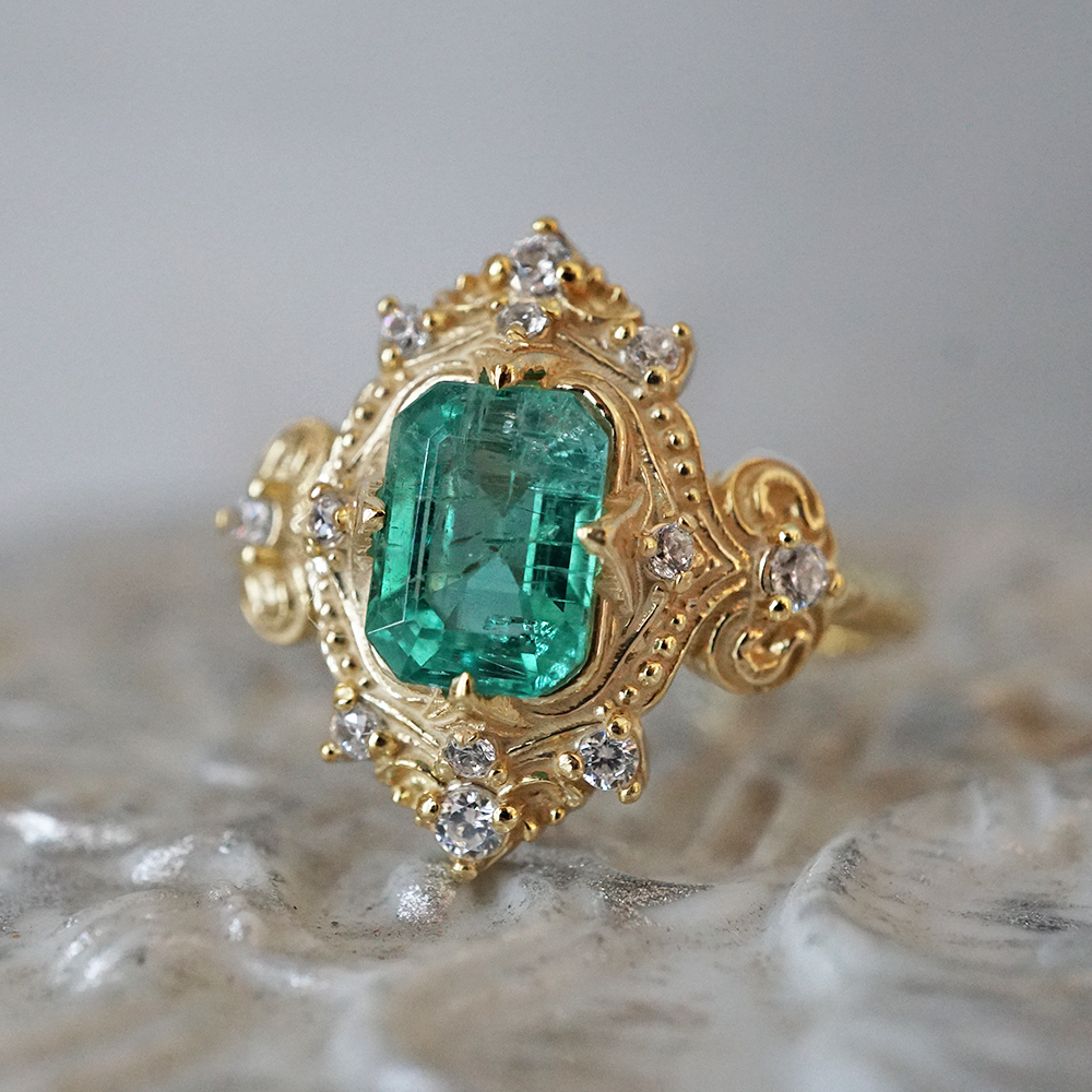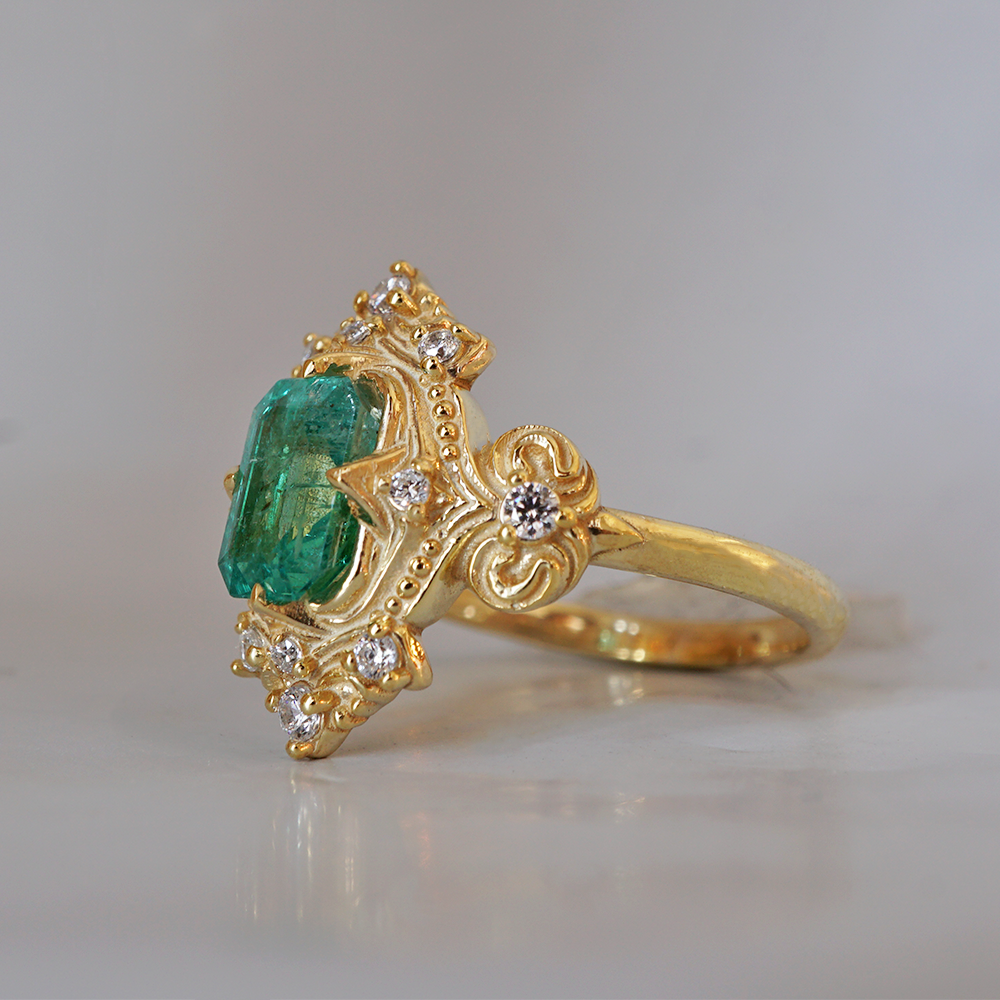 Inspired by the ornate beauty of French architecture, the design features delicate curves and intricate detailing that wrap gracefully around the vibrant emerald. Every line and flourish reflects masterful craftsmanship—creating a ring that feels regal, romantic, and undeniably refined.