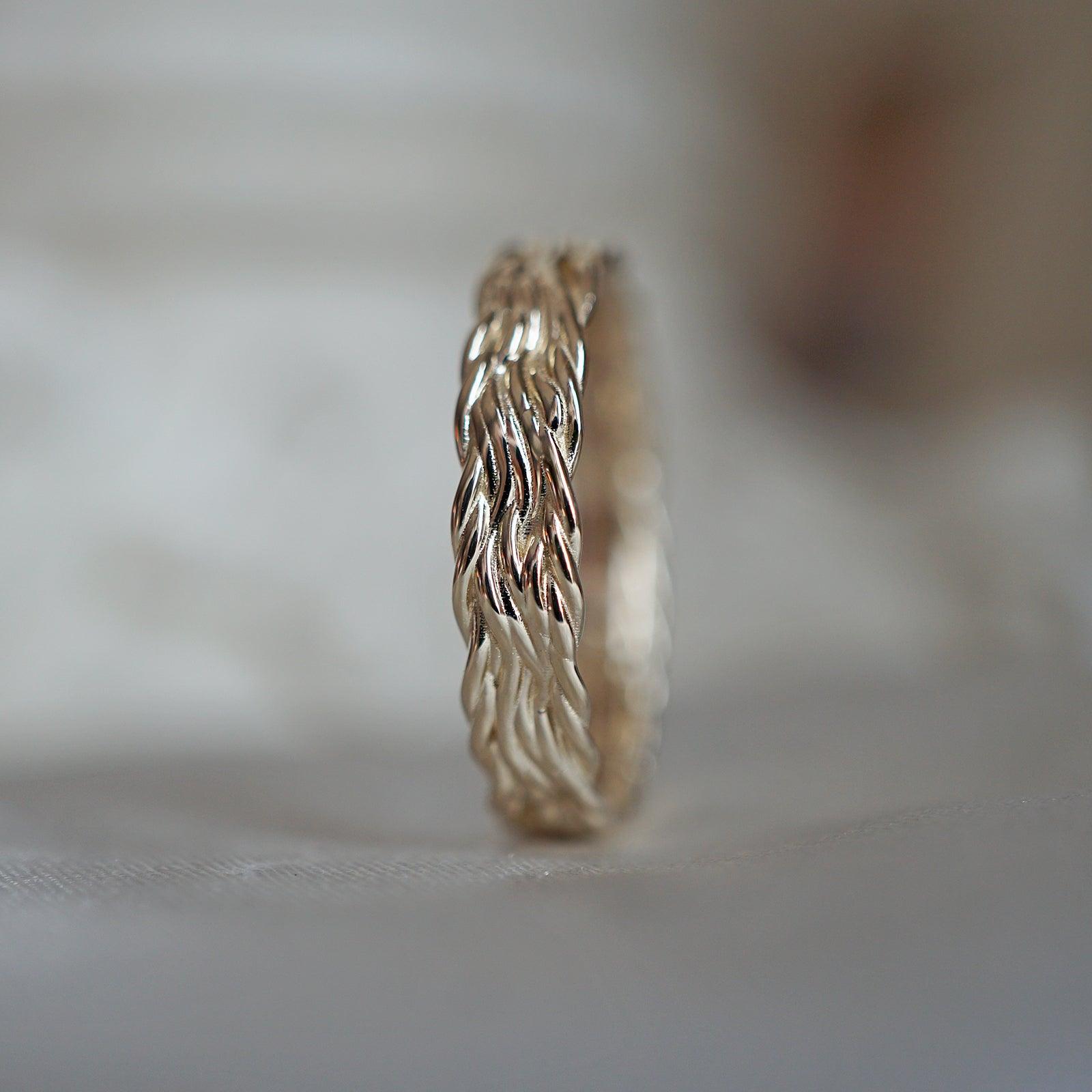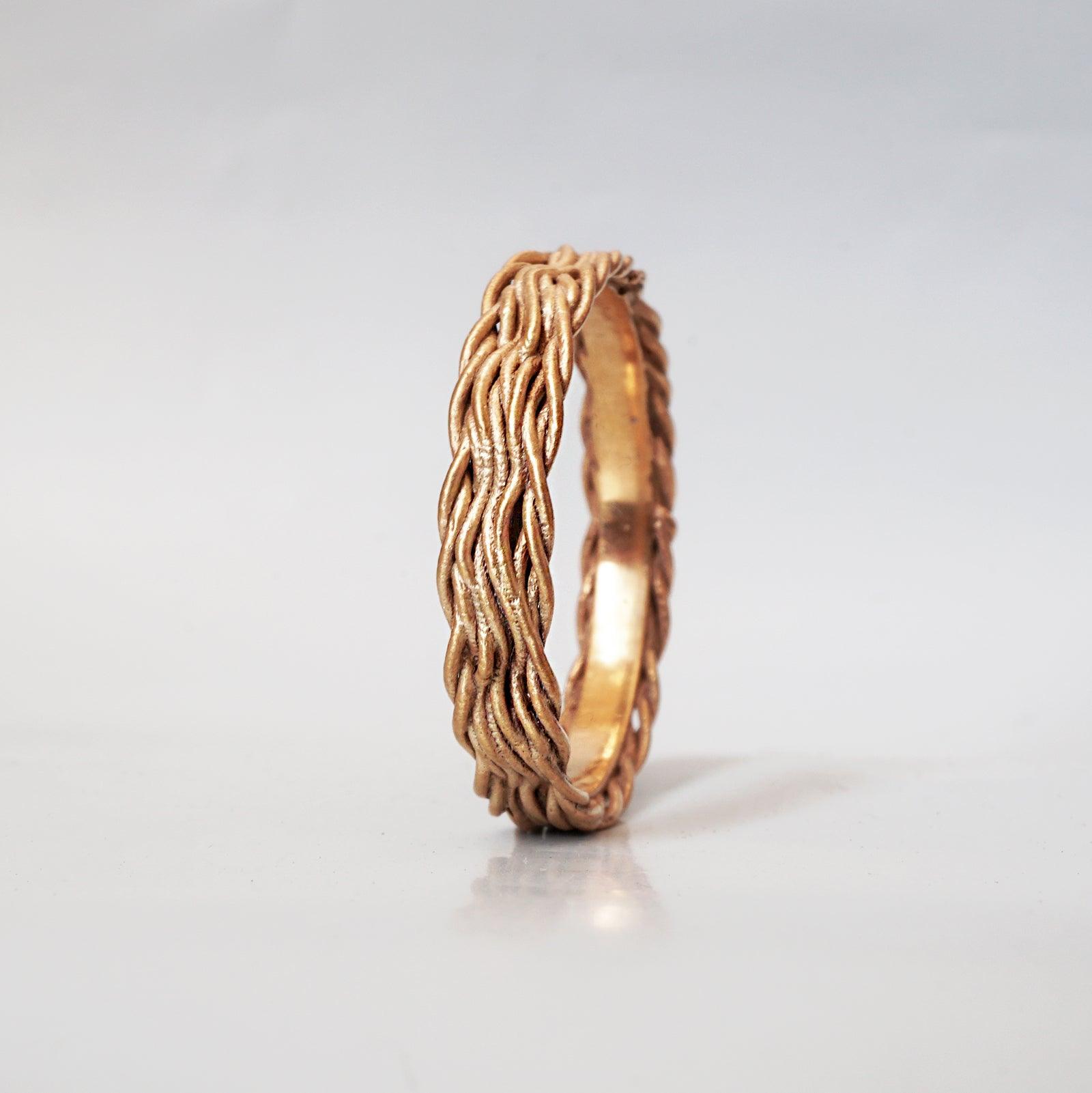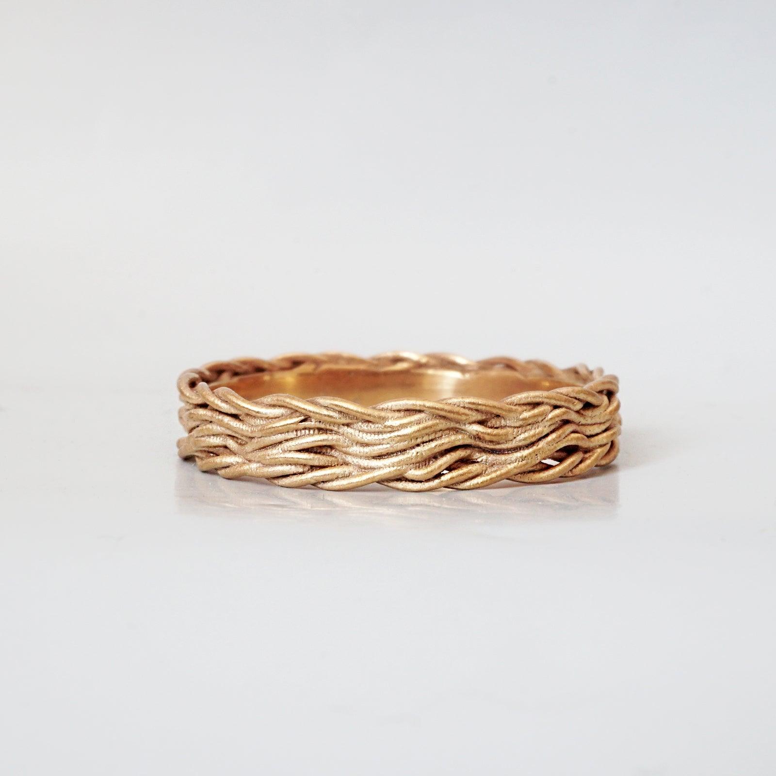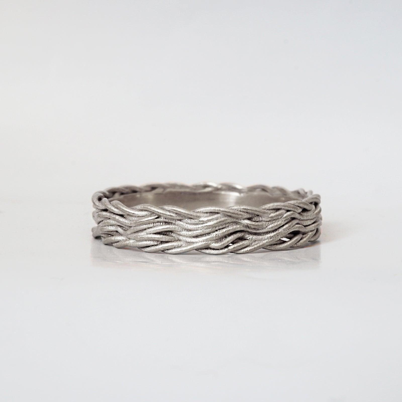 Inspired by the gentle movement of tree branches, the Intertwined Ring Band embodies connection, resilience, and quiet strength. Each curve flows organically, sculpted by hand to mirror the soft lines of nature’s design. The brushed matte finish captures the raw texture of bark — imperfect, grounding, and beautifully alive.
