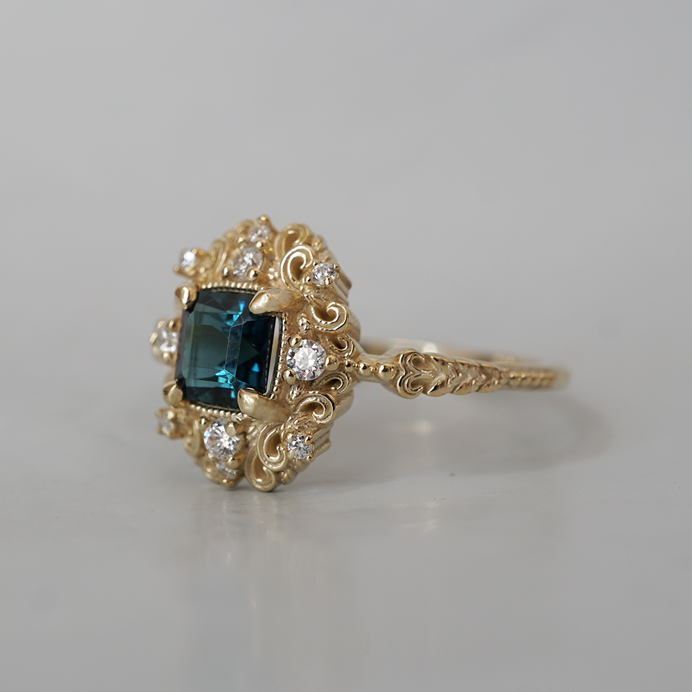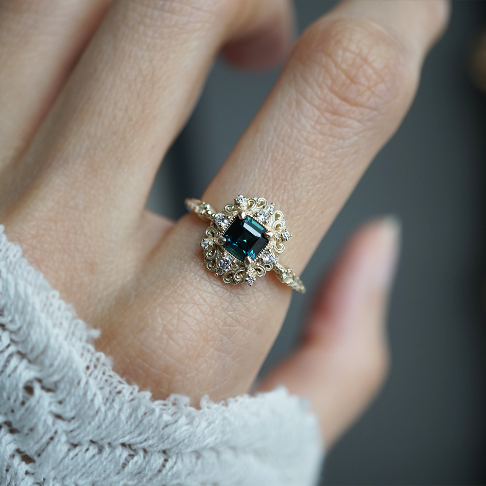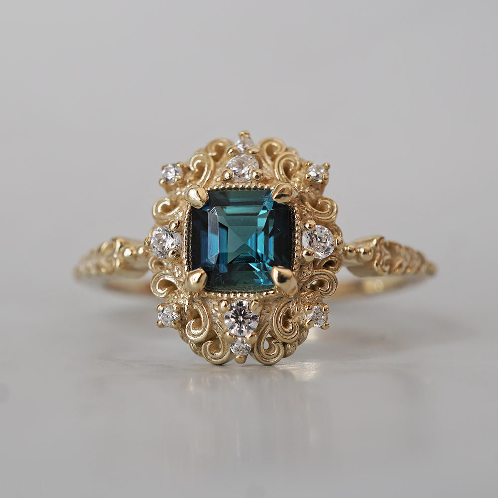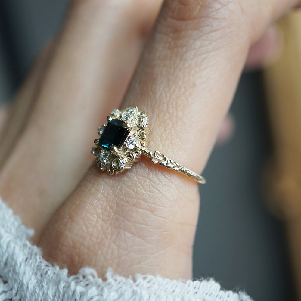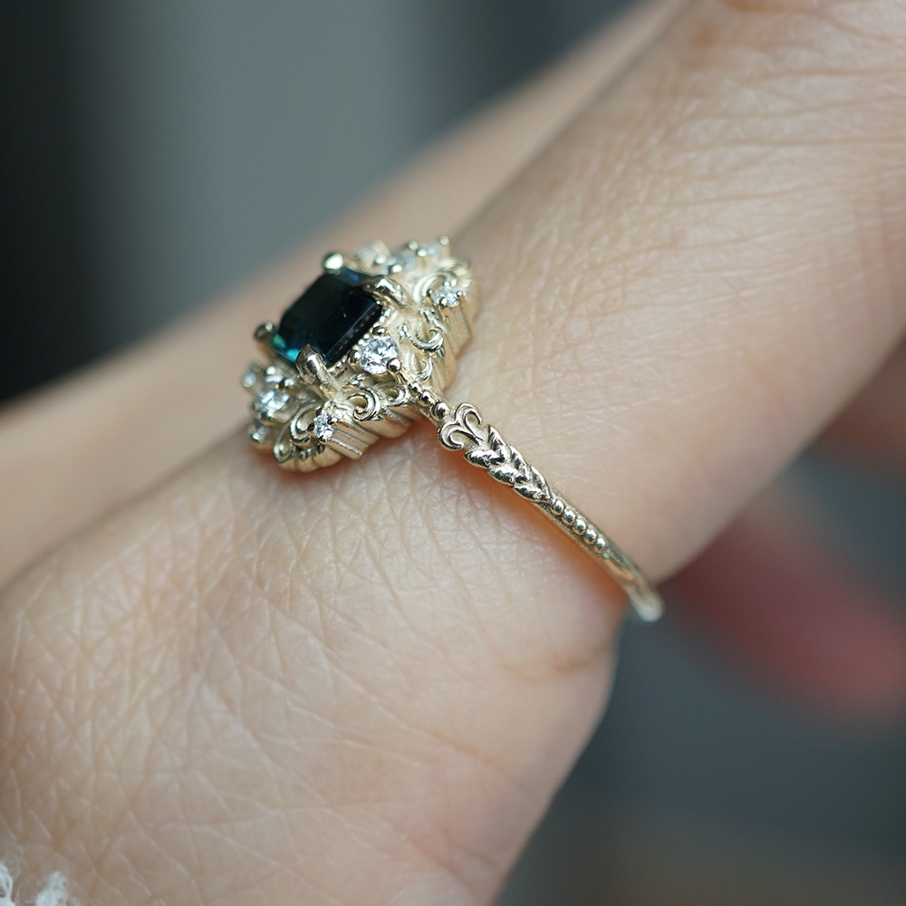 The Isadora ring showcases a richly hued teal tourmaline, emerald-cut and framed by intricate gold filigree. The setting features delicate milgrain detailing and petite diamond accents that echo vintage European design. With its ornate band and timeless silhouette, Isadora blends regal elegance with old-world craftsmanship—perfect for a modern heirloom.
