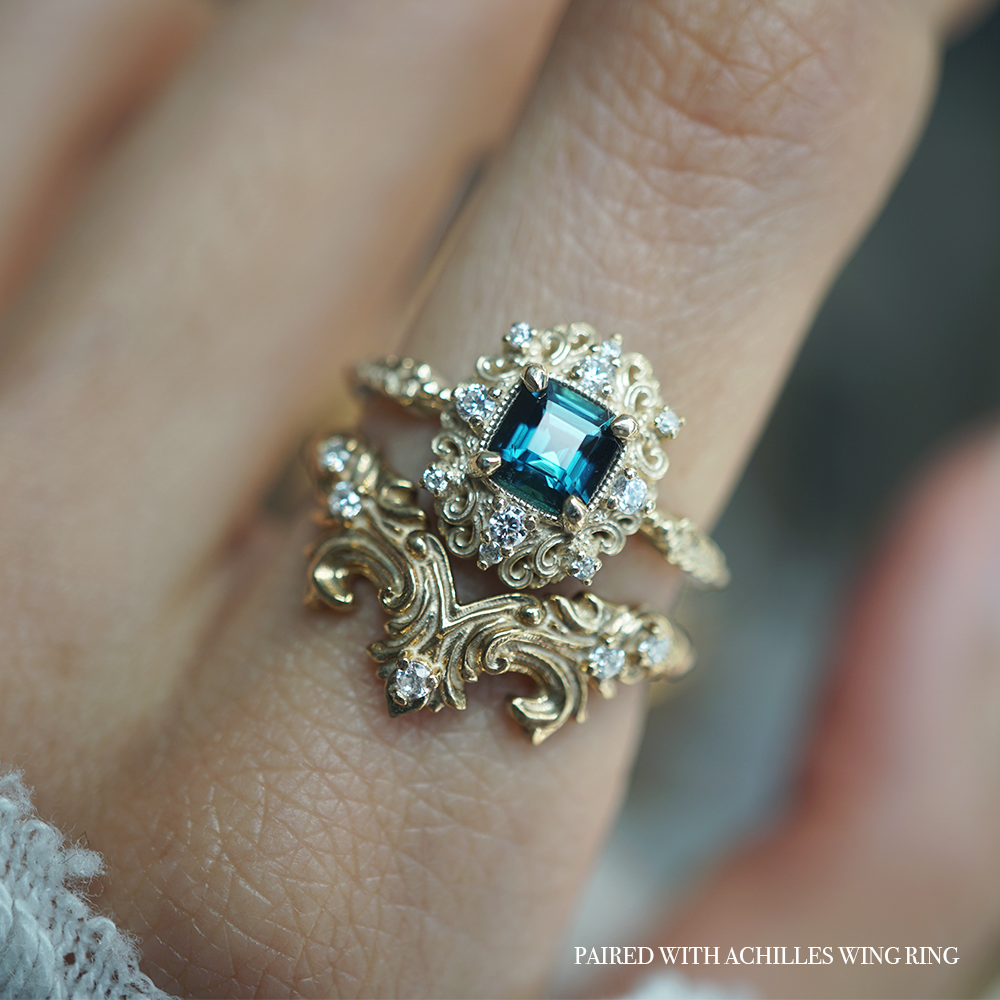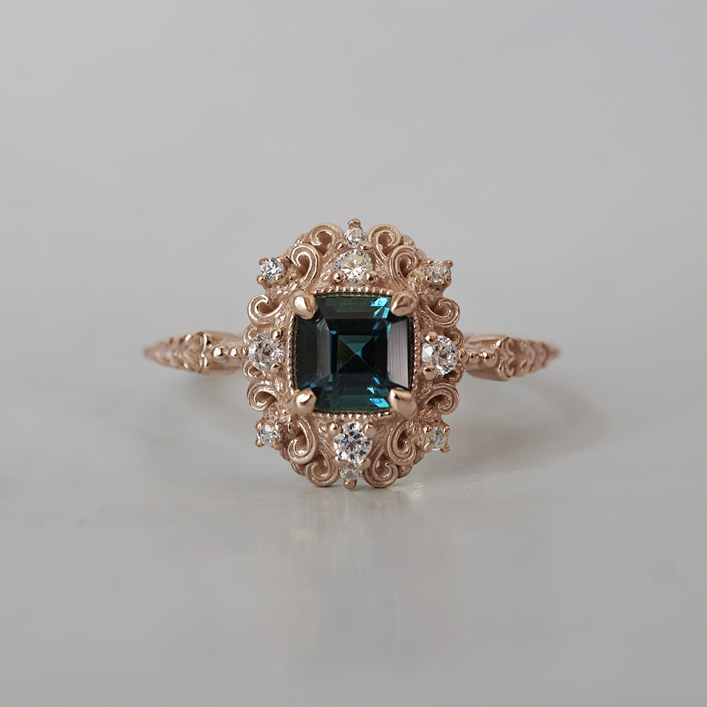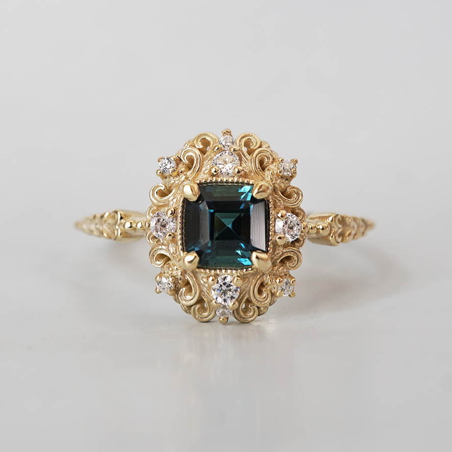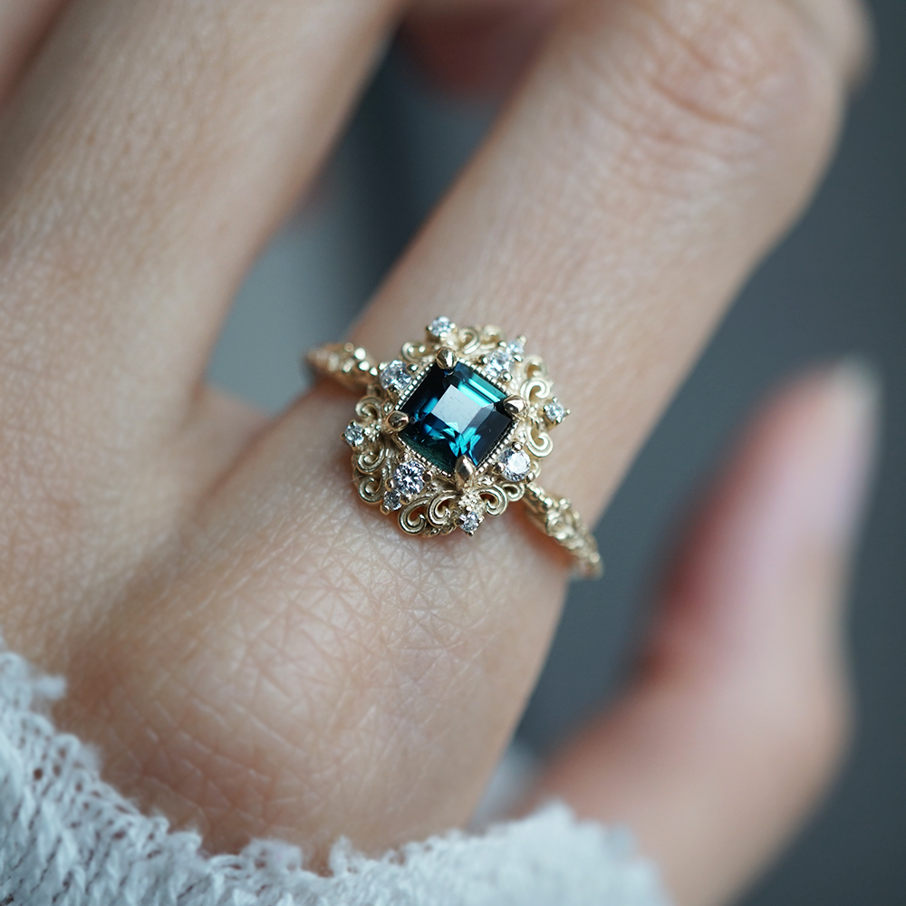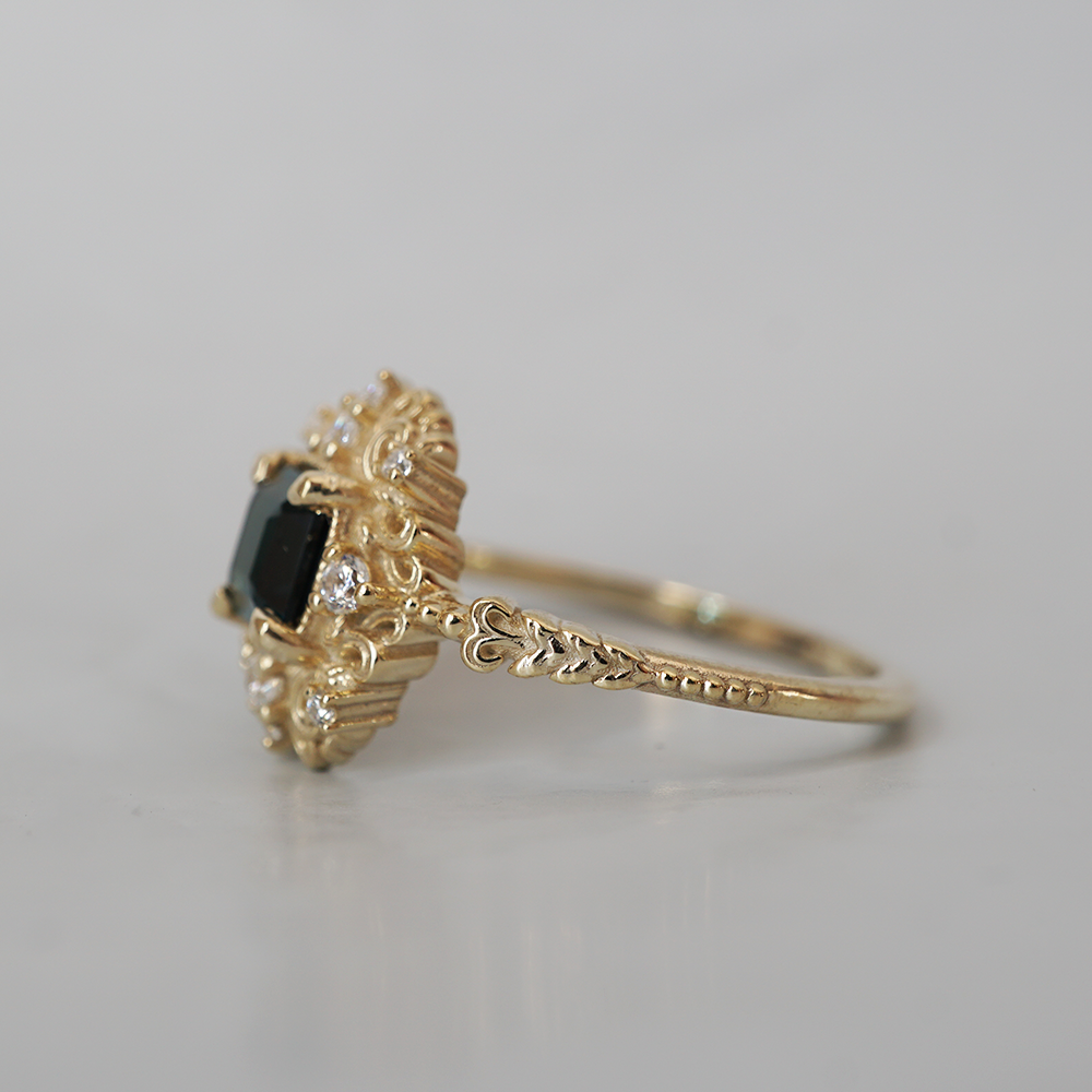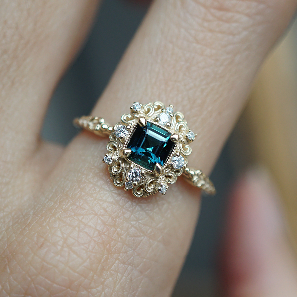 The Isadora ring showcases a richly hued teal tourmaline, emerald-cut and framed by intricate gold filigree. The setting features delicate milgrain detailing and petite diamond accents that echo vintage European design. With its ornate band and timeless silhouette, Isadora blends regal elegance with old-world craftsmanship—perfect for a modern heirloom.