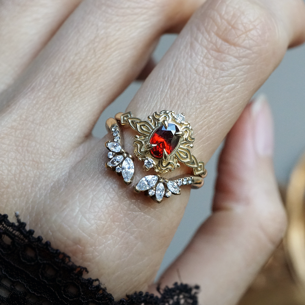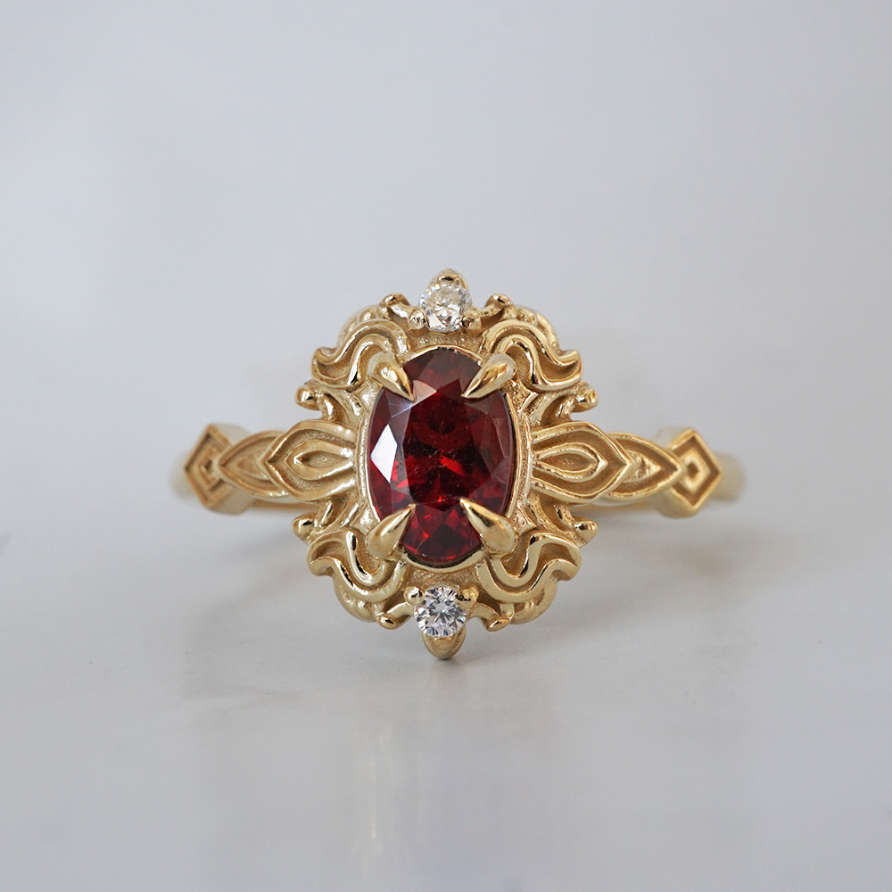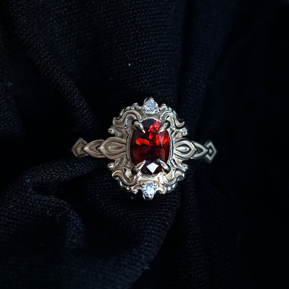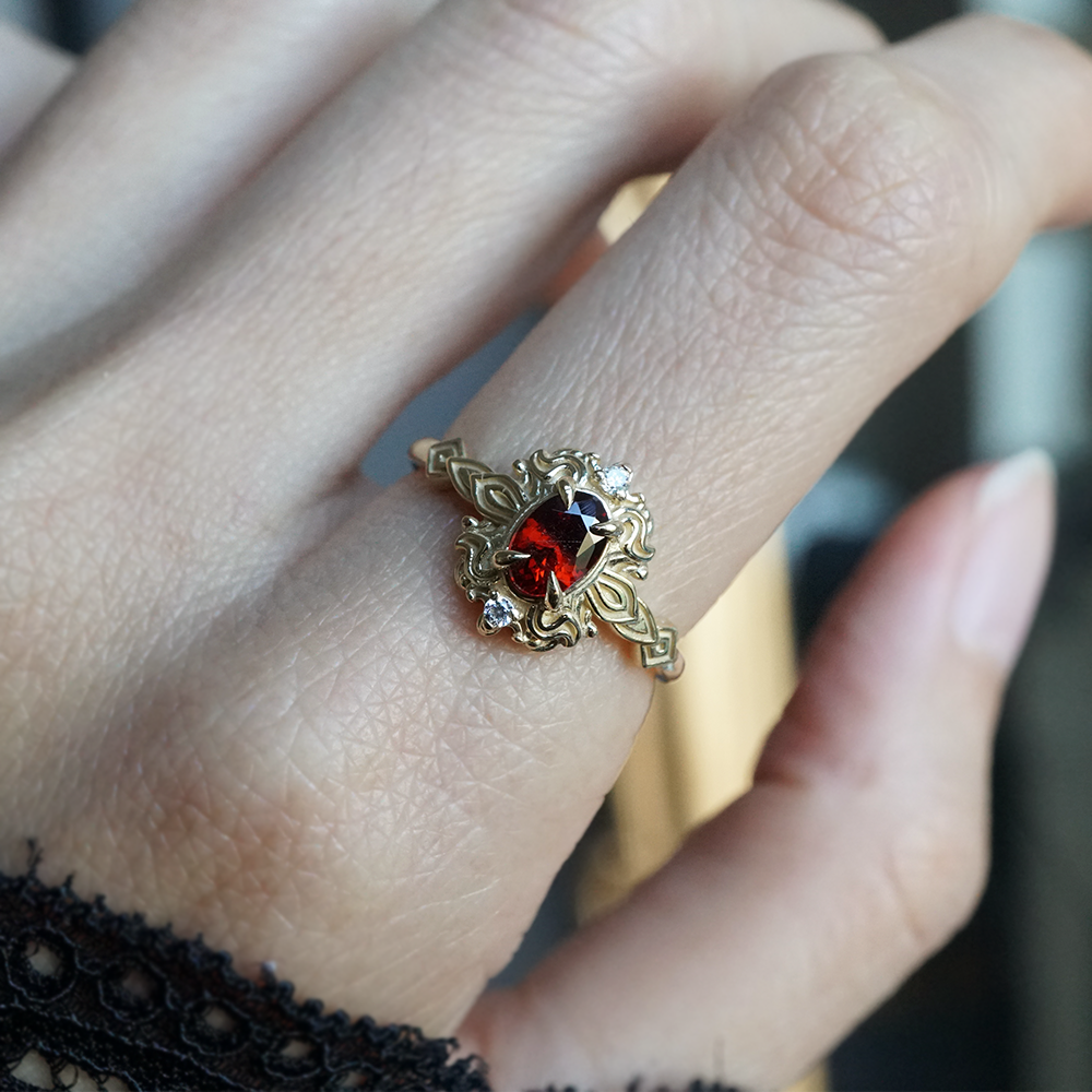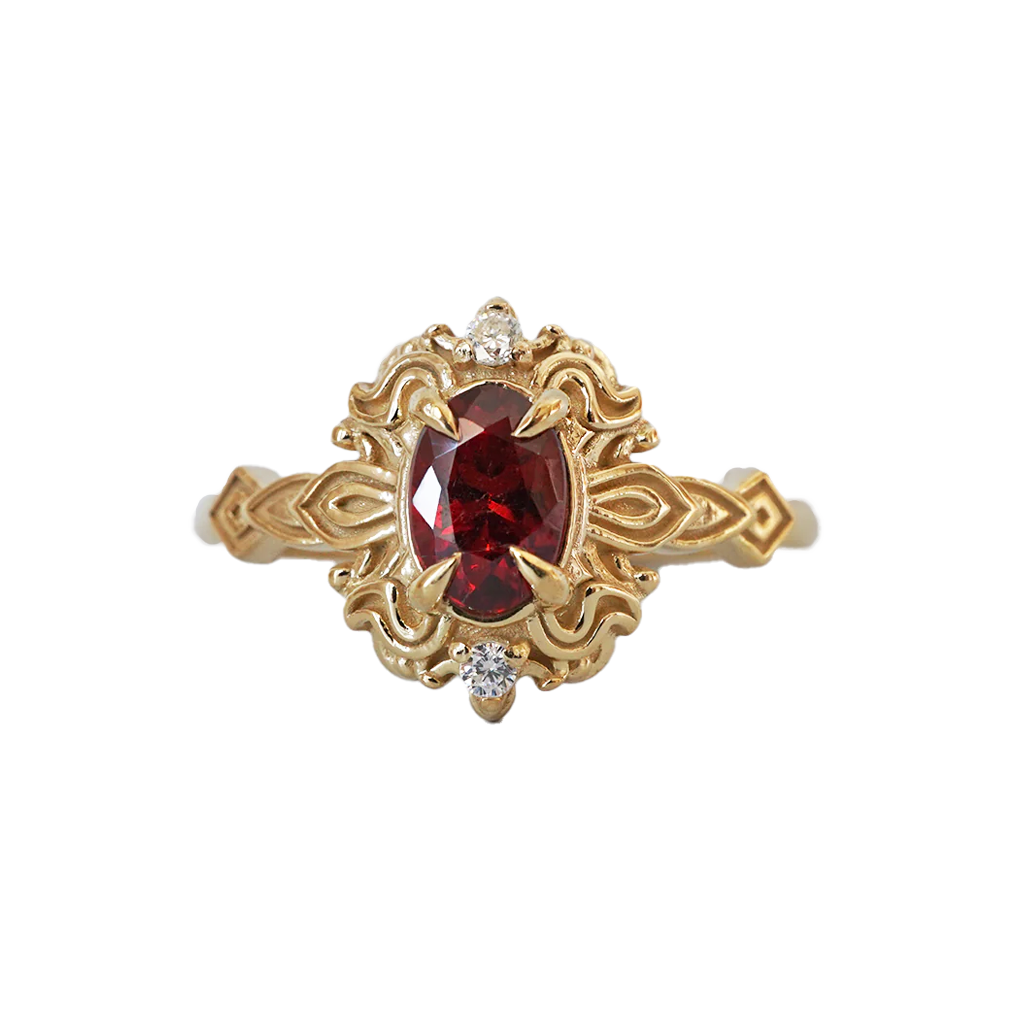 The Faith Spinel Scroll Ring captures the essence of timeless elegance and quiet strength. At its heart rests a vivid crimson spinel—nature’s own flame of beauty—set within intricate scrollwork that evokes the romantic artistry of vintage design. Each delicate curve tells a story of grace and devotion, transforming this piece into more than a ring—it’s a keepsake of enduring charm. Handcrafted with care in your choice of 14K or 18K yellow, rose, or white gold, the Faith Ring embodies the perfect harmony of heritage and modern refinement.