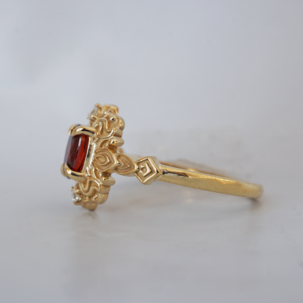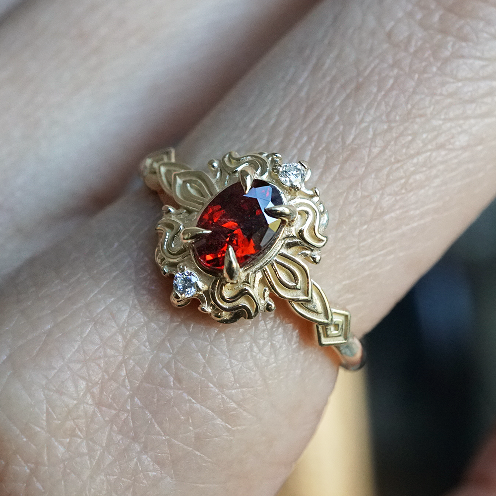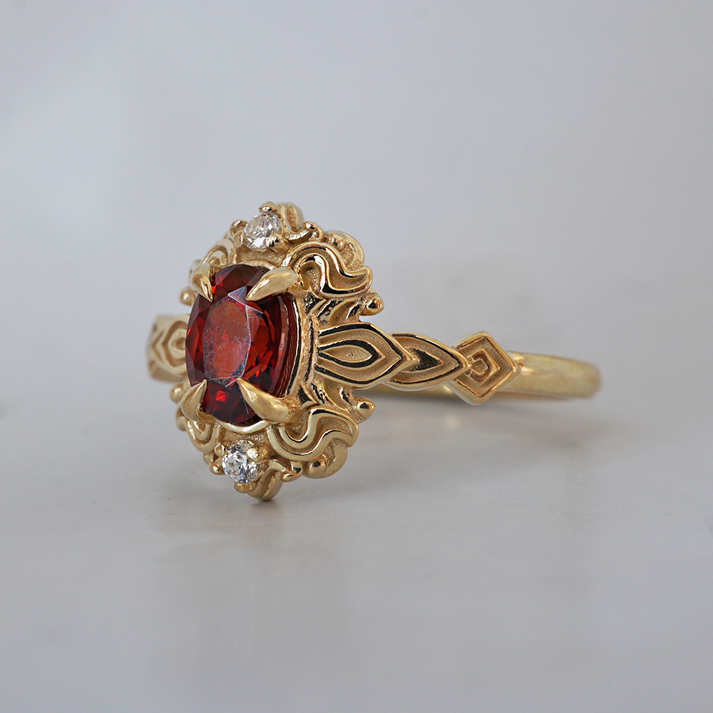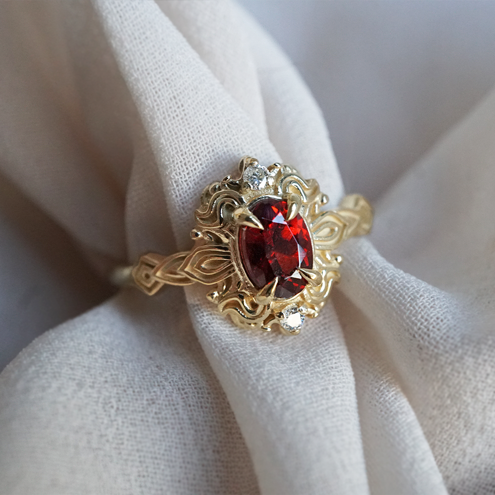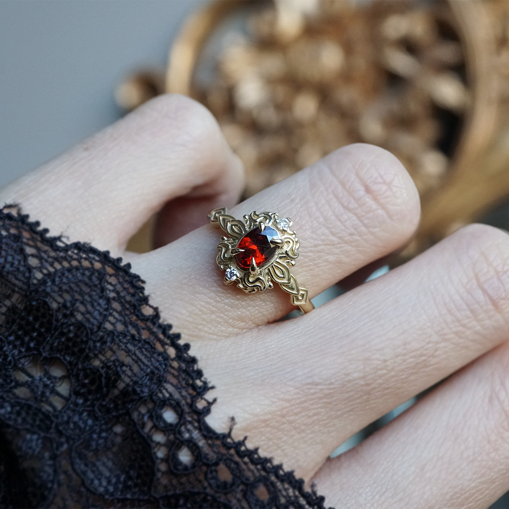 The Faith Spinel Scroll Ring captures the essence of timeless elegance and quiet strength. At its heart rests a vivid crimson spinel—nature’s own flame of beauty—set within intricate scrollwork that evokes the romantic artistry of vintage design. Each delicate curve tells a story of grace and devotion, transforming this piece into more than a ring—it’s a keepsake of enduring charm. Handcrafted with care in your choice of 14K or 18K yellow, rose, or white gold, the Faith Ring embodies the perfect harmony of heritage and modern refinement.