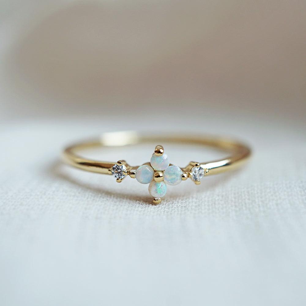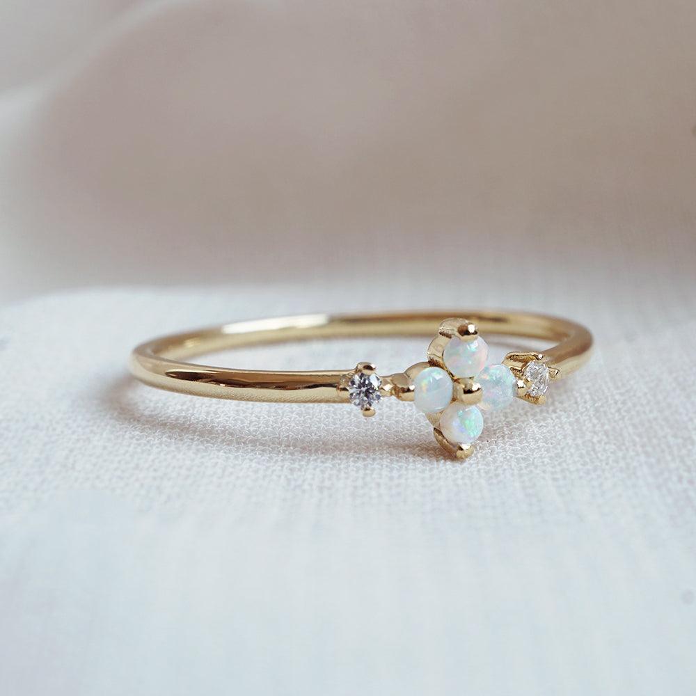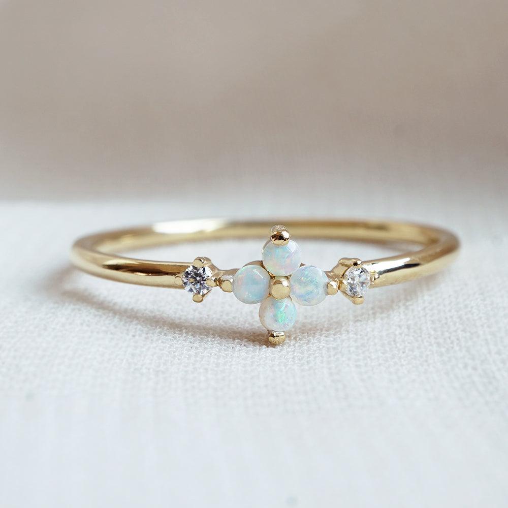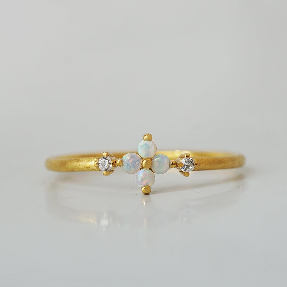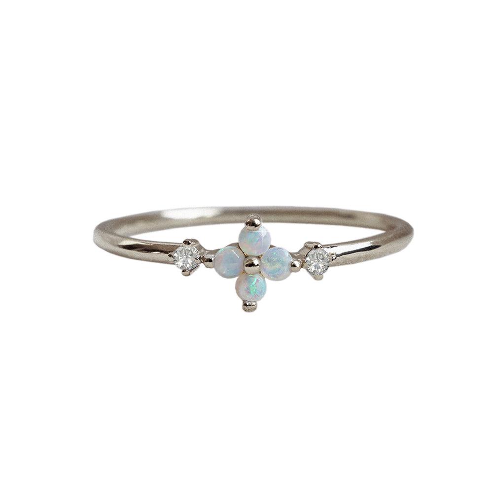 The Forget Me Not Opal Diamond Ring is a tender symbol of love and remembrance. Four natural Australian opals shimmer softly with hues of blue and gold, each one hugged between two natural white diamonds that glisten like morning dew.